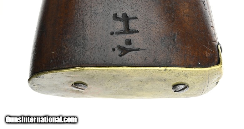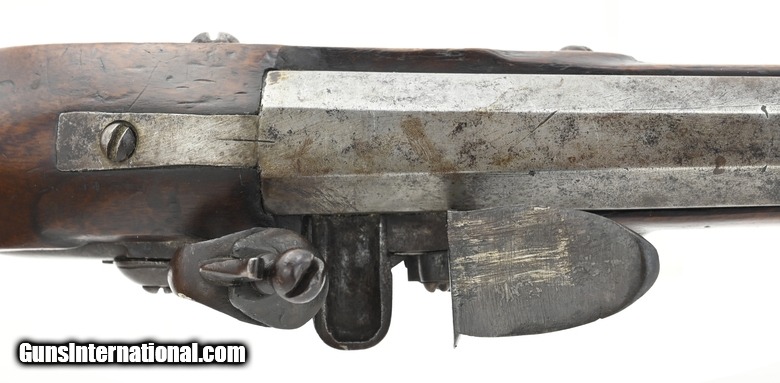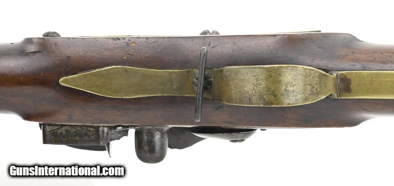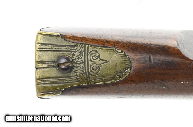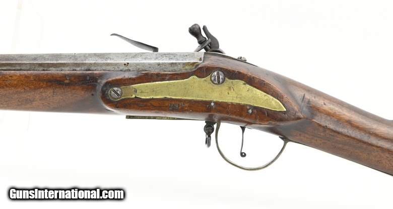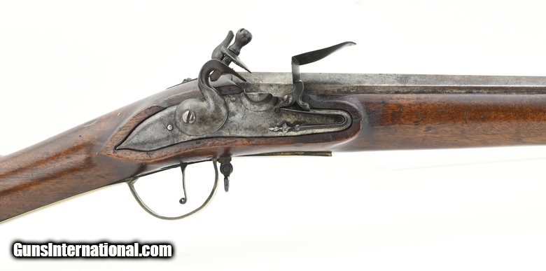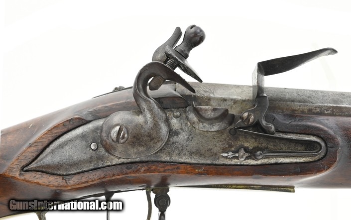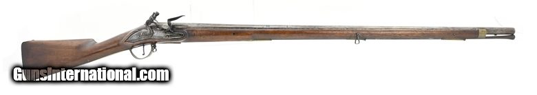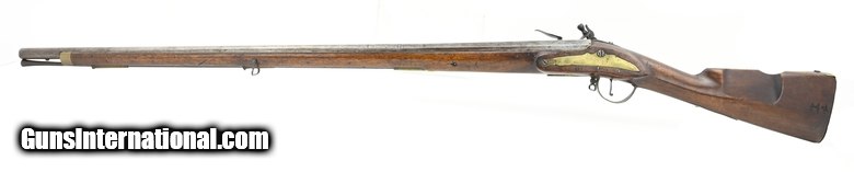 Description: "Dutch Flintlock Infantry Musket, Circa 1760. Overall all length is 54¾". The octagon to round barrel is 39½". The approximately .75 caliber smooth-bore barrel has a good bore. The barrel has two wedding bands, the first approximately 12½" forward of the breech, and the second at approximately 14½". Metal has a smooth gray brown patina. There are no marks in the lock or barrel. The brass furniture is good with the side plate screw having a crack ½" from the front screw. The stock is good with a small stress crack forward of the front side plate screw. Stock has initials (?) on the left side forward on the butt plate, a recessed cheekpiece, and “292" stamped below the left side plate. The swivels and ramrod are present. The action functions correctly. There is little to no erosion in the touchhole area. This is a much better than average example of an early Dutch musket. Don’t miss this one! $3750.00 SOLD Antique: Yes |