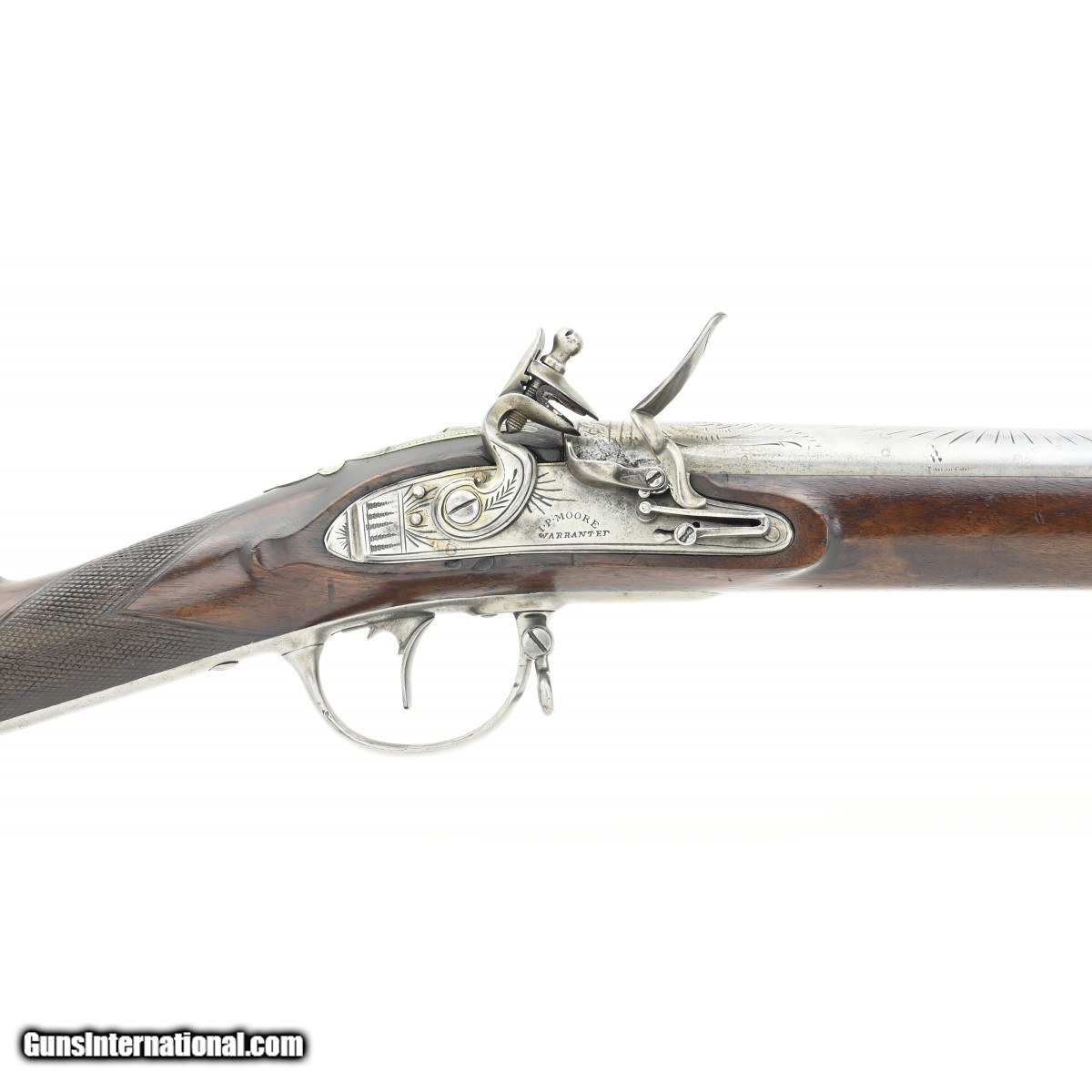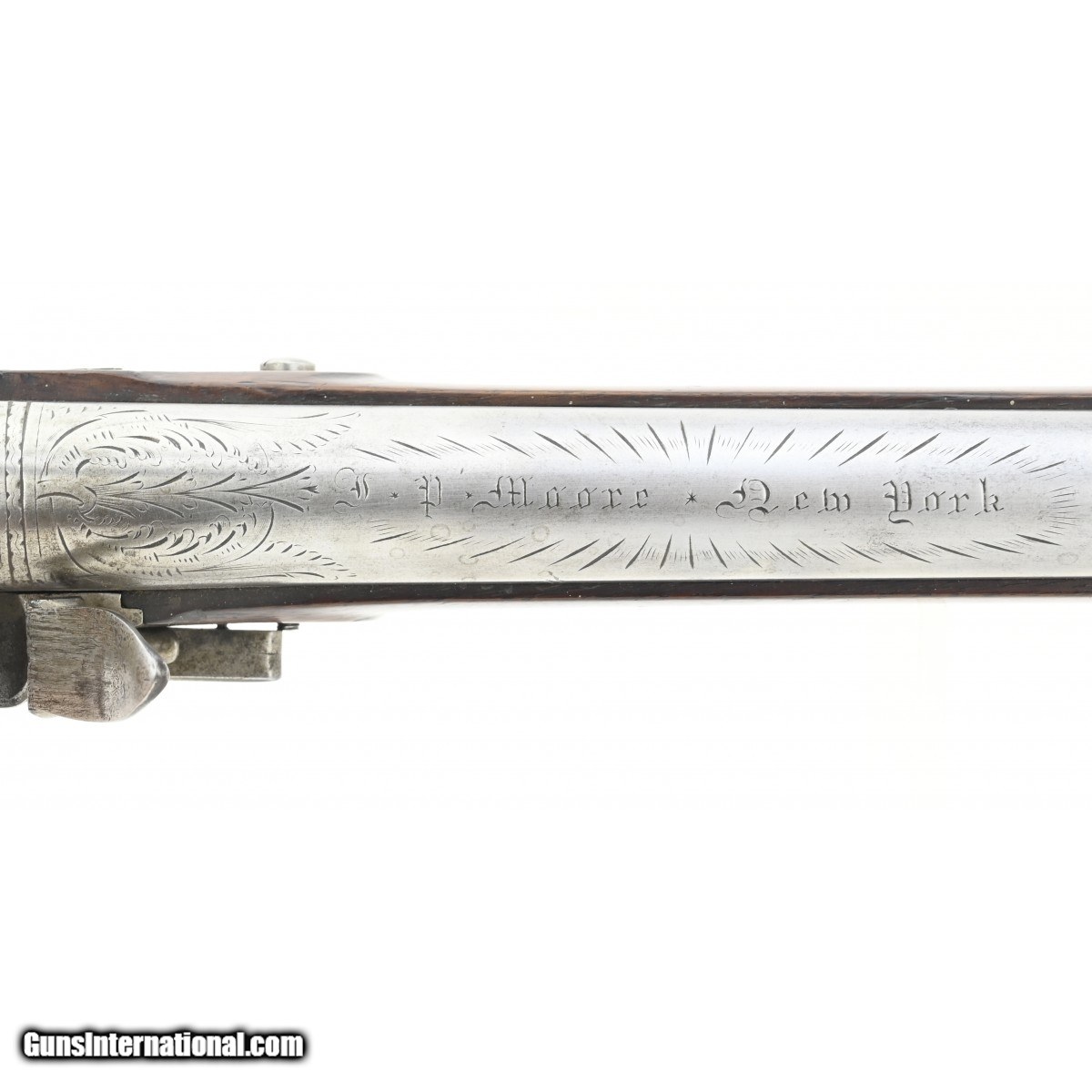 Description: "Eighth National Guard New York, Shooting Award Musket-Fowler, Awarded to David M. Moore. This musket-fowler was awarded to David M. Moore on 21 May 1832. It is 55" in overall length. The .69 caliber round barrel is 40" long. The smooth bore is fine. All metal is smooth and bright. Stock is fine with a checkered wrist. There are no cracks or chips. The lock, which has an “S" cock and roller frizzen is marked “I.P. Moore" in an arc over warranted. The lock and cock have decorative engraving. The barrel, bands, and breech plug tang have decorative engraving. In addition, the barrel is marked “J.P. Moore New York". J.P. Moore was a large New York firearms manufacturer and dealer. The breech plug tang is surrounded by a decorative engraved silver “U" shaped piece. The side plate is also silver and is nicely decorated. The very nicely decorated prize plate on the right butt stock features an eagle with a 5¾" wing span. The 3½" by ¾" inscription box below the eagle reads, “Officers of the Eighth National Guard [sid]/ to David M. Moore/ 21 May 1832". The action functions correctly. This is a very handsome shooting prize musket-fowler that would look great in any collection. SOLD |