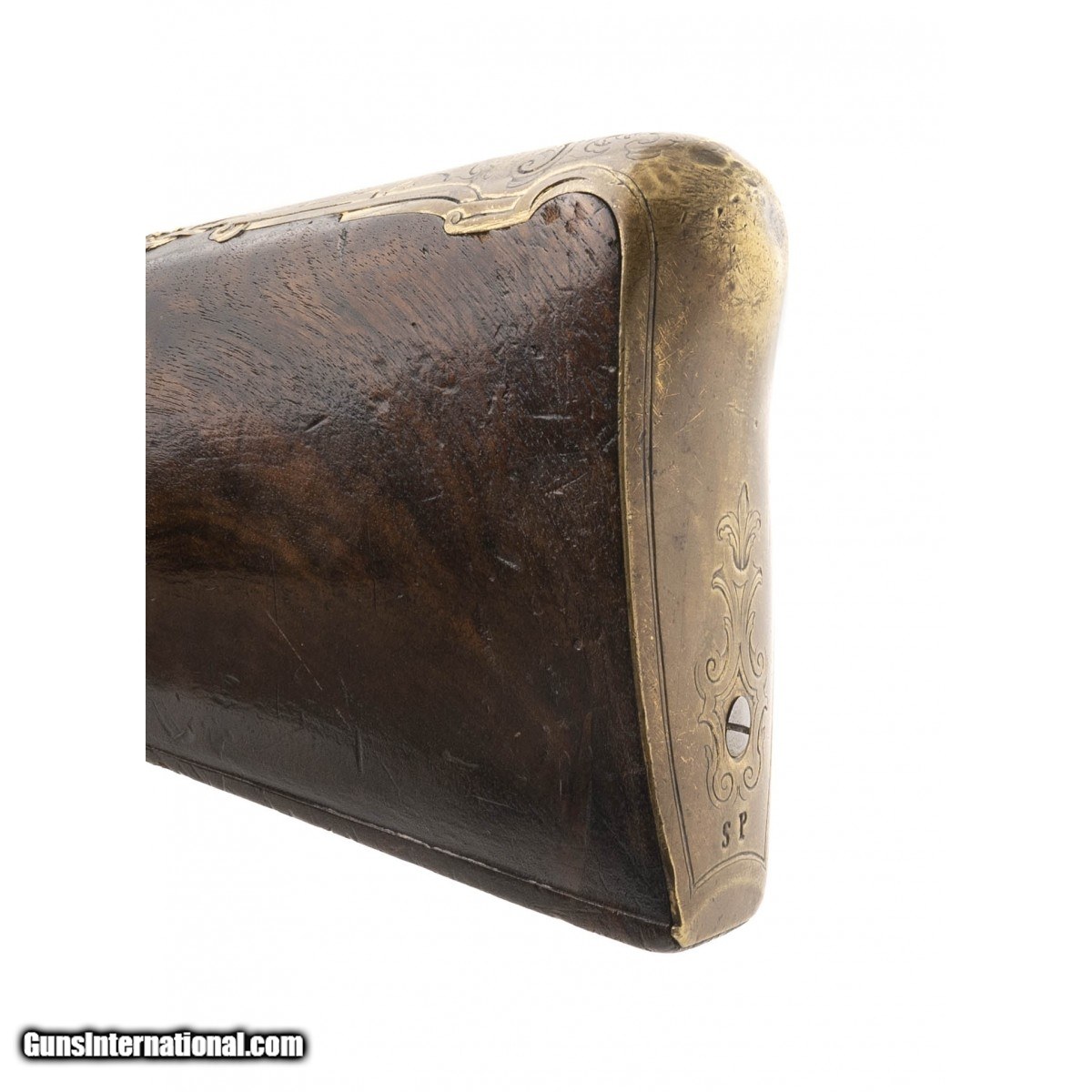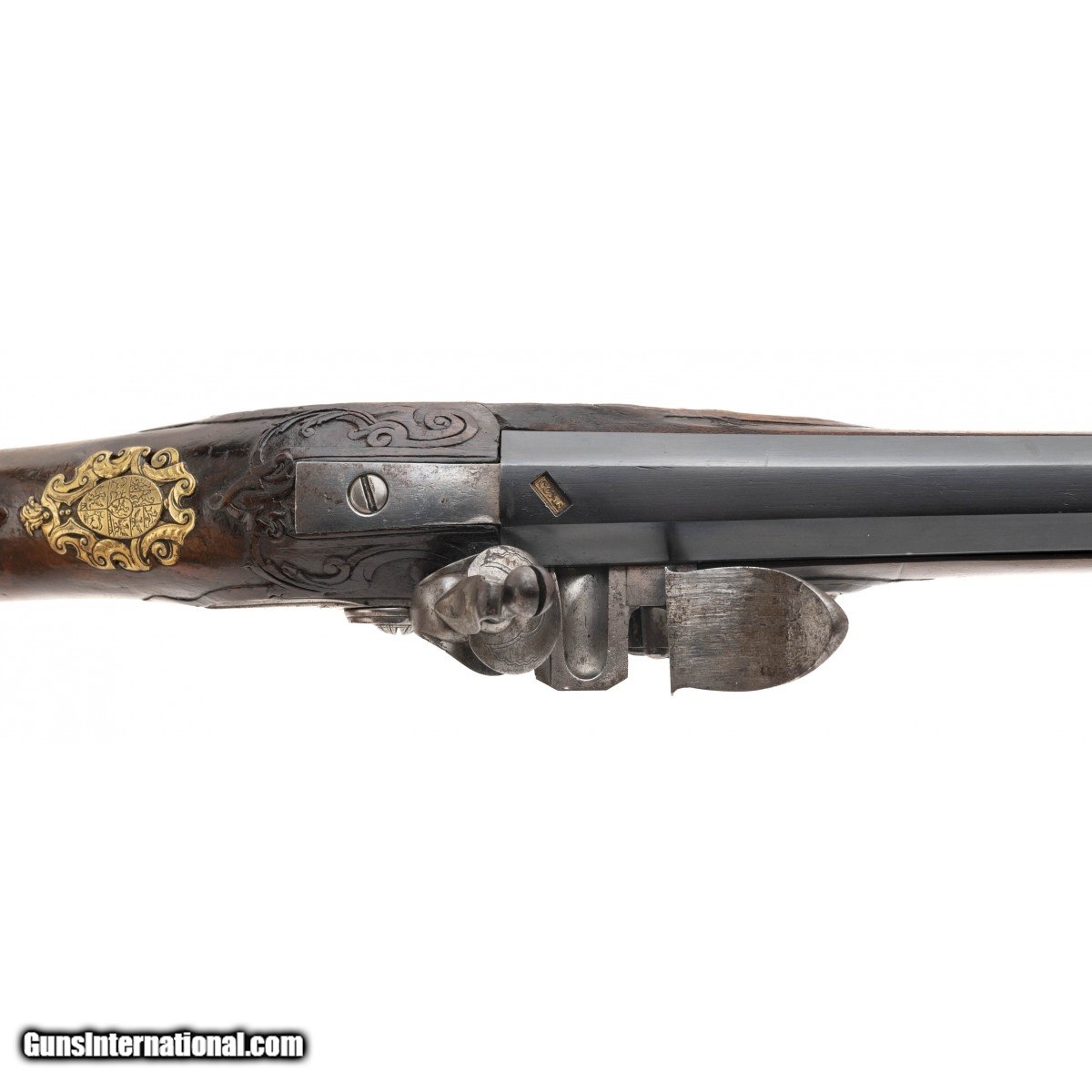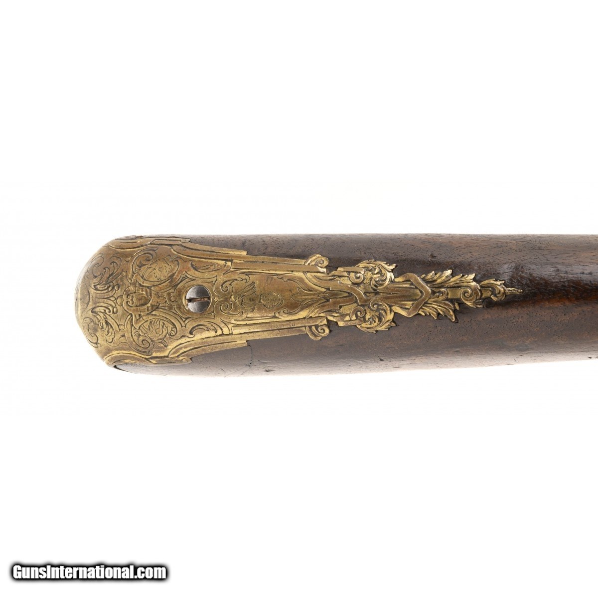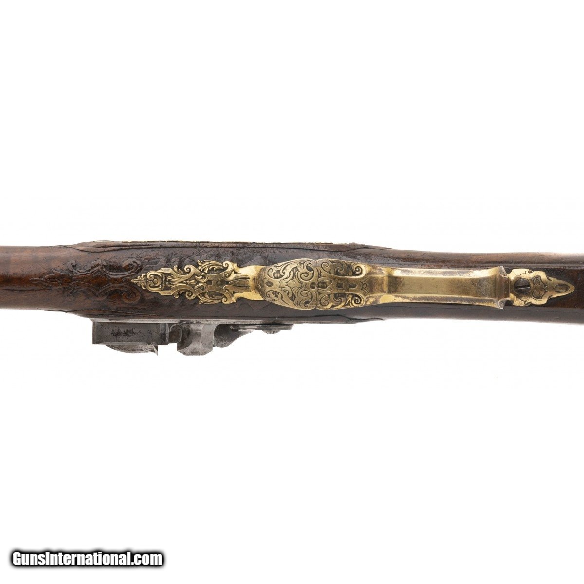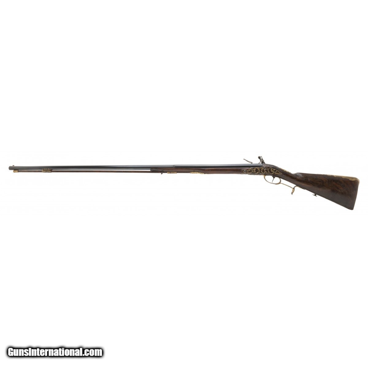 Description: " This fine flintlock fowler was manufactured by Caspar Zelner II of Vienna circa 1700 to 1740. He obviously learned the art of fine gun making from his father, Caspar Zelner I, who operated as a gunsmith in Salzburg circa 1680 to 1725. The overall length is approx. 59.5"". The approx. 44.5"" octagon to round 62 caliber barrel has a very fine smooth bore. The barrel has approx. 98% period blue. There is a gold sink which is probably the barrel maker's on top of the chamber. The barrel has a spider front sight and wedding band at the octagon to round transition. The finely engraved lock is bright. It is marked CASPAR ZELNER in and arc below the faceted iron pan and IN WIENN in an arc behind the cock. The lock engraving features a hunter on horseback followed by a dog in the center and a stag being chased by a dog on the tail. The cock has decorative scroll engraving. The brass trigger guard bow and front tang are have deep scroll carving. The brass buttplate tang is also nicely carved and engraved. The brass wrist escutcheon has a royal coat of arms in the center. The pierced scrollwork brass sideplate is very well executed. The carved half stock is fine. It has edge lines along the ramrod channel, carving and edge lines along the trigger guard, carving around the barrel tang, and decorative lines at the forward part of the comb. The action functions correctly. It's unusual to find an early fowler with its original full length barrel as most were shortened during their period of use. This could very well be a castle gun used for royal hunts. This fine piece is ready for your European flintlock hunting or castle gun collection. SOLD Antique: Yes |