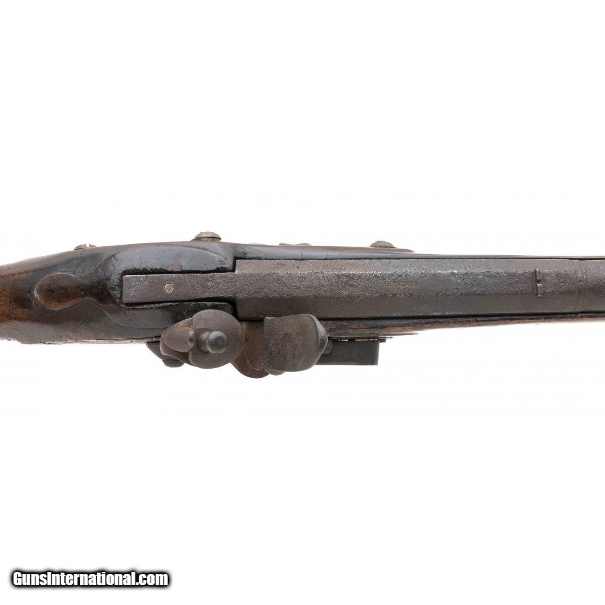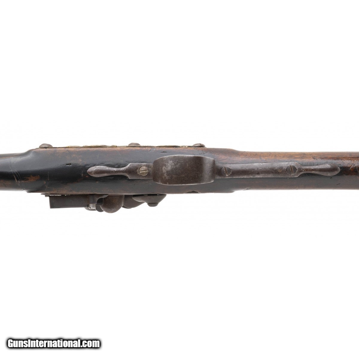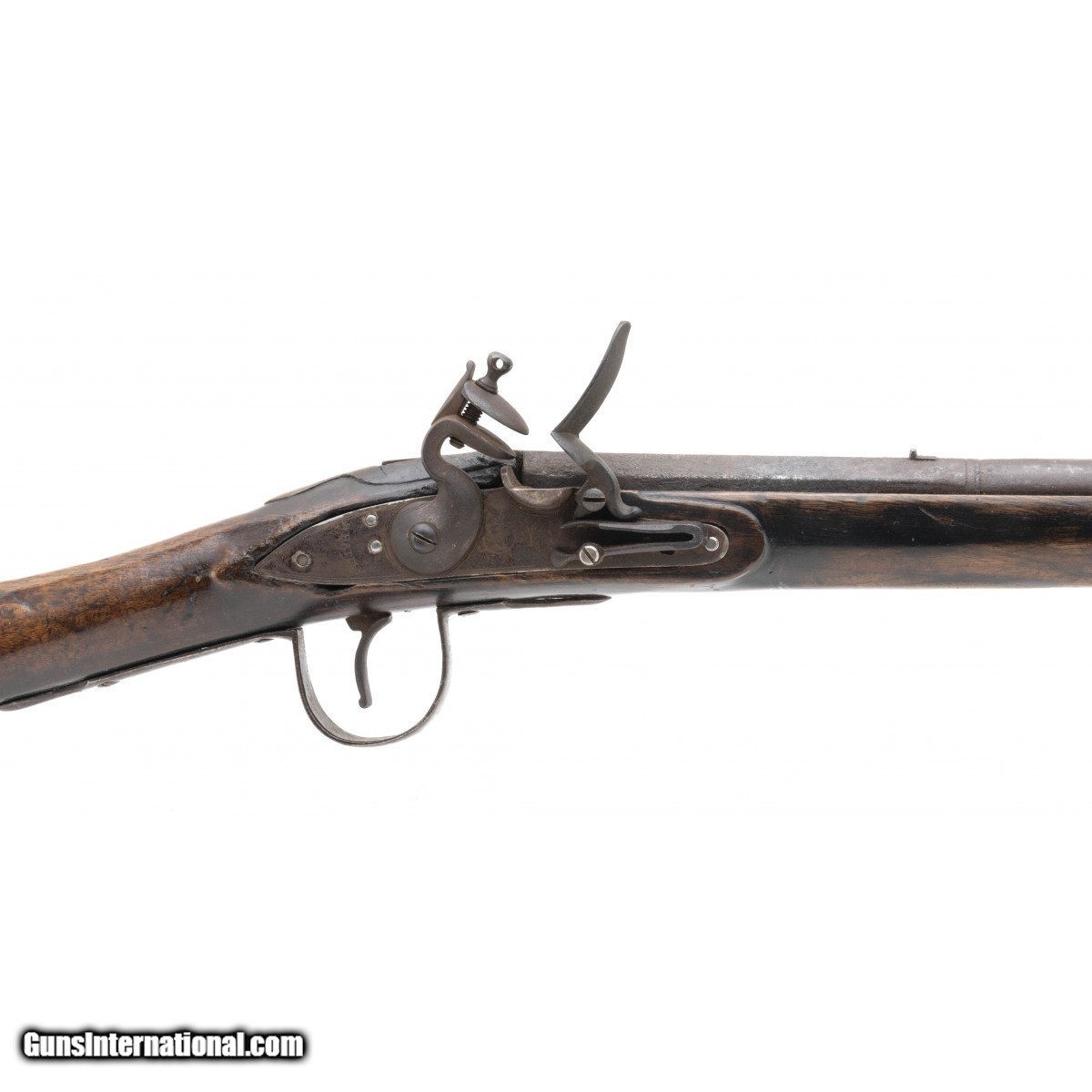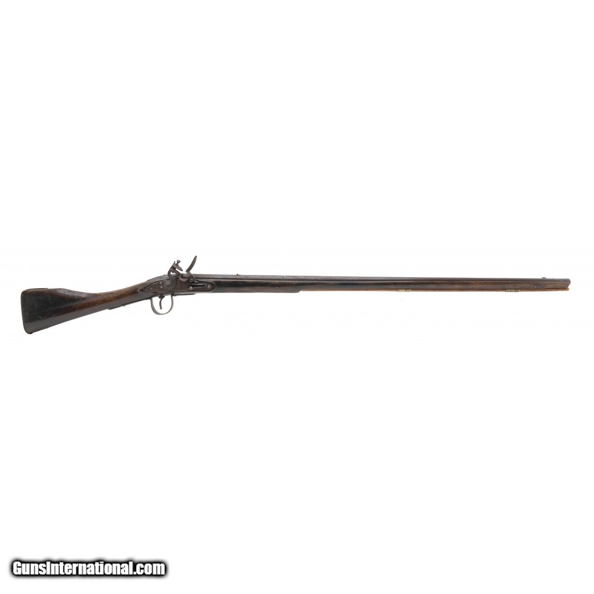 .60 caliber 36.5"" octagonal to round barrel reconverted Board of Ordnance trade gun by Whately. Metal is a dark brown patina with scattered surface oxidation visible, circle fox is stamped on the barrel and lock plate with a faint broad arrow noted on the breech. Wood shows usage and handling wear. This looks to be one of the 1580 guns made during the War of 1812. Action functions correctly.