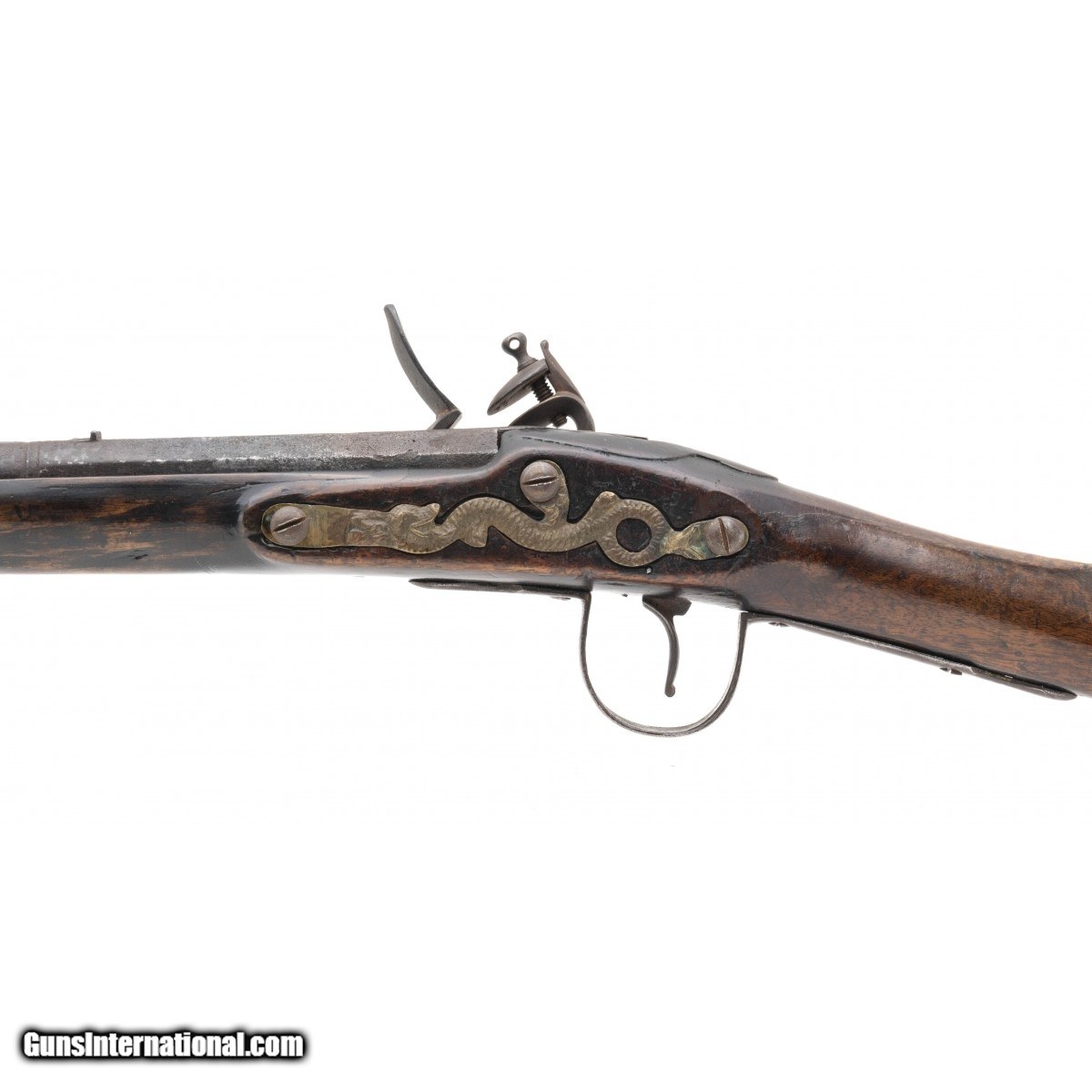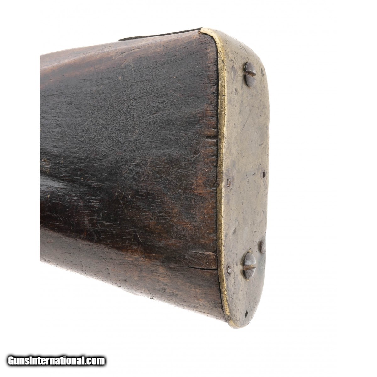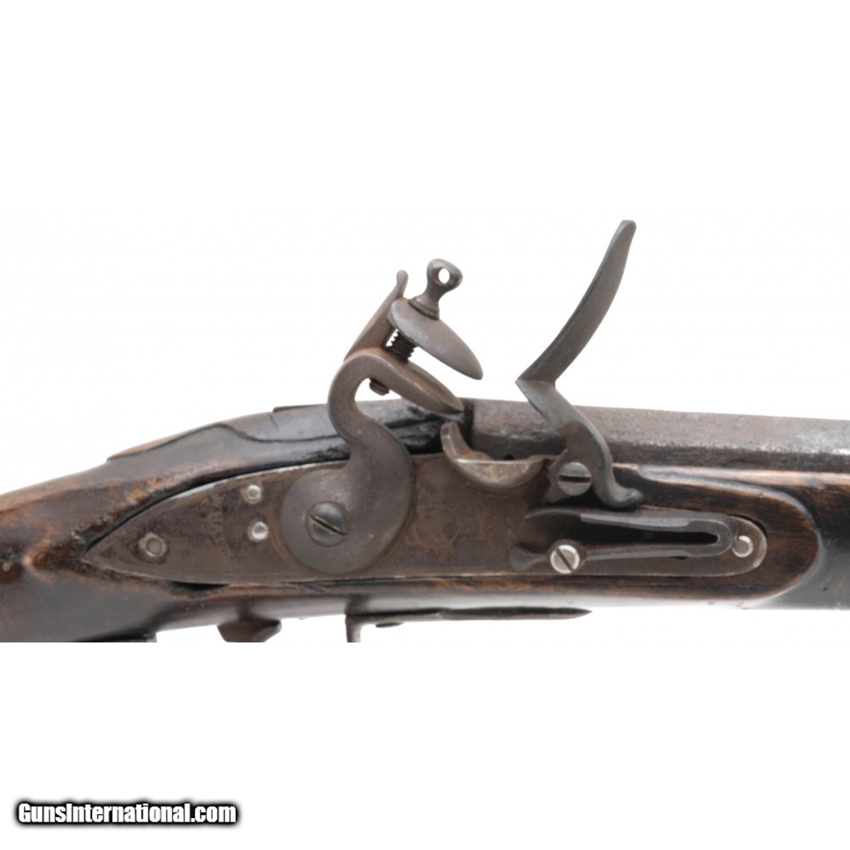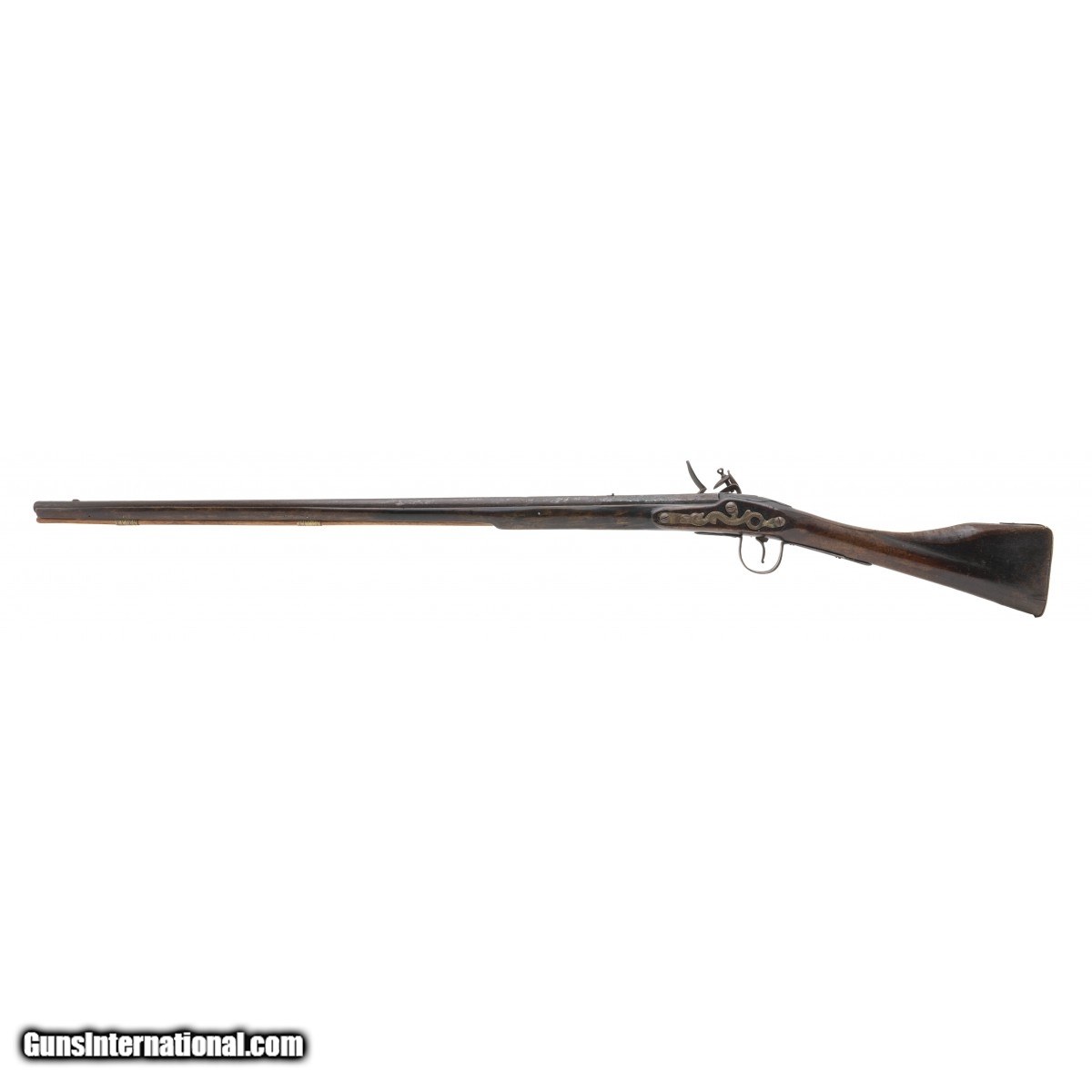 .60 caliber 36.5"" octagonal to round barrel reconverted Board of Ordnance trade gun by Whately. Metal is a dark brown patina with scattered surface oxidation visible, circle fox is stamped on the barrel and lock plate with a faint broad arrow noted on the breech. Wood shows usage and handling wear. This looks to be one of the 1580 guns made during the War of 1812. Action functions correctly.