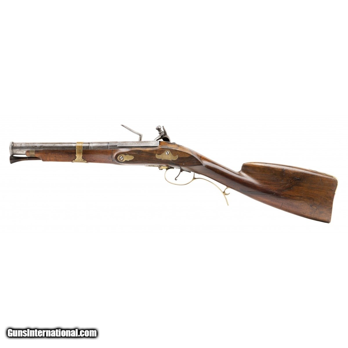 French smooth bore, coach gun with a 12"" two-stage smoothbore barrel, made circa 1750. Bore diameter is 1.8 inches. There is a makers mark ""GM"" between the frizzen spring. The mounts and trigger guard are brass. The foreend is a old replacement. The ramrod is original. Has a horntip and a jag for extracting. Most coach guns are English and this French model is uncommon. Action works correctly. Overall very good condition.