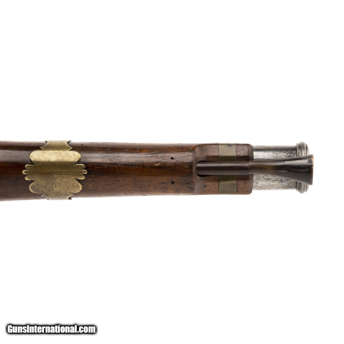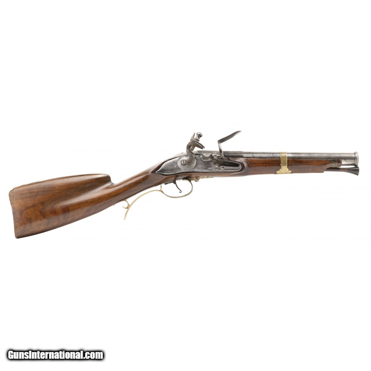Description: " French smooth bore, coach gun with a 12"" two-stage smoothbore barrel, made circa 1750. Bore diameter is 1.8 inches. There is a makers mark ""GM"" between the frizzen spring. The mounts and trigger guard are brass. The foreend is a old replacement. The ramrod is original. Has a horntip and a jag for extracting. Most coach guns are English and this French model is uncommon. Action works correctly. Overall very good condition. SOLD |