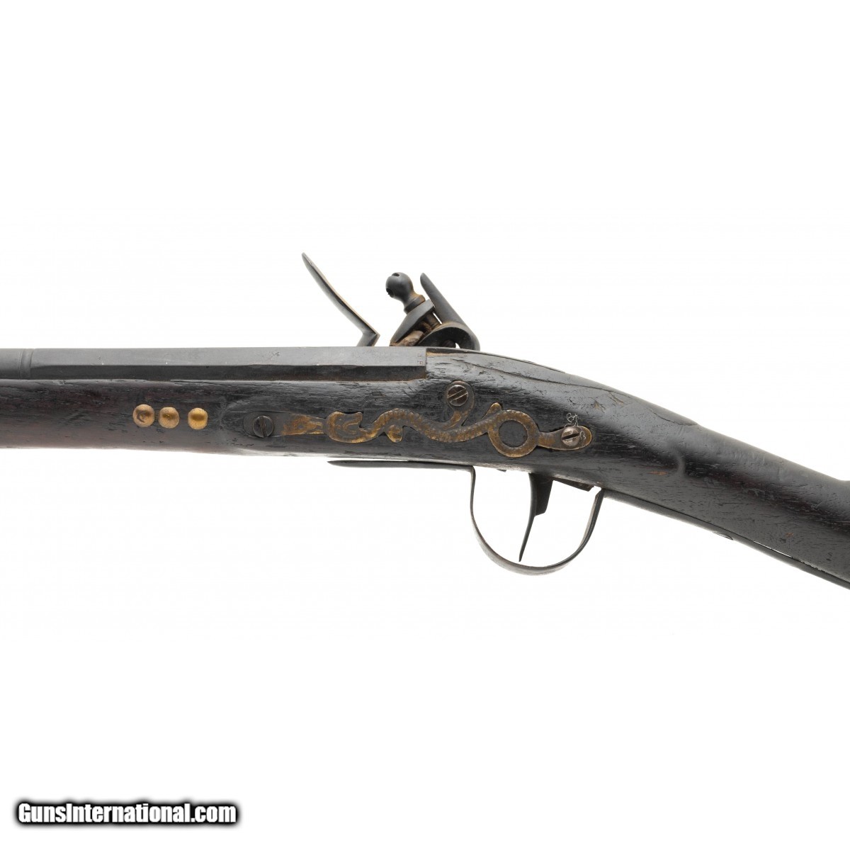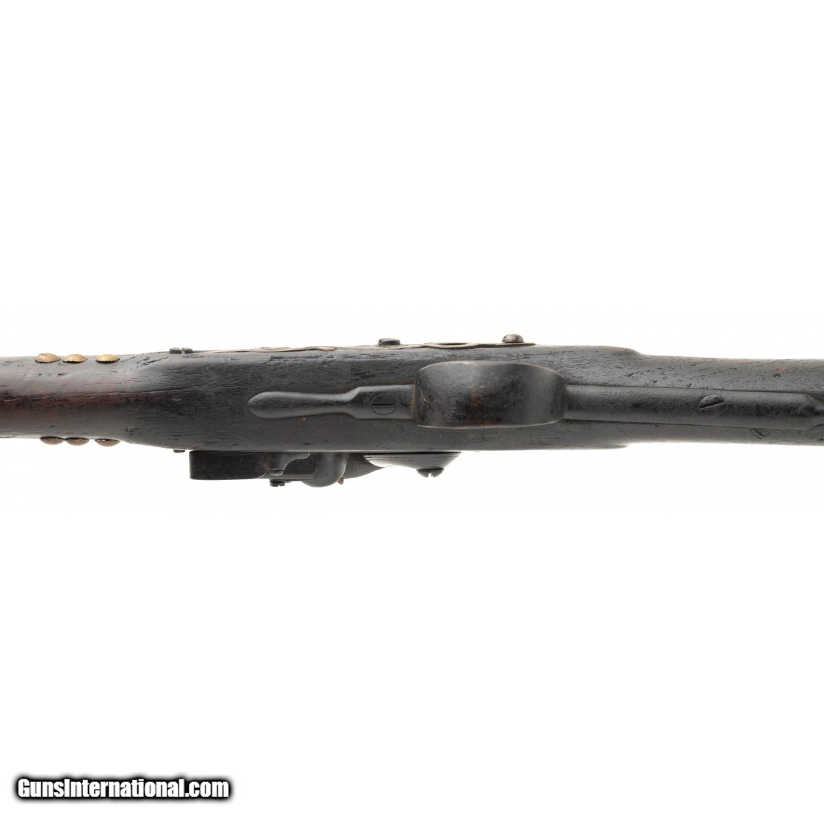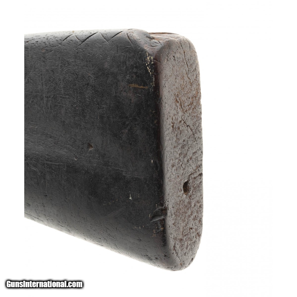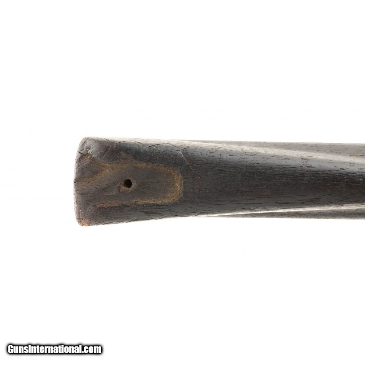Description: "Made 1860s. 70 caliber with a 29 ½" barrel. This gun is in Flintlock configuration despite being made later than the traditional flintlock period. This is a real deal Indian trade musket that has all the signs of Indian use. The metal is untouched and in “attic condition with a dark brown patina. Wood shows heavy use. The stock has been decorated with brass tacks. The butt plate is missing which was common on Indian guns as they used the butt plates for hide scrapers. This gun has the typical enlarged trigger guard and serpentine side plate of trade muskets. Both the lock and barrel has the H. E. Leman markings. Very neat Indian used trade musket! SOLD |