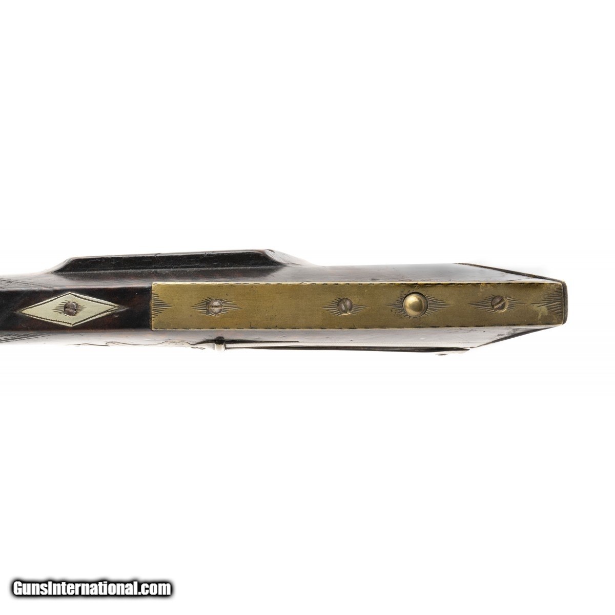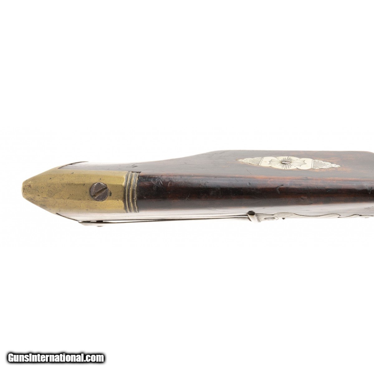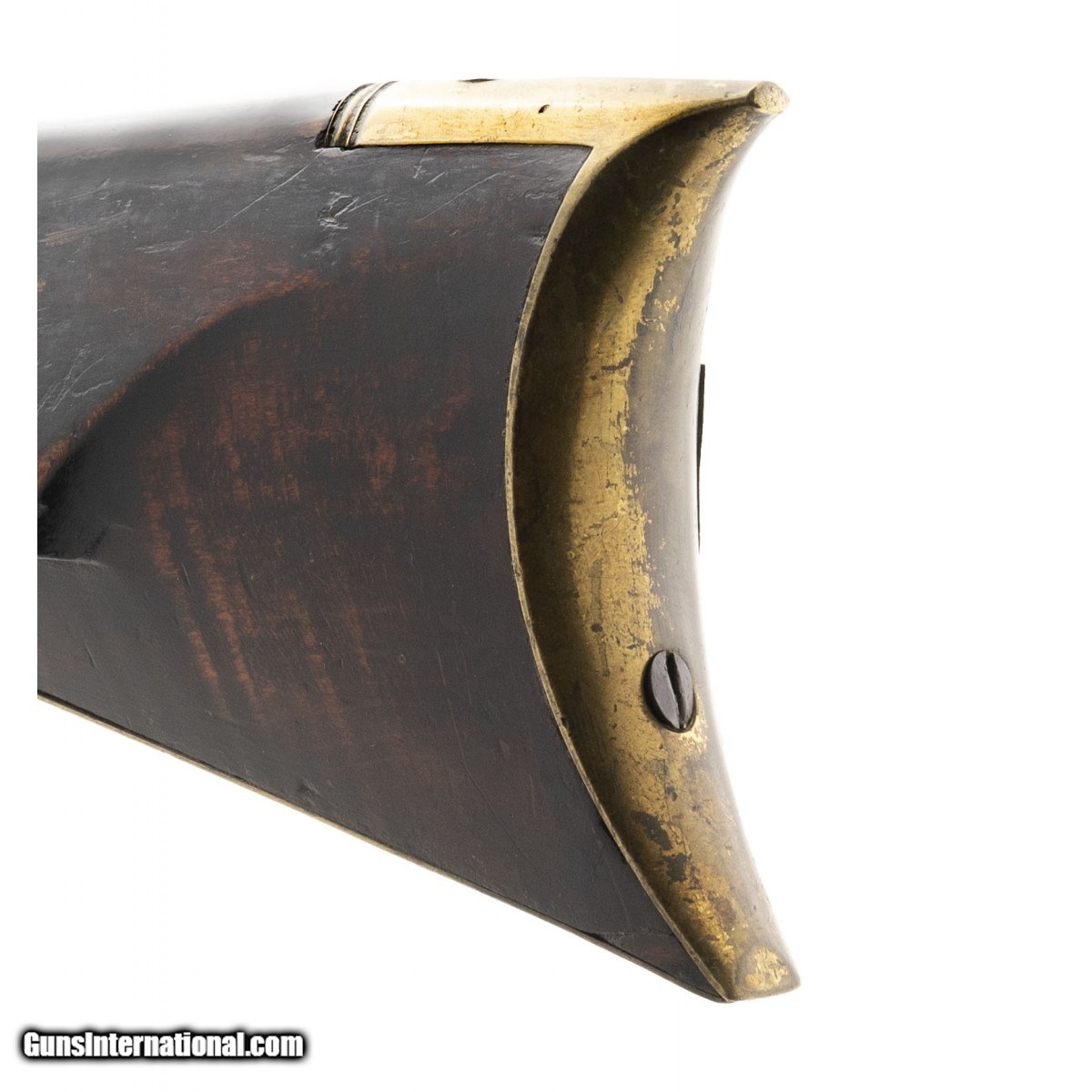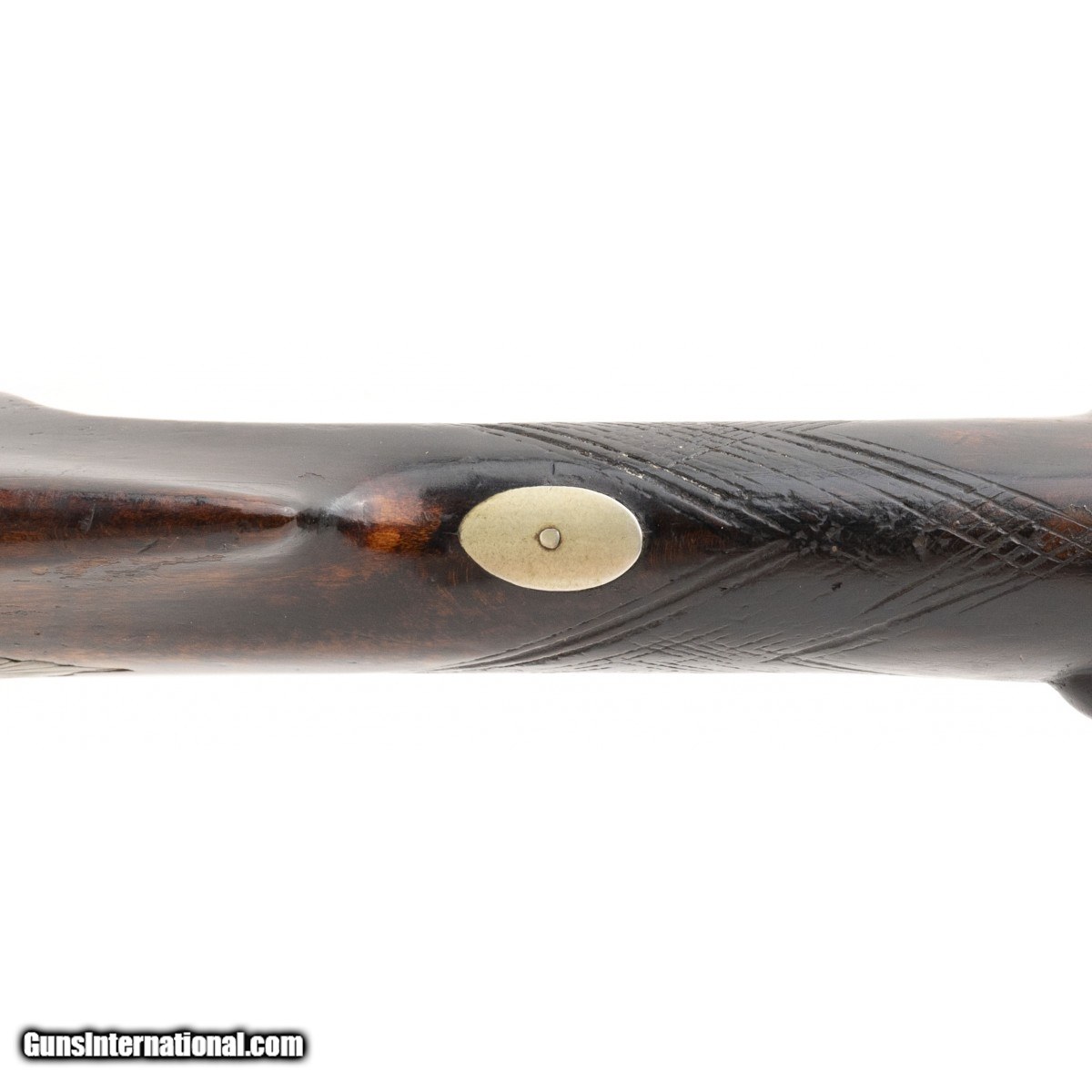 Description: "Circa 1820s. Approximately 58 caliber smooth bore with a 41" barrel. Gun is 57" overall length. This gun has been reconverted back to flintlock. Metal has a half octagon half round barrel with a dark brown patina. Wood is very good as repaired and forearm relengthend. Wrist has worn cross hatch checkering. Stock has a nice patch box with a button release on the underside. Left hand side of the stock has a cheek piece with a engraved German silver inlay. Very nice example of a Kentucky style fowler! SOLD Curio/Relic: Yes Antique: Yes |