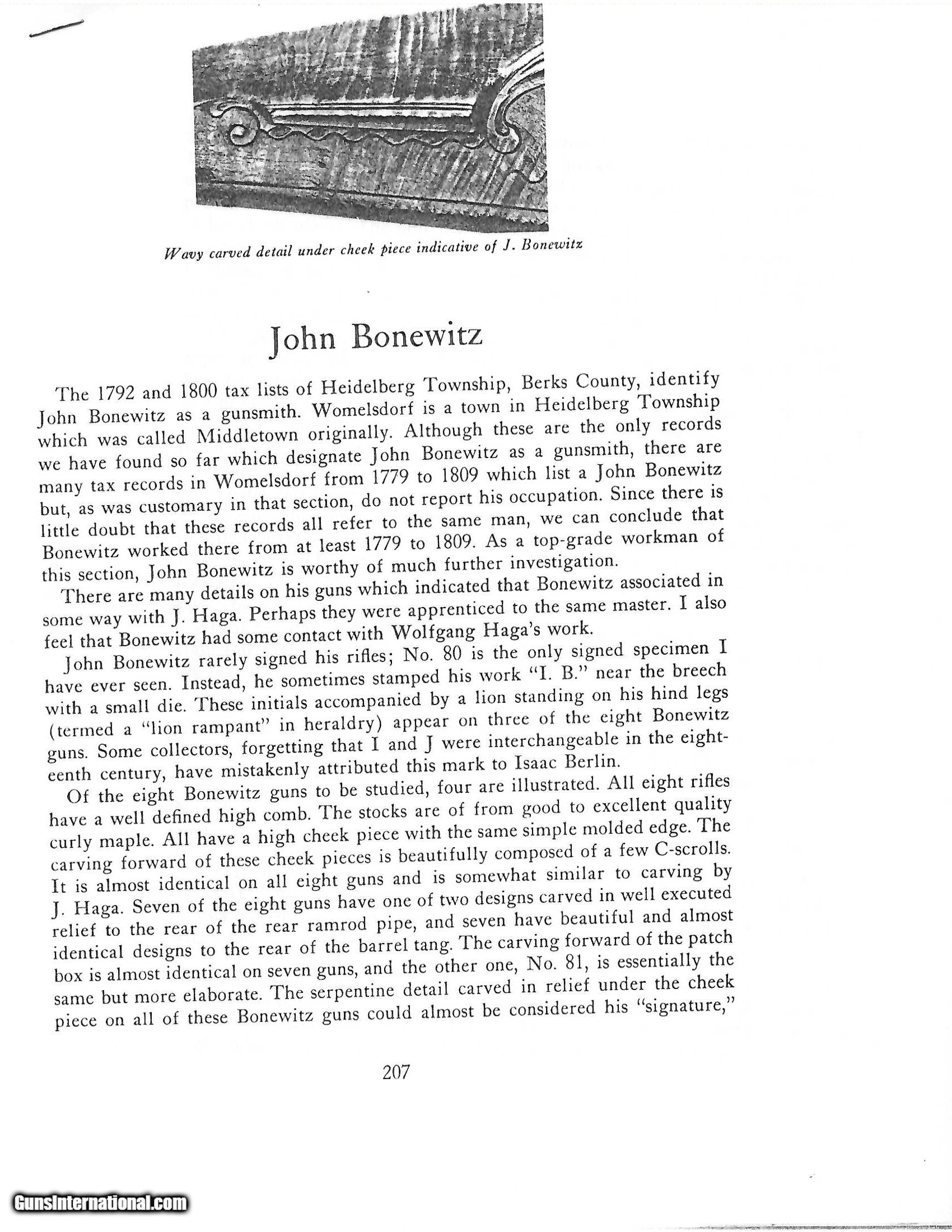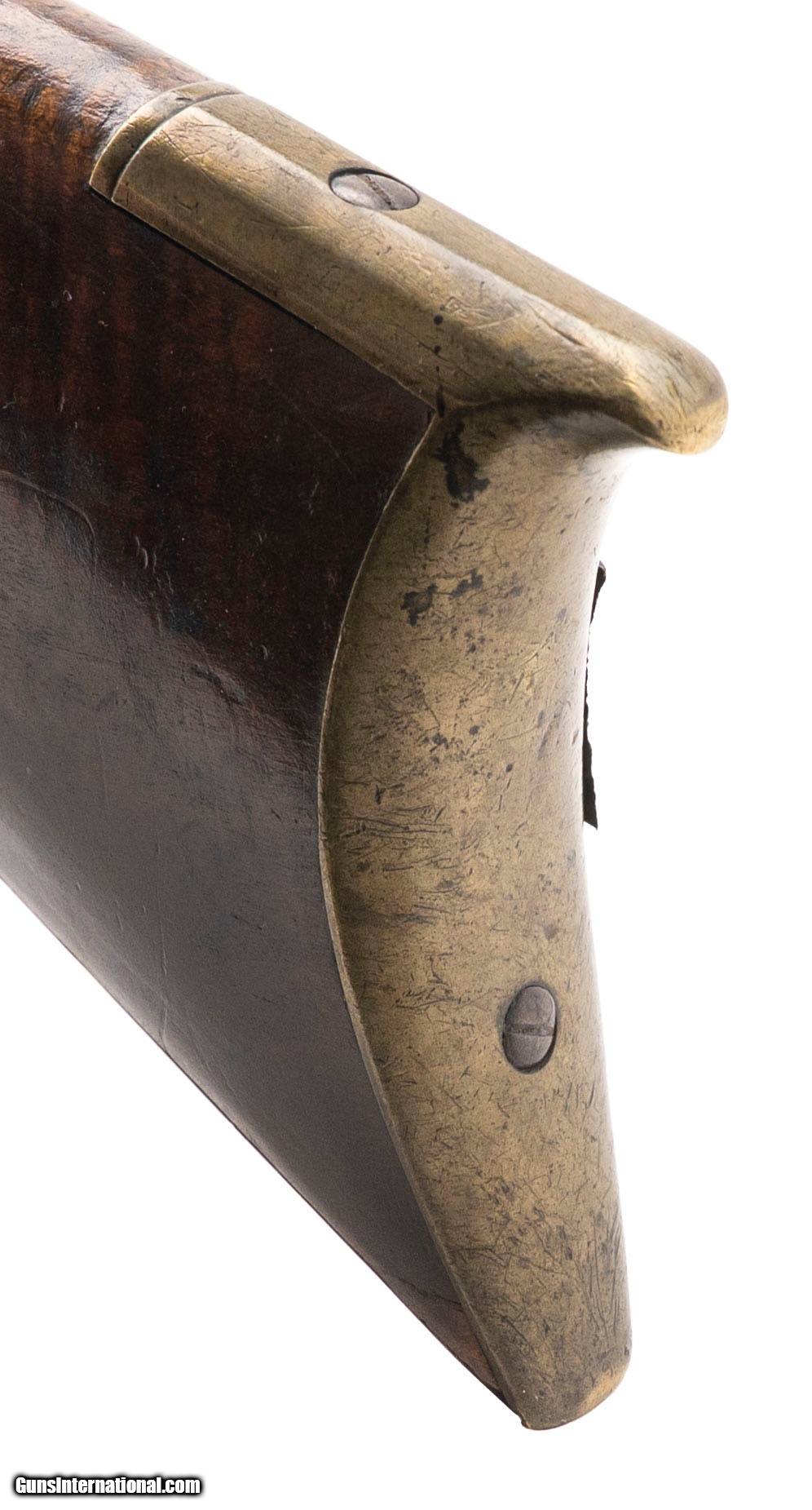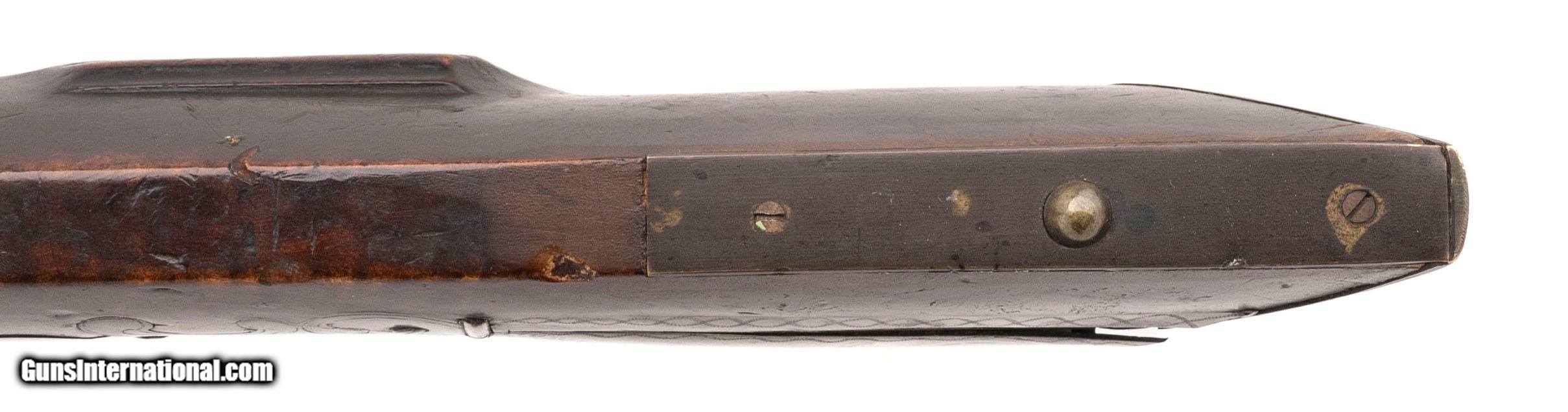 Description: "Made circa 1800. 52 Caliber bore with a 45" barrel. This is gun is attributed to John Bonewitz by the very distinctive patch box. This is a massive Bench rifle weighing 16 pounds. The barrel has a dark brown to plum colored patina. The lock is marked “TRYON / Warranted" The stock is of curly maple and is in excellent condition overall. There was a break at the wrist and it has been repaired during period of use with iron strips in four places along the wrist. Very fine Unusually Large Kentucky Rifle. Accompanying this gun is a folder of research. This gun came out of the Tom Seymor collection. CONSIGNMENT Antique: Yes Price: $9,500.00 Contact Seller |