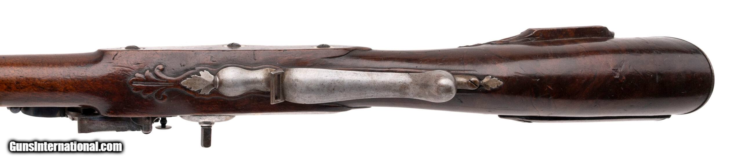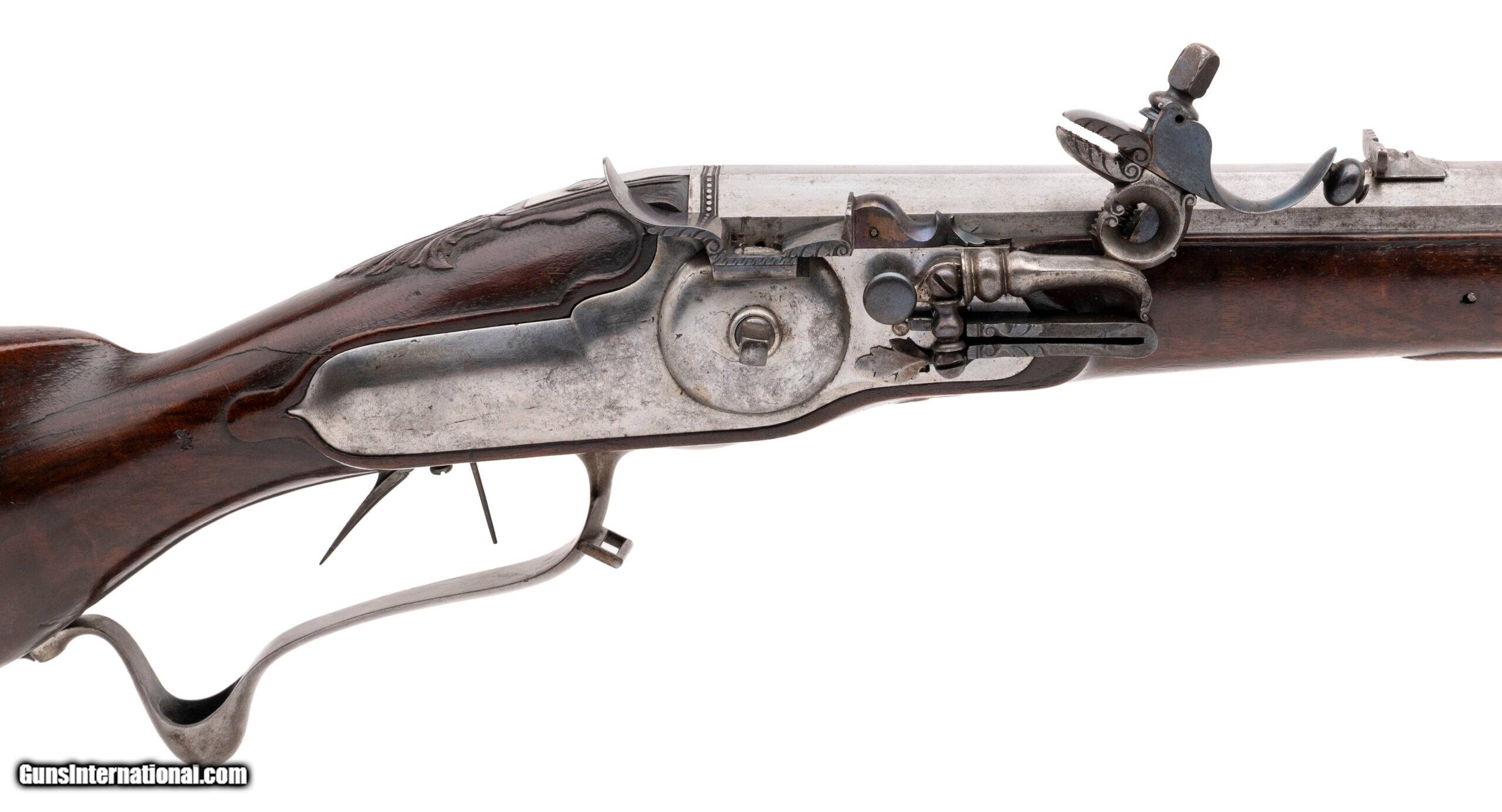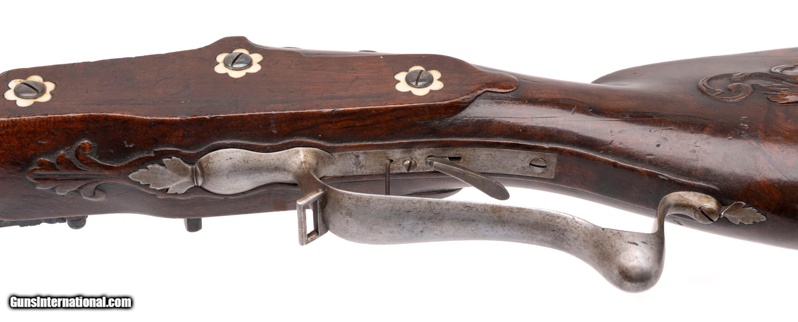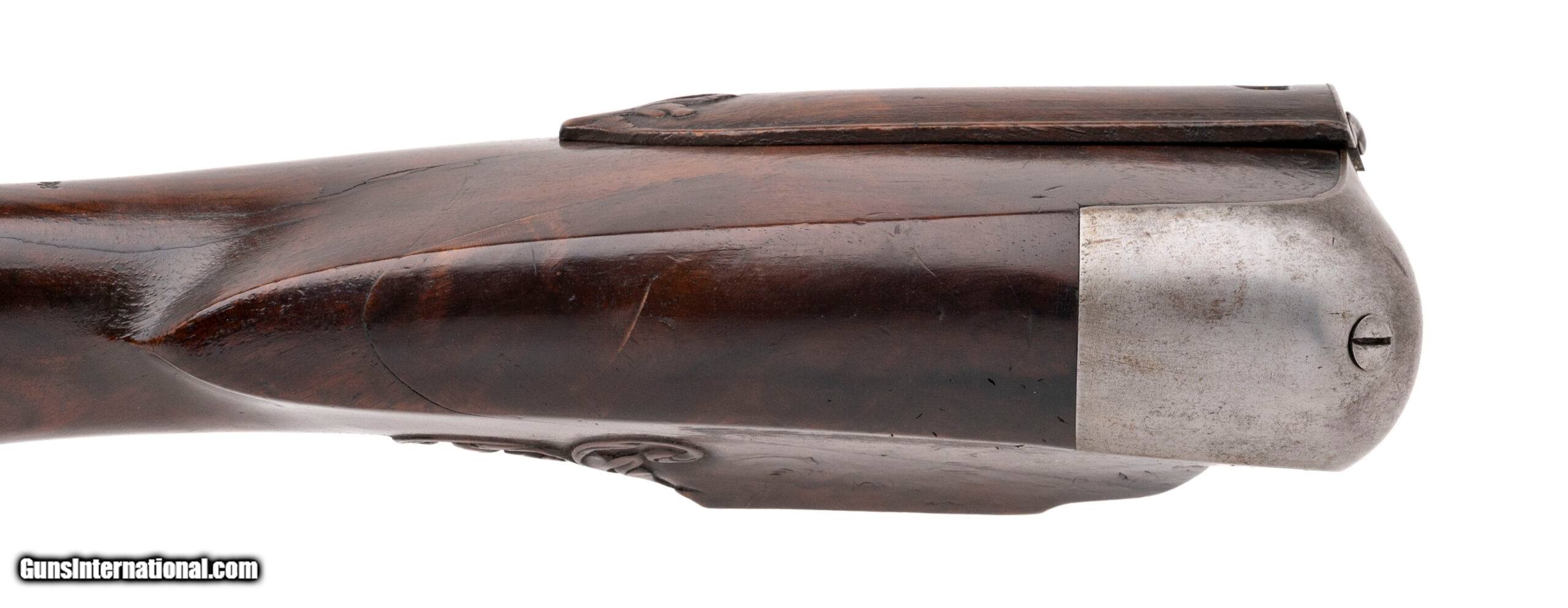 Description: "NSN. Made circa 1660-1670. 57.5 caliber with a 26" barrel. This is a very fine example of a Dutch or German military Wheellock carbine. While it is military, there are still embellishments such as the bone tips on the forearm and ram rod tip as well as the screw collars opposite of the lock plate. The stock also has relief carved scrolls near the cheek piece and near the upper tang. This is a very sharp gun in the white. There is a repair from near the comb to midway through the butt of the stock. It is almost indetectable. Engraved on the butt plate is “No 37" indicating a military gun and this is the rack number. This is a later gun being made around 1660. At this period, the stock design and shortness of the barrel as well as a swamped muzzle give this a Jaeger Rifle appearance. Very Fine unique Dutch Wheellock Military Carbine! Antique: Yes Price: $12,500.00 Contact Seller |