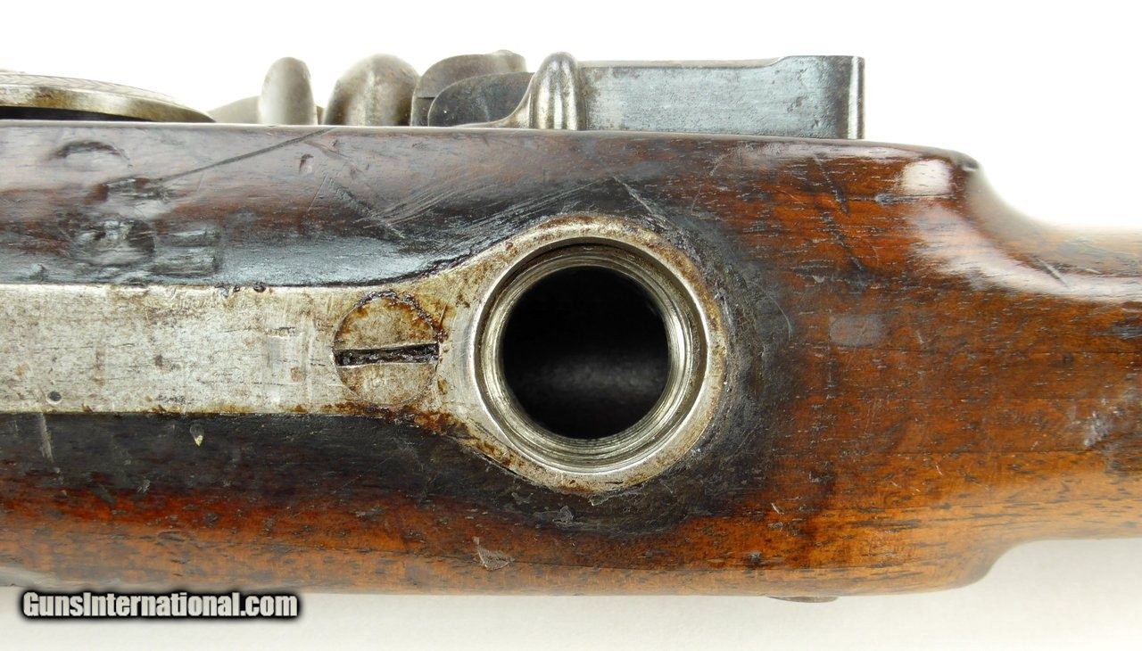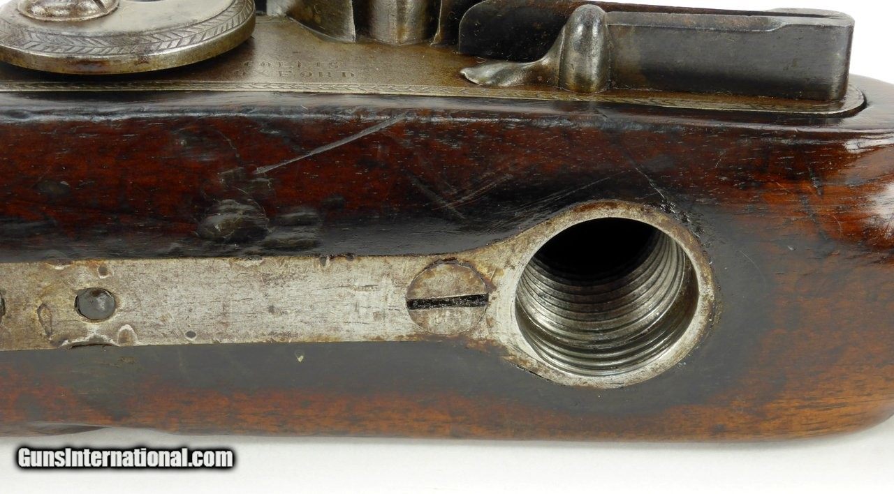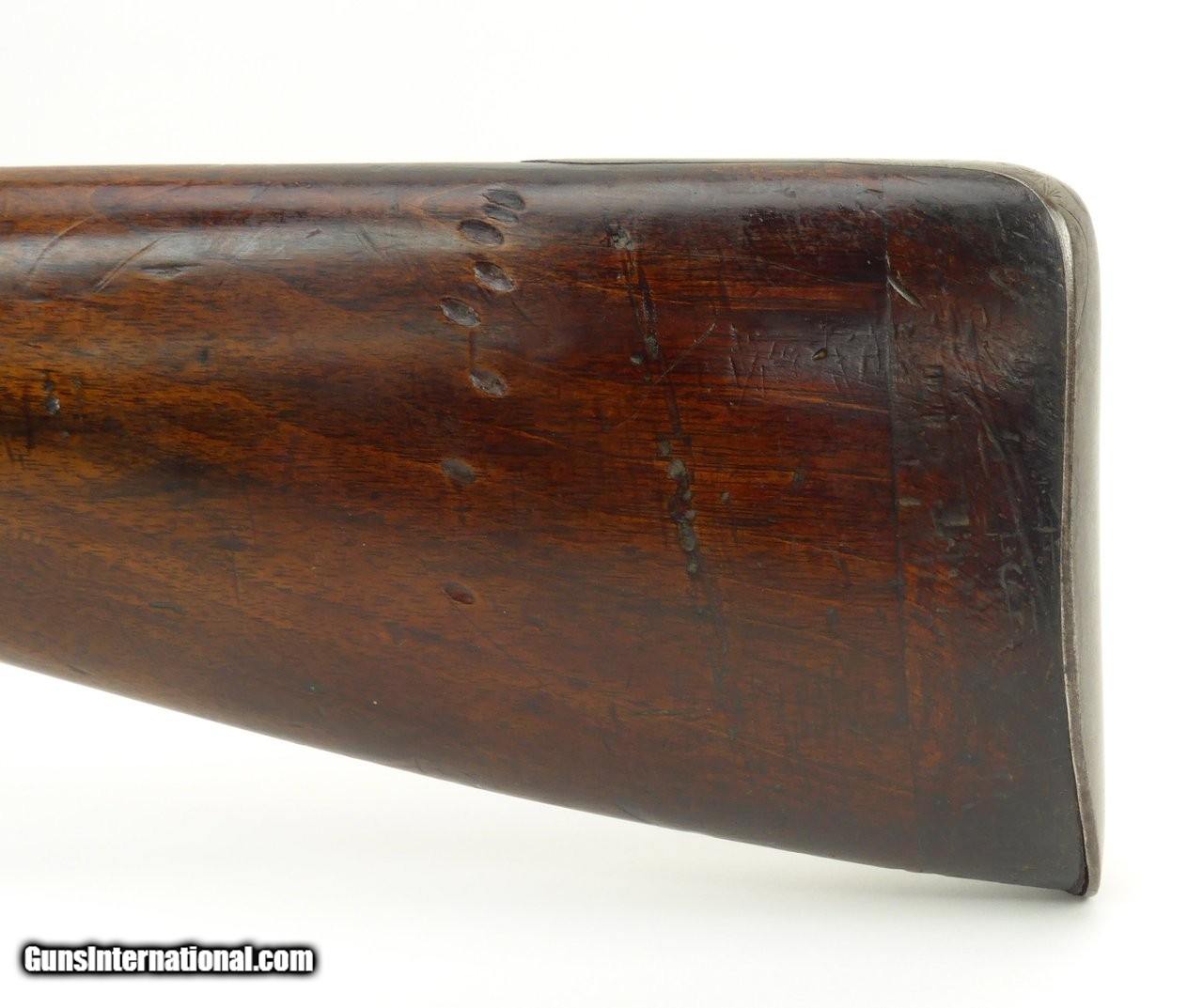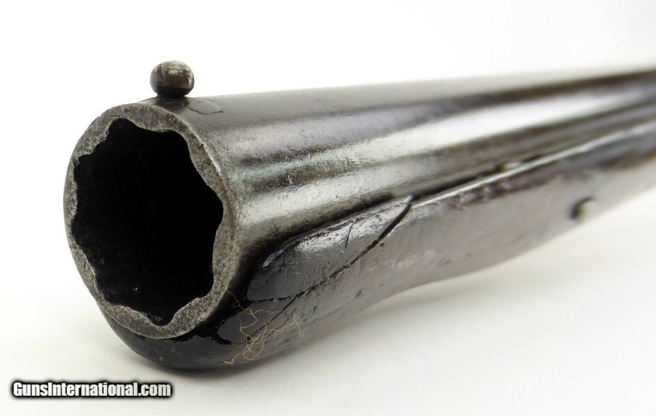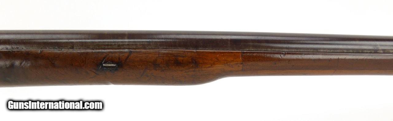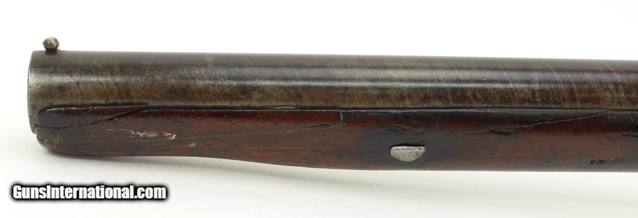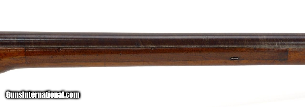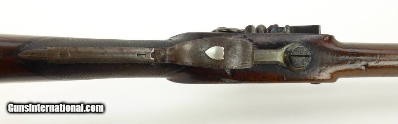 Description: "Rare English Breech Loading Rifle by Collis of Oxford. (Marked on lock) mechanism is similar to the Ferguson system but does not load from the top. Trigger guard unscrews completely to reveal the loading chamber which may be loaded with a ball and then with a powder load or possibly a ball with powder load as a single unit? Barrel length is 36" and overall length is 52". Barrel retains 90% plus finish. The stock was lengthened long ago (LOP is 14½") and does not detract from the appearance of the rifle. Forend wood has an old repairs on the right side of the forend. Gun overall is in good plus condition. Metal parts rate very good. Rare Flintlock Breech Loader (DALLAS LOCATION) Antique: Yes Price: $9,750.00 Contact Seller |