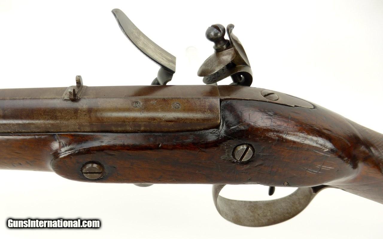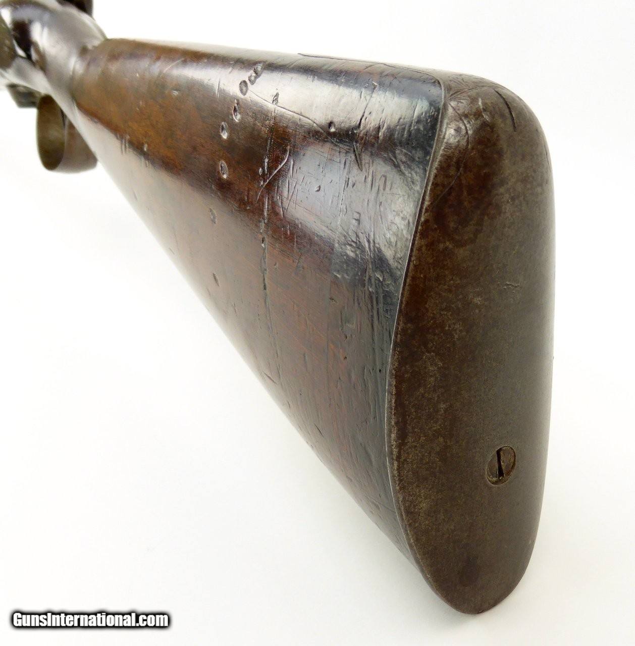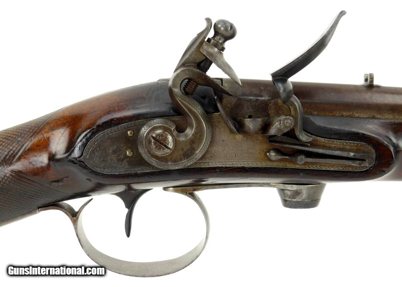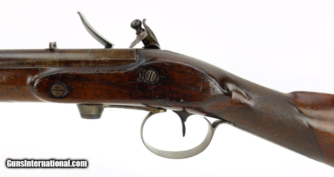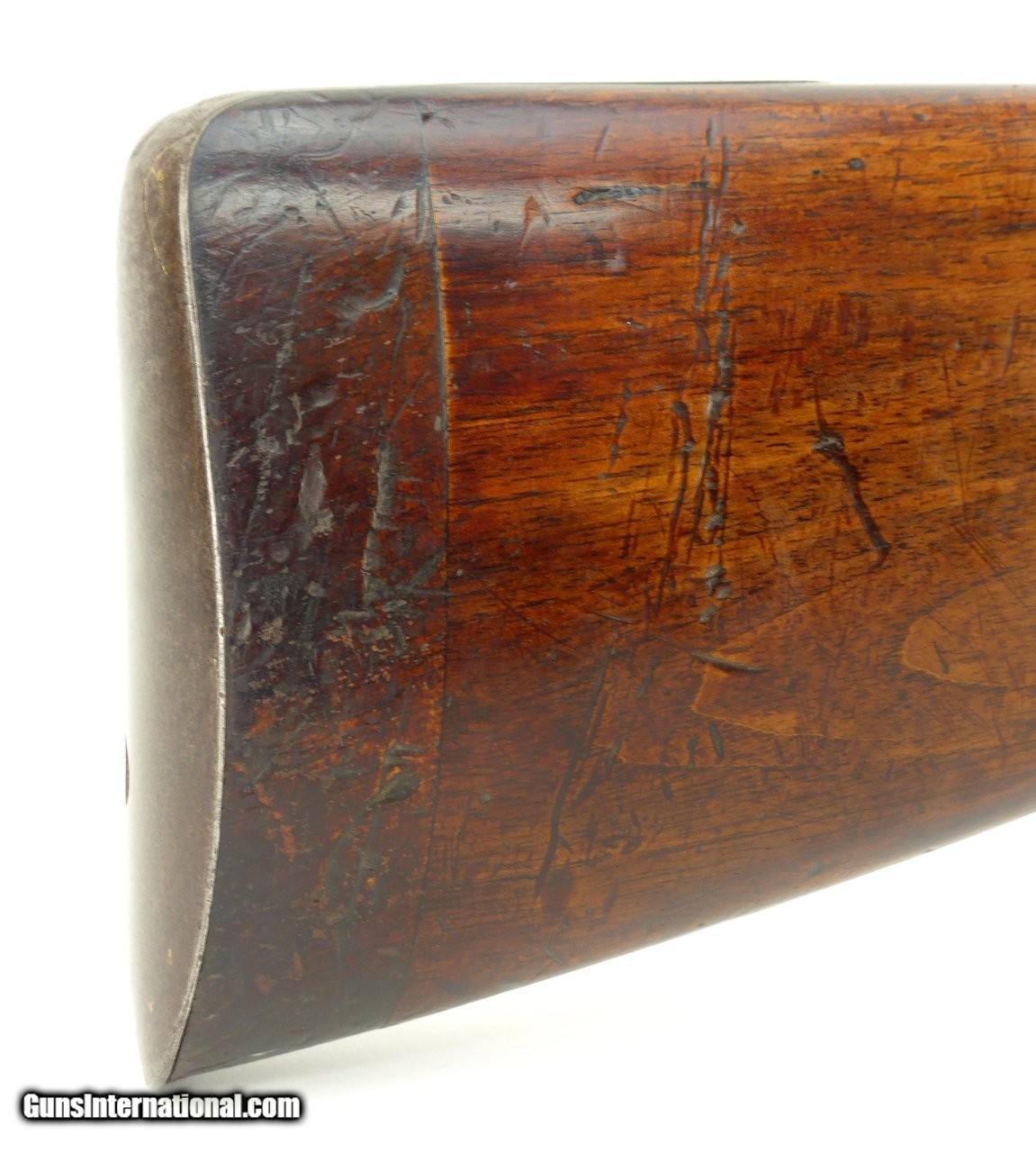 Description: "Rare English Breech Loading Rifle by Collis of Oxford. (Marked on lock) mechanism is similar to the Ferguson system but does not load from the top. Trigger guard unscrews completely to reveal the loading chamber which may be loaded with a ball and then with a powder load or possibly a ball with powder load as a single unit? Barrel length is 36" and overall length is 52". Barrel retains 90% plus finish. The stock was lengthened long ago (LOP is 14½") and does not detract from the appearance of the rifle. Forend wood has an old repairs on the right side of the forend. Gun overall is in good plus condition. Metal parts rate very good. Rare Flintlock Breech Loader (DALLAS LOCATION) Antique: Yes Price: $9,750.00 Contact Seller |