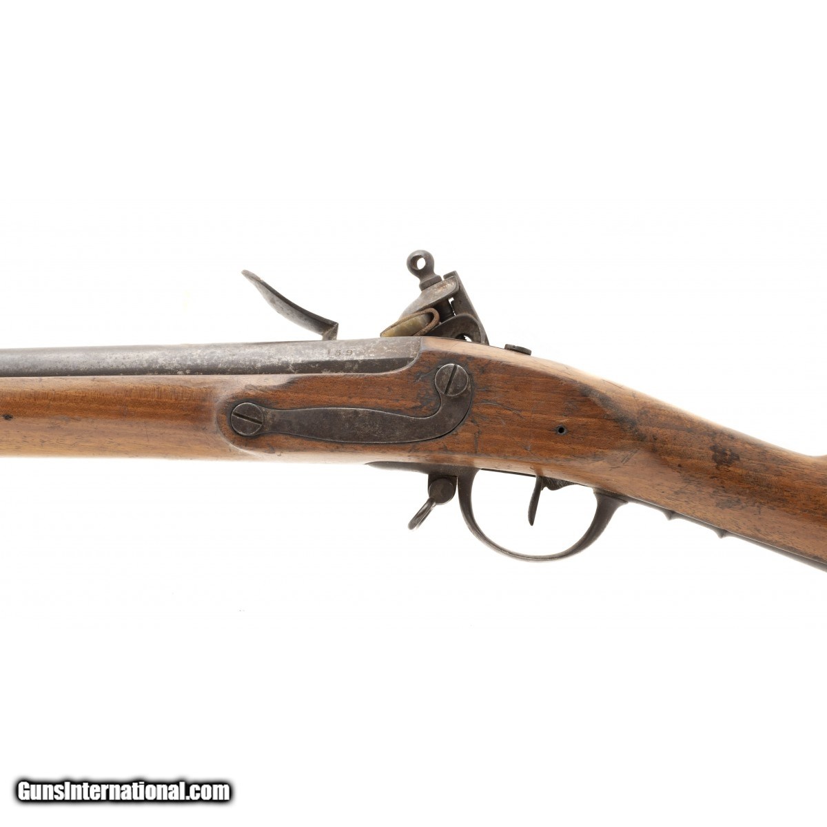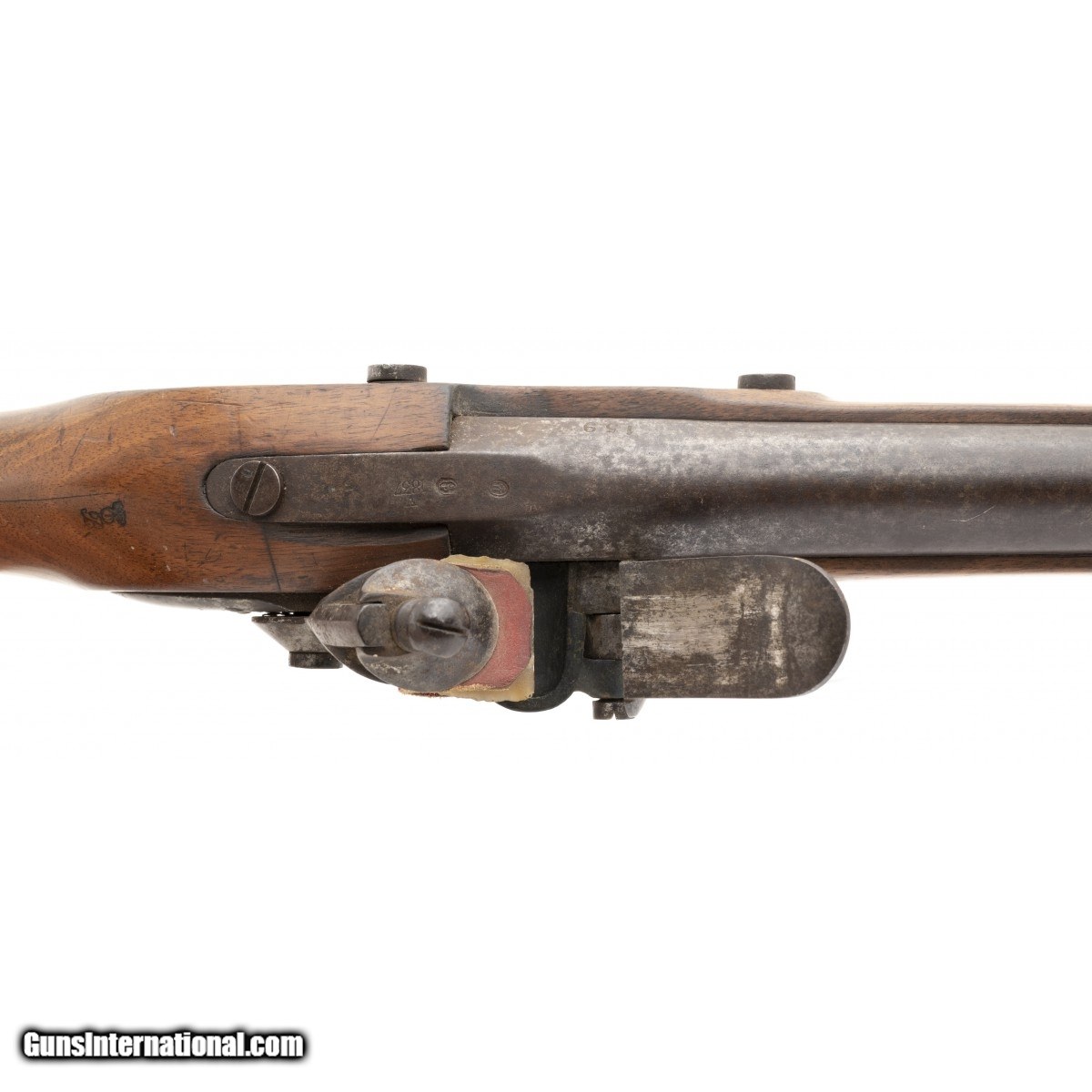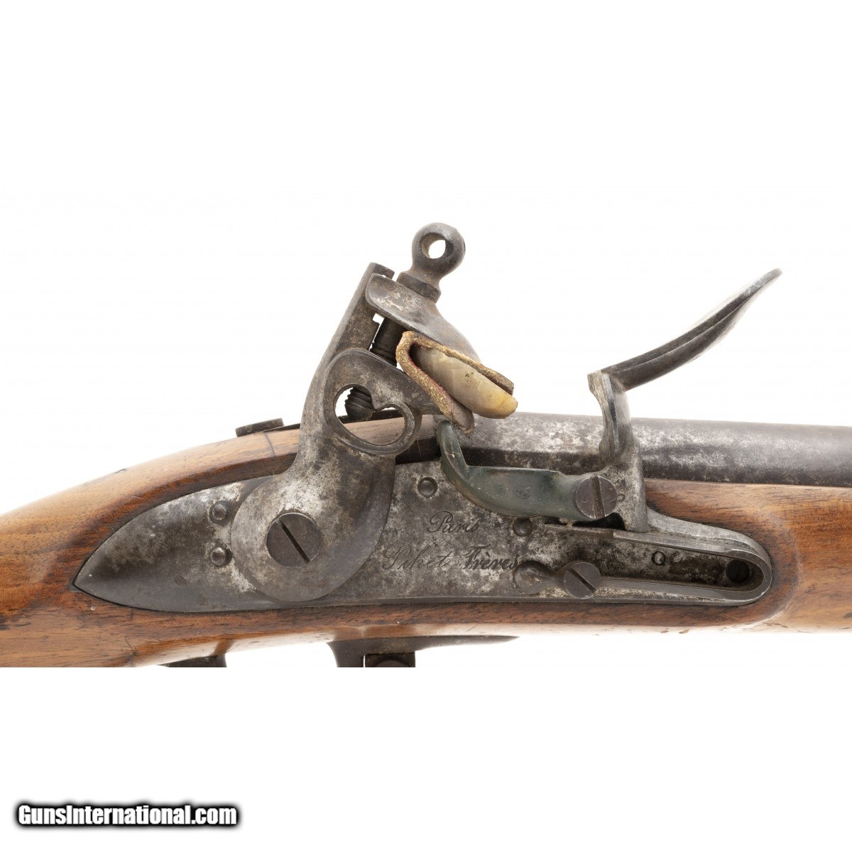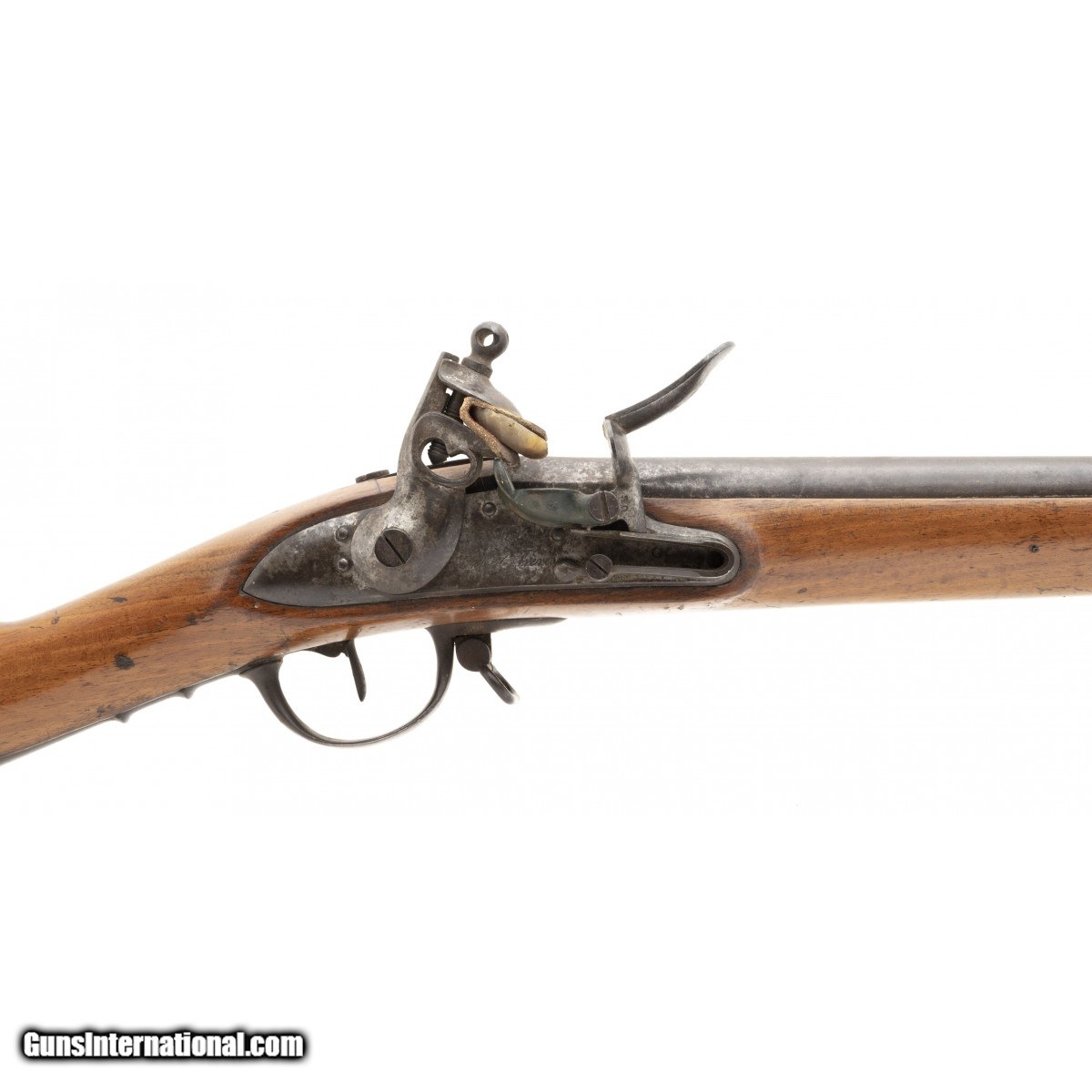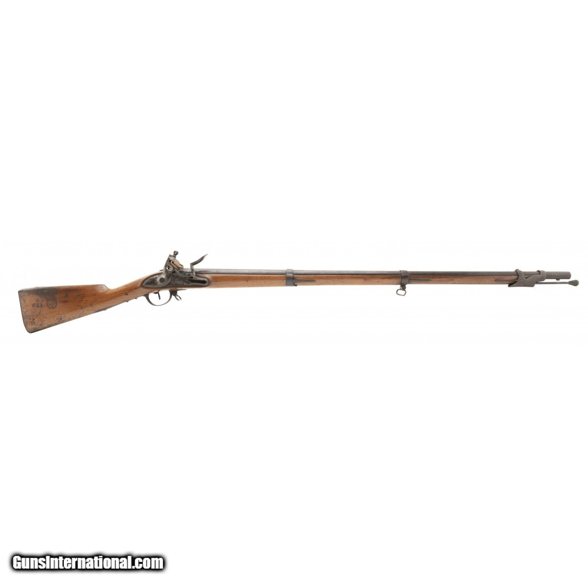 Description: " This French National Guard flintlock musket is dated 1837. The overall length is approx. 56"". The 40.5"" round 69 caliber smooth bore barrel has a very good bore with the internal manufacturing marks still visible. All the metal has a smooth brown patina. The barrel is numbered 159 on the left and has two impressed proof marks followed by V over 1837 at the top center. The lock, which has a brass pan, is marked in script Paris over Pihet Freres (Pihet brothers). The Pihets also worked at the French national armory at Charleville. The stock is very good with an old chip at the right of the barrel tang, no other chips or cracks, and moderate issue wear. The right butt has a sharply stamped rondel reading PARIS 1834 (date may be 1844) PIHET with very small unreadable block letters following. The center of the rondel has a nicely struck rooster. The rondel is followed by 159, the same number as on the barrel. The left butt has a circular stamp with PD over L. This stands for Pour Le Droit (For the Law). The action functions correctly. This is a very nice example of a rarely seen French National Guard flintlock musket. SOLD Antique: Yes |