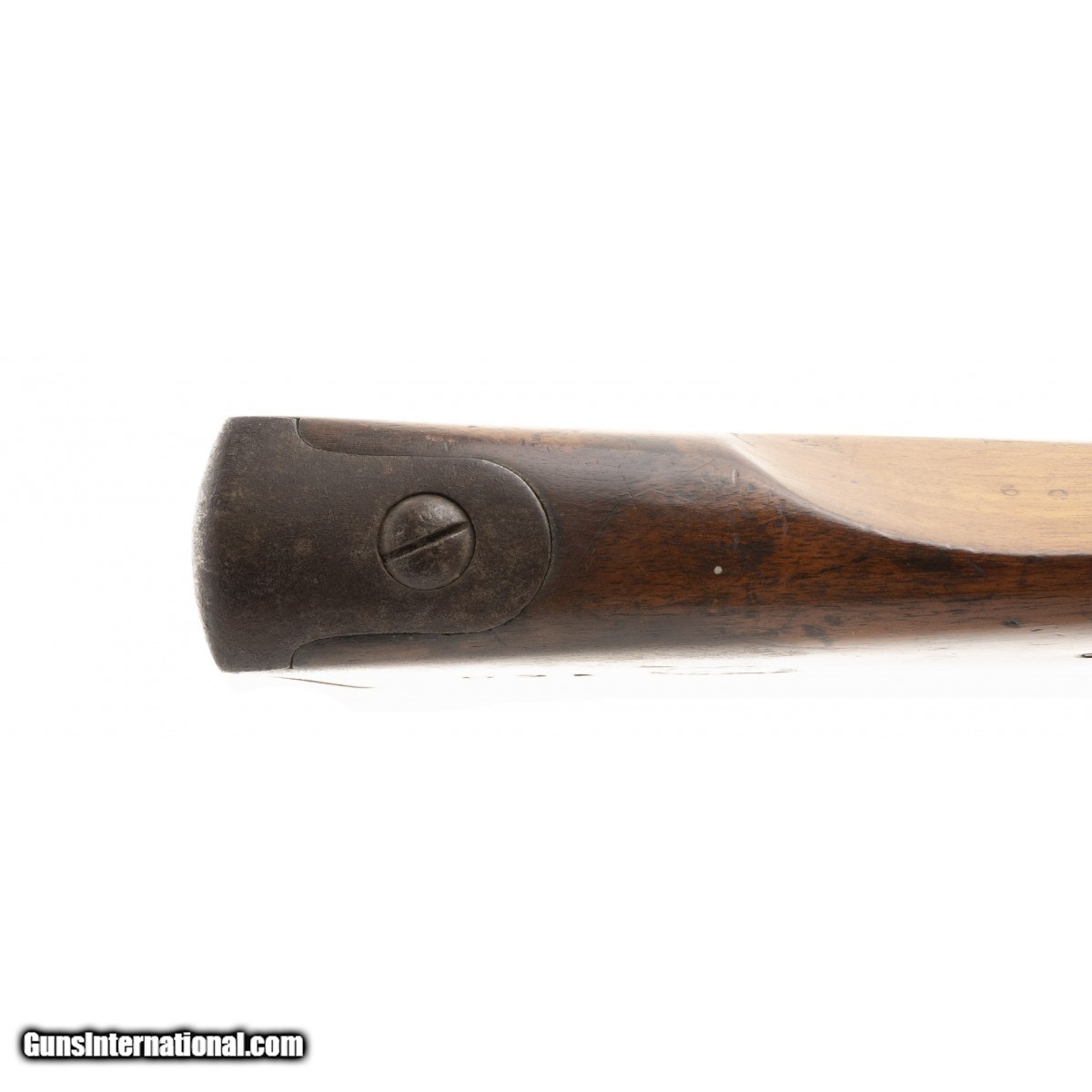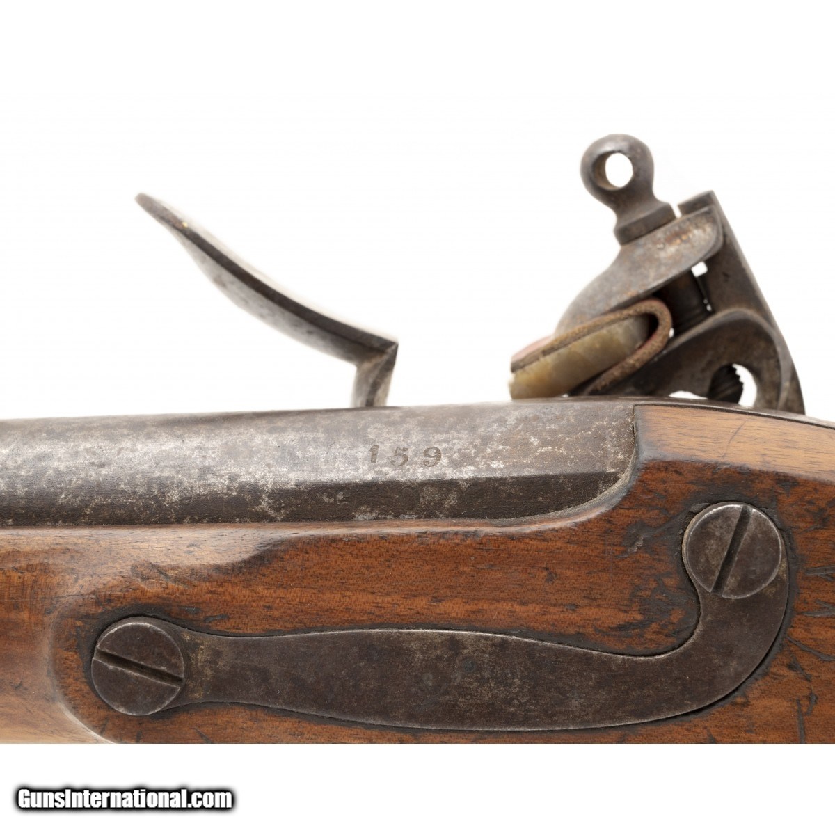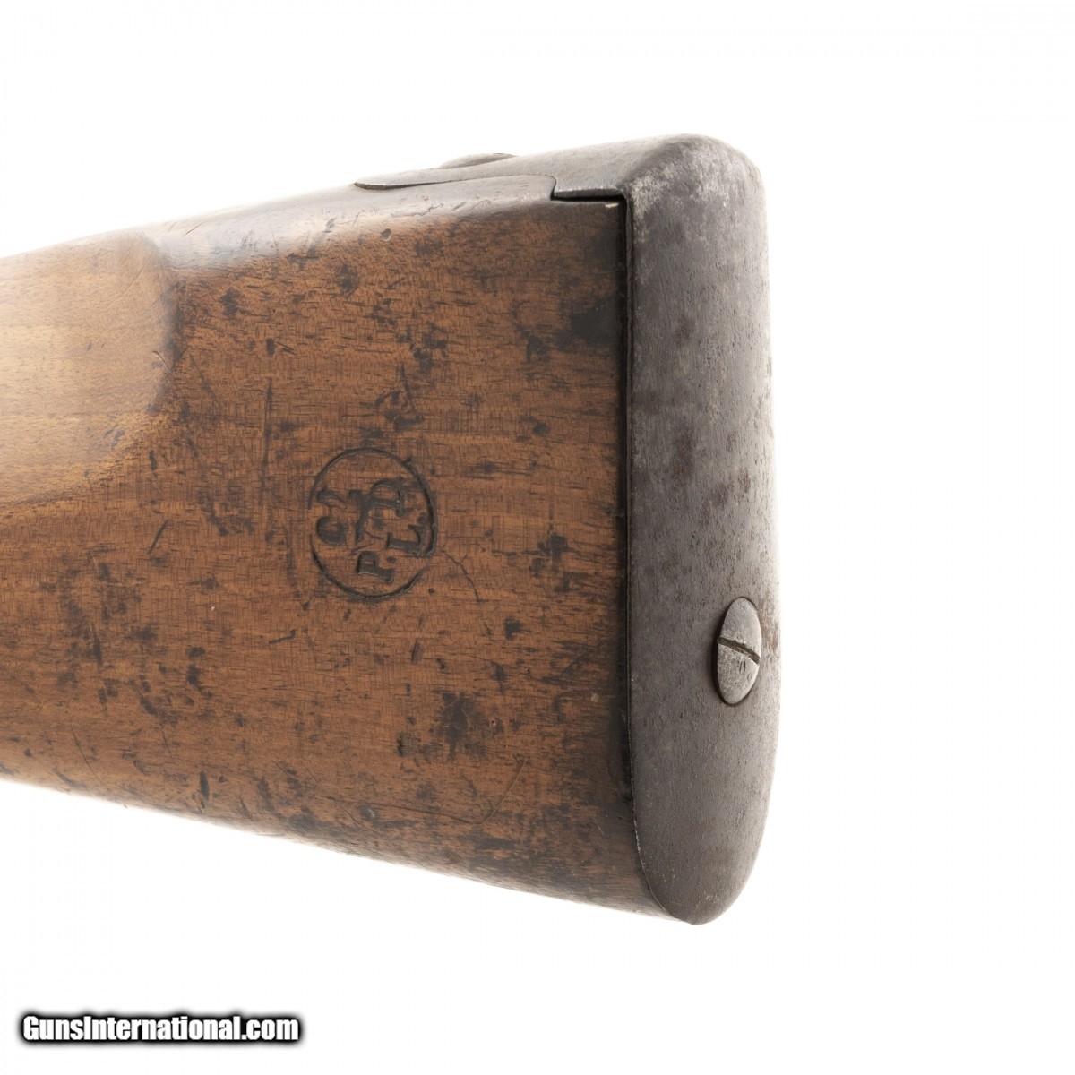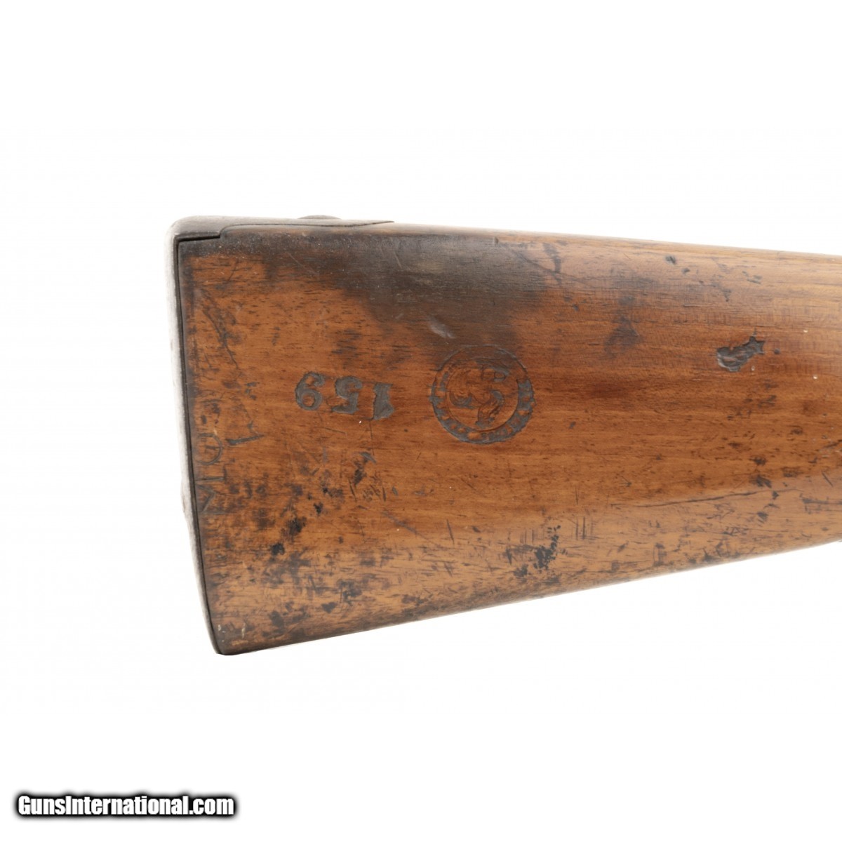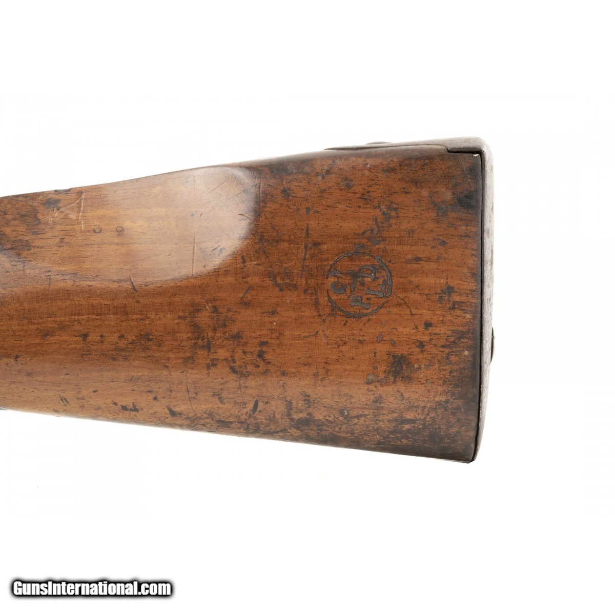 Description: " This French National Guard flintlock musket is dated 1837. The overall length is approx. 56"". The 40.5"" round 69 caliber smooth bore barrel has a very good bore with the internal manufacturing marks still visible. All the metal has a smooth brown patina. The barrel is numbered 159 on the left and has two impressed proof marks followed by V over 1837 at the top center. The lock, which has a brass pan, is marked in script Paris over Pihet Freres (Pihet brothers). The Pihets also worked at the French national armory at Charleville. The stock is very good with an old chip at the right of the barrel tang, no other chips or cracks, and moderate issue wear. The right butt has a sharply stamped rondel reading PARIS 1834 (date may be 1844) PIHET with very small unreadable block letters following. The center of the rondel has a nicely struck rooster. The rondel is followed by 159, the same number as on the barrel. The left butt has a circular stamp with PD over L. This stands for Pour Le Droit (For the Law). The action functions correctly. This is a very nice example of a rarely seen French National Guard flintlock musket. SOLD Antique: Yes |