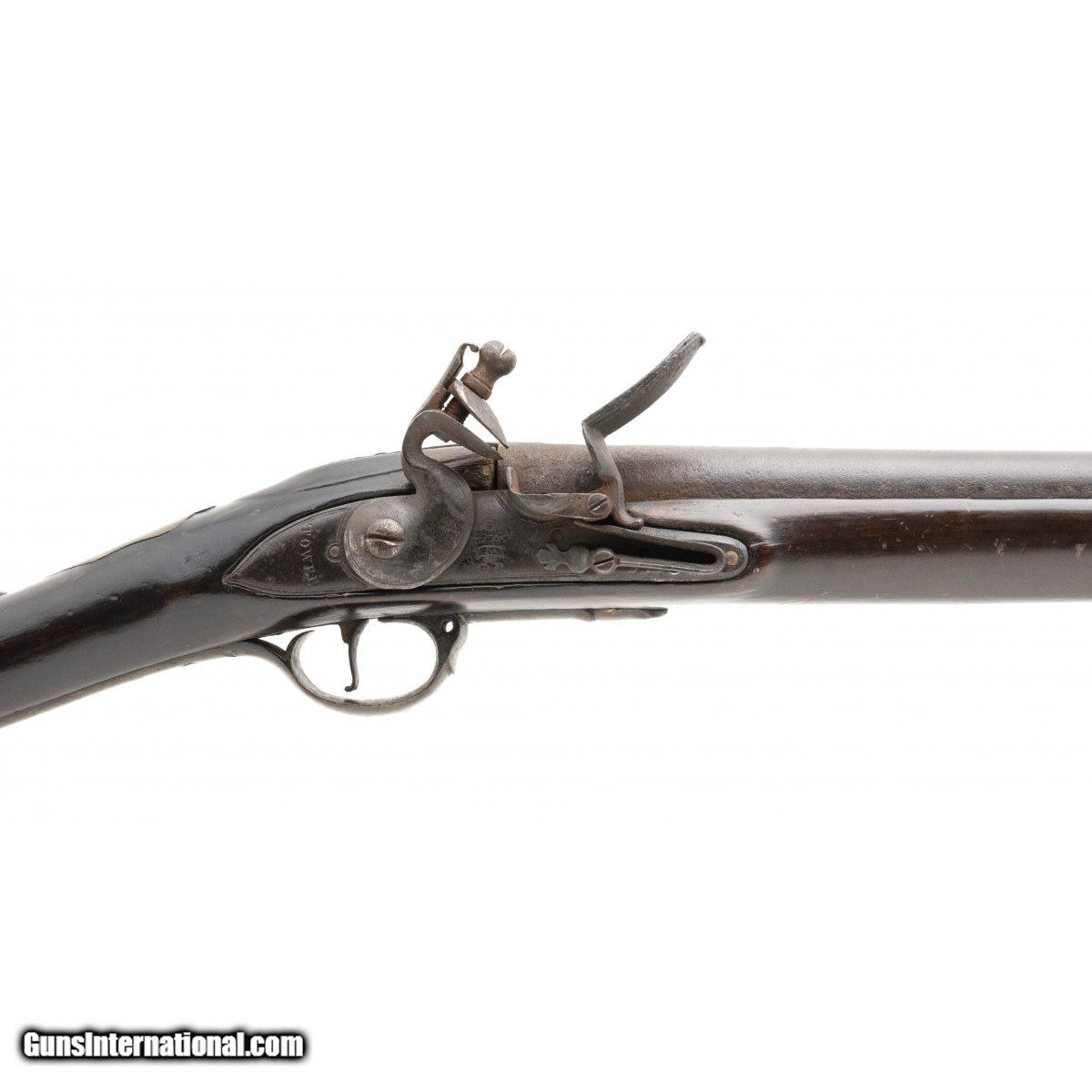 NSN, .79 caliber, 46"" round smoothbore barrel circa 1780. Rare 4th Battery New Jersey marked 1756 Long Land Pattern Brown Bess flintlock musket who were Loyalist and fought for the crown. Overall good condition, metal is a dark brown patina with pin-prick surface oxidation visible. Barrel is marked ""4 BT NJV"", wood shows scattered dings, nicks and scratches a minor splice is noted in the front part of the stock, this does not take away from the rarity of this musket , sling swivles have been removed. Thumb piece is marked with ""E/38"", Lock plate has ""Crown over GR"" and ""TOWER"" behind the cock. The 4th New Jersey Volunteers fought in many battles during the Revolution, the most notable was Gorten Heights in 1781. The volunteers were under the command of the famous turncoat Benedict Arnold who during this battle ordered the massacre of surrendering Continental Army soldiers. Revolutionary War arms are hard to find but marked Loyalist arms are even harder!