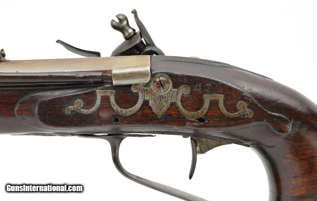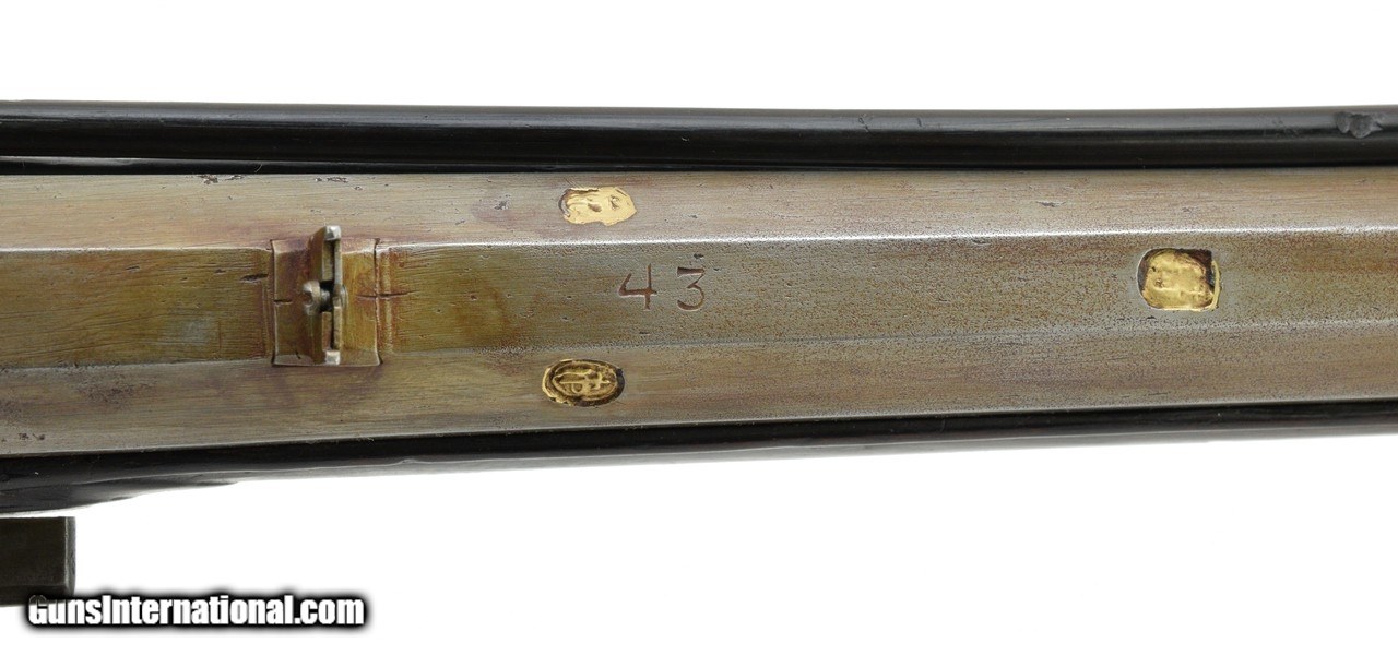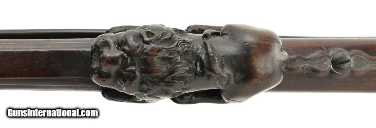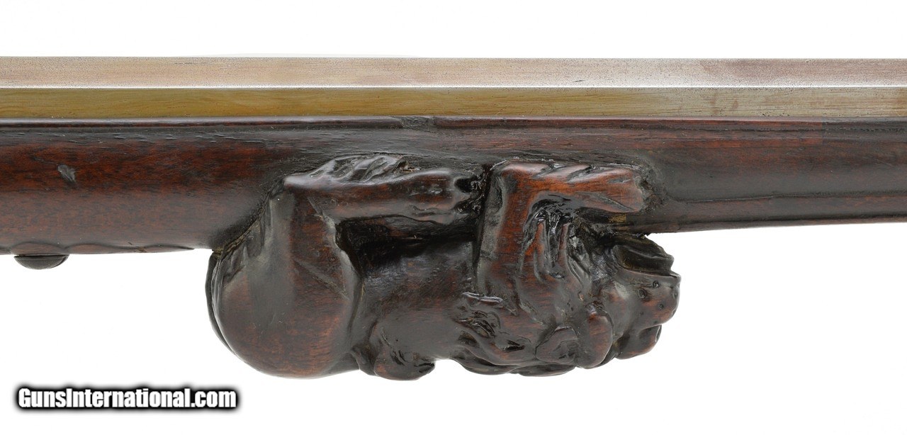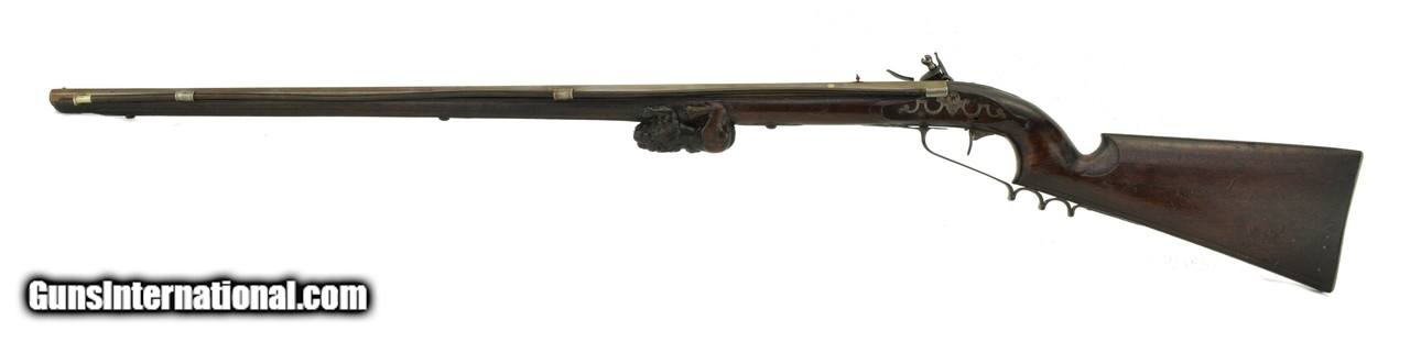 Description: "Rare Swiss Target Rifle. Approximately .58 caliber. Barrel length is 33¾" and overall length is 48½" flintlock. With flat lock-plate, buttstock is unique to Swiss Target rifles as is the carved lion to serve as a hand hold. Action works perfectly. Barrel has what appears to be marks sinks but not marked. We have only had two of these in 43 years. Price: $6,500.00 Contact Seller |