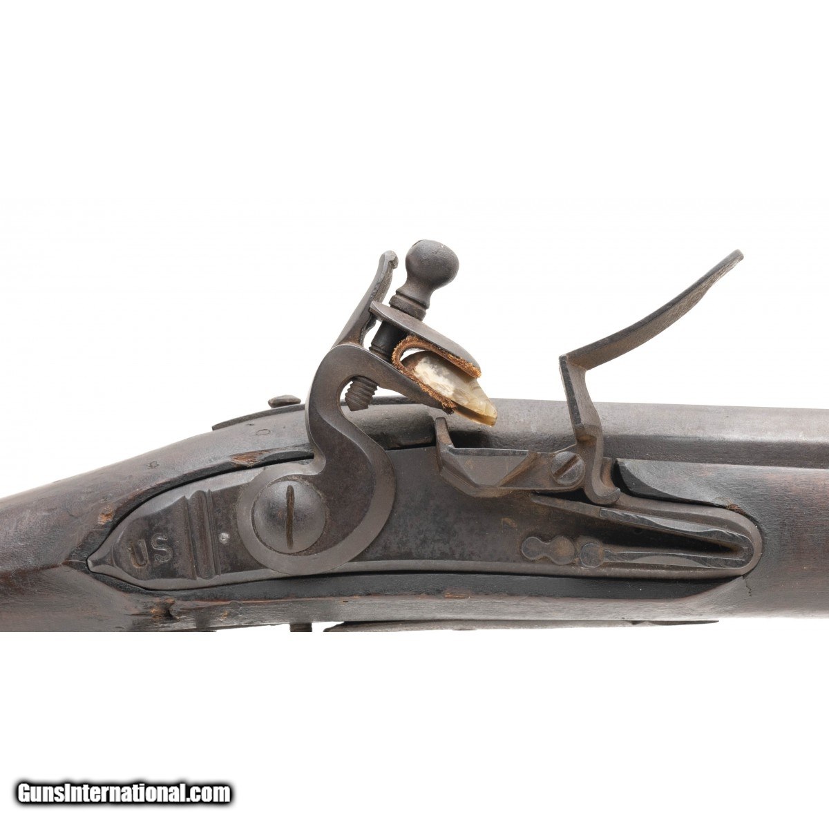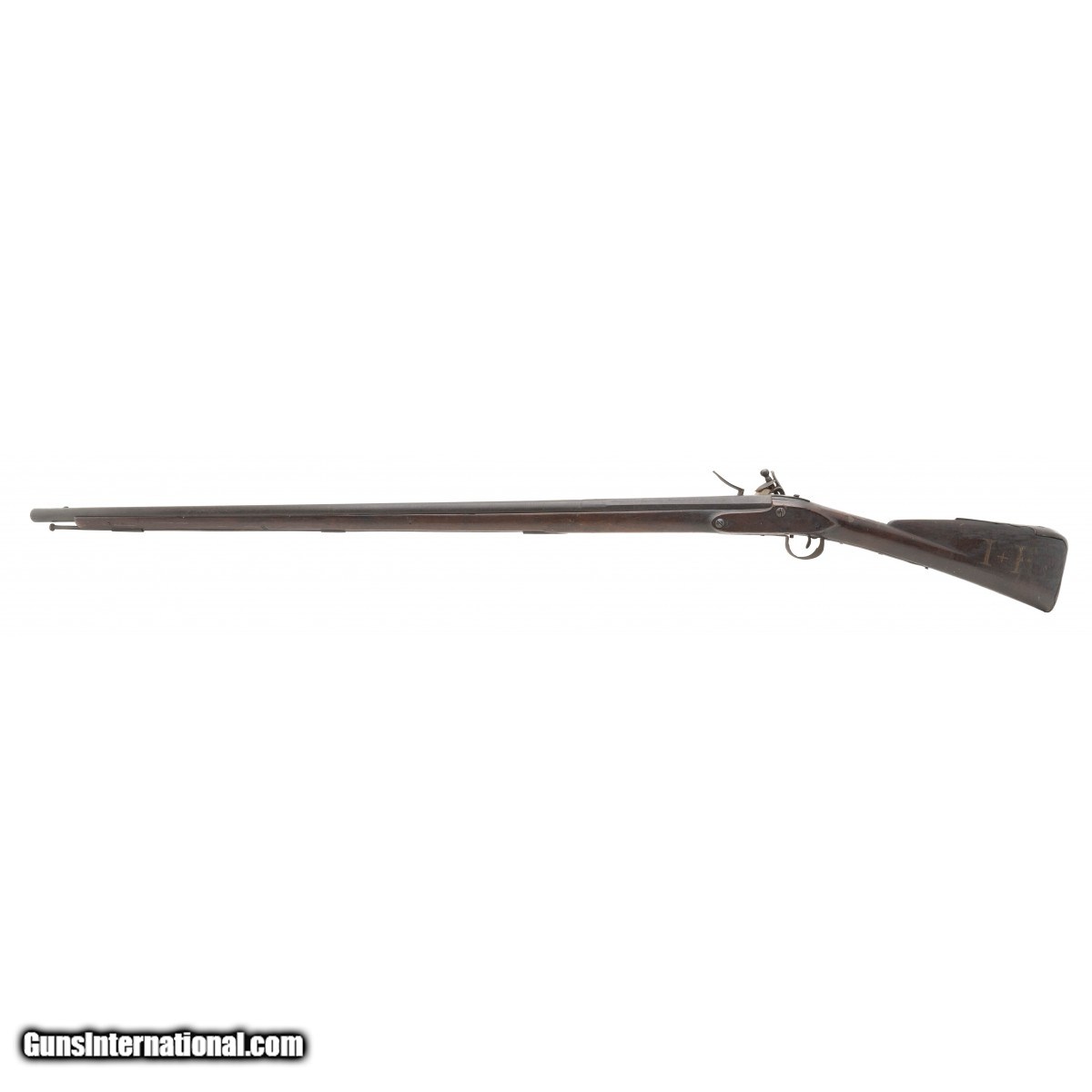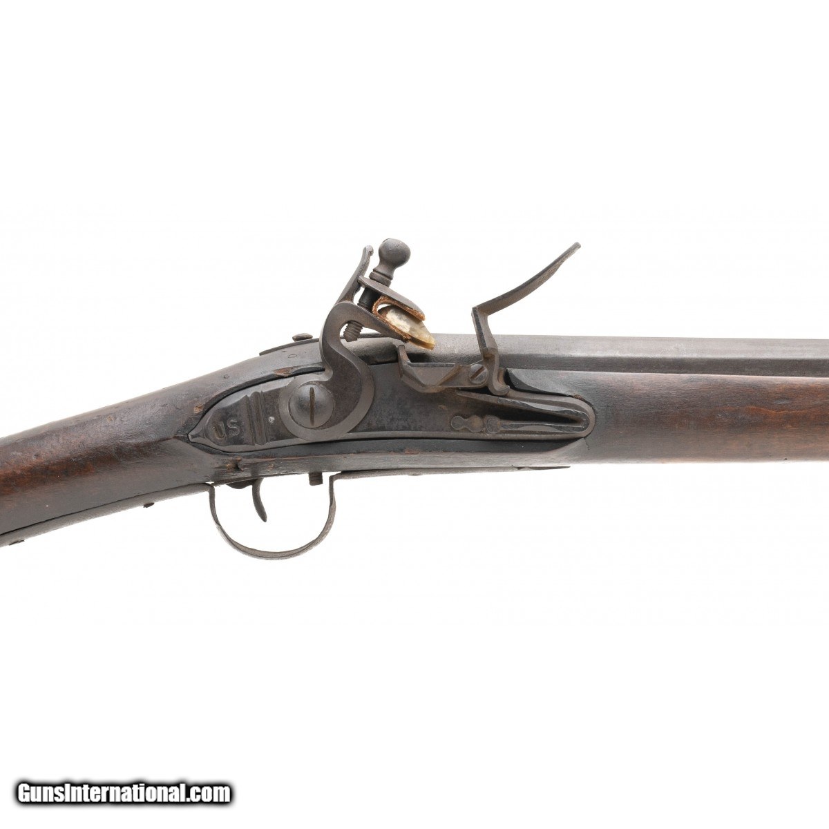.78 caliber 45.7/8"" long barrel American flintlock smoothbore musket in ""attic"" condition. The lock is of Germanic manufacturing circa 1740's with a large ""US"" stamped behind the lock, all other furniture is iron. Stock is American Black Walnut, and has been remortised to take the Germanic lock. Wood shows usage and handling wear, it is to note that ""I+P"" is painted in the left side. This may show native usage during the war. Action functions correctly. This musket can be found in William Guthman's book ""U.S. Army Weapons 1784-1791 on page 47.