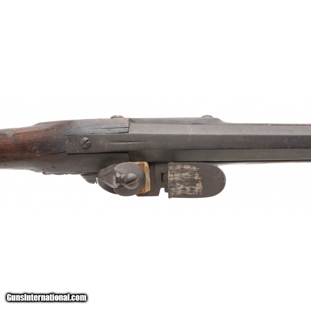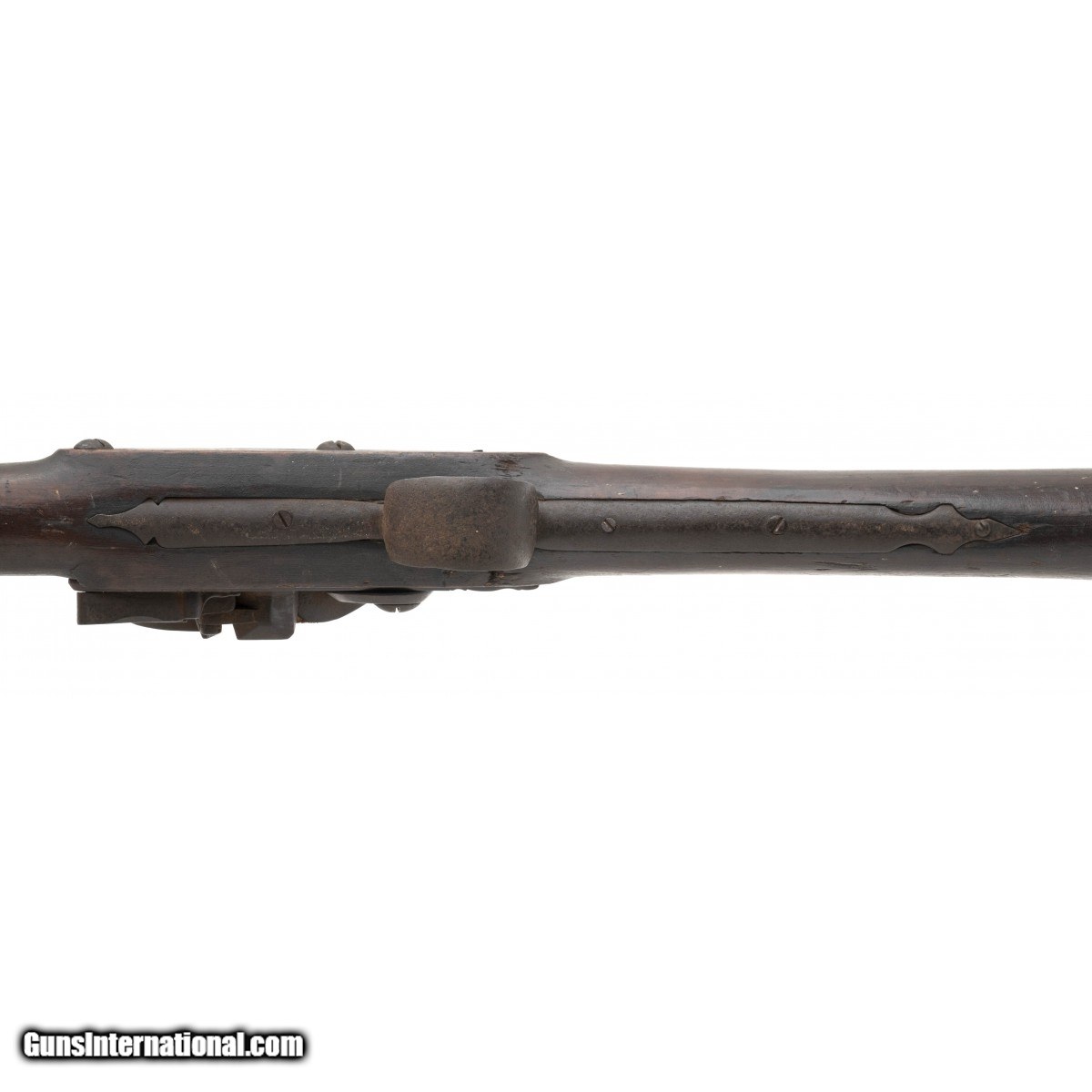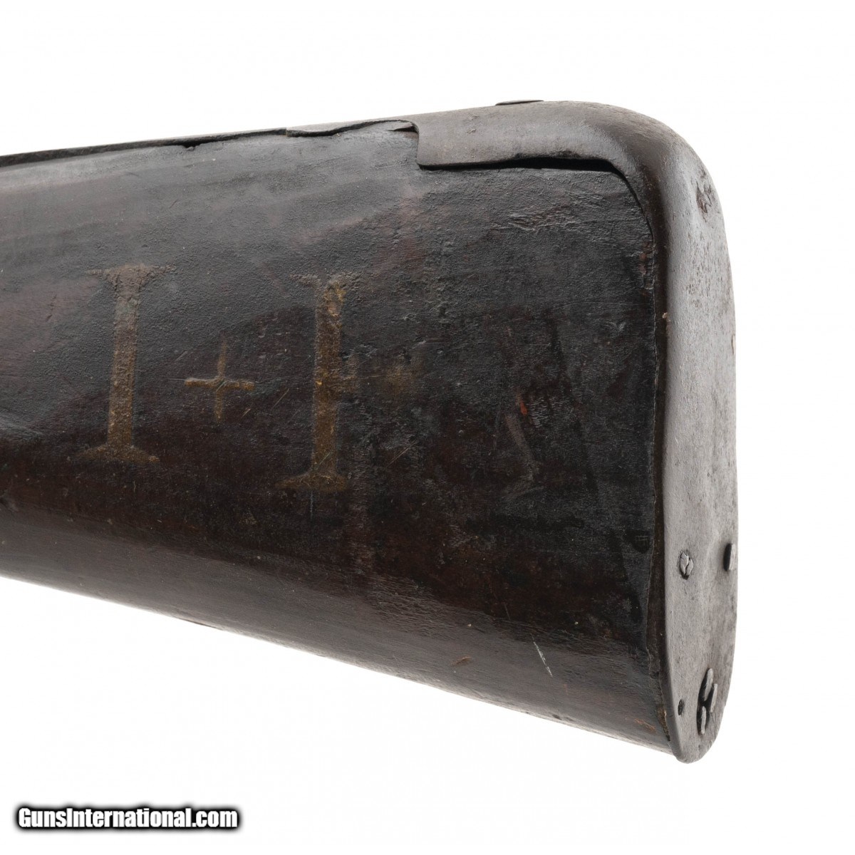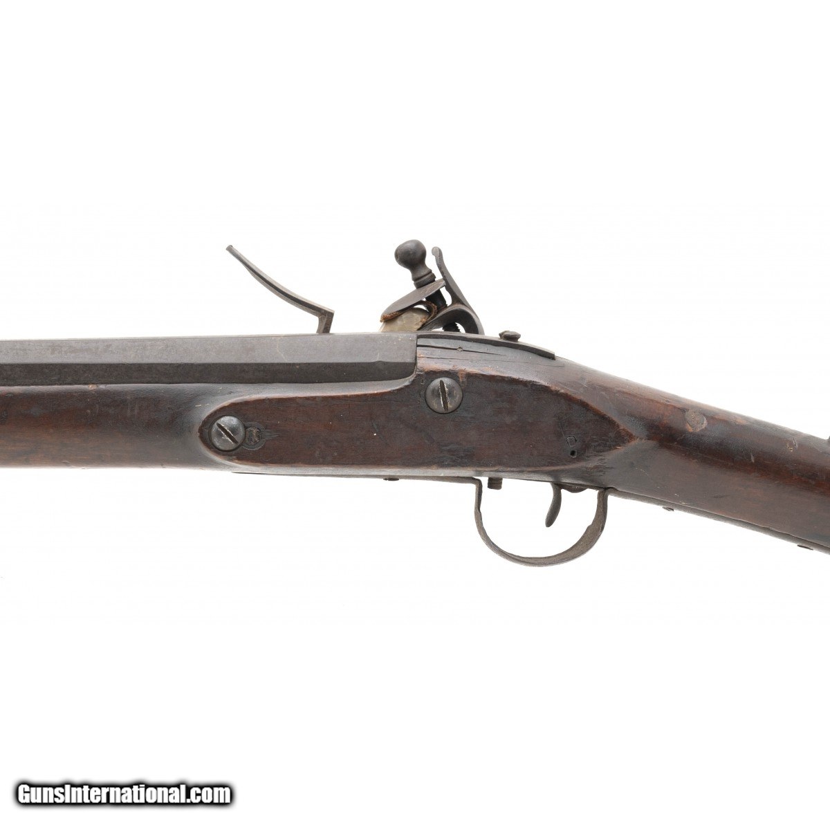 .78 caliber 45.7/8"" long barrel American flintlock smoothbore musket in ""attic"" condition. The lock is of Germanic manufacturing circa 1740's with a large ""US"" stamped behind the lock, all other furniture is iron. Stock is American Black Walnut, and has been remortised to take the Germanic lock. Wood shows usage and handling wear, it is to note that ""I+P"" is painted in the left side. This may show native usage during the war. Action functions correctly. This musket can be found in William Guthman's book ""U.S. Army Weapons 1784-1791 on page 47.