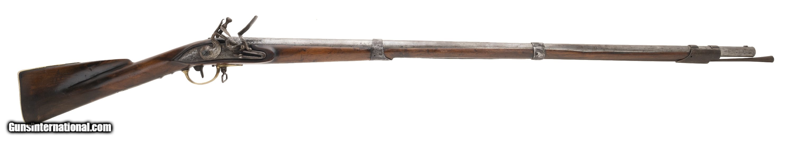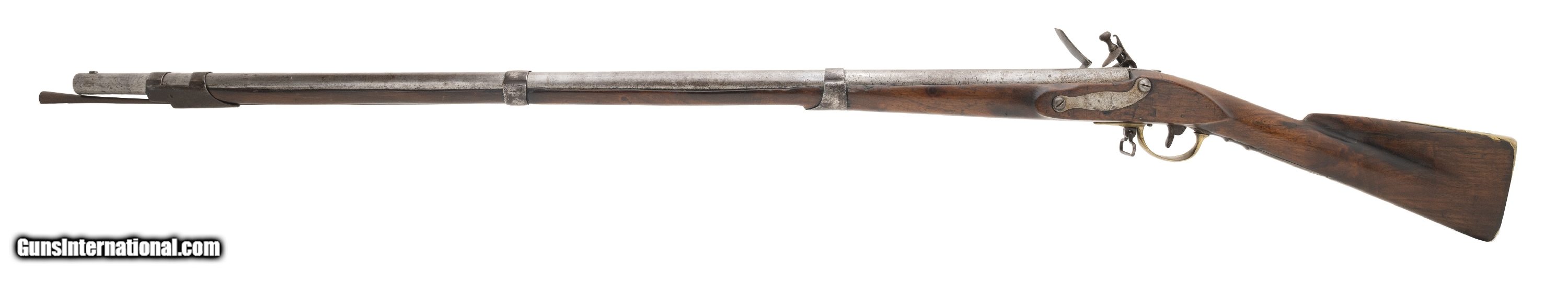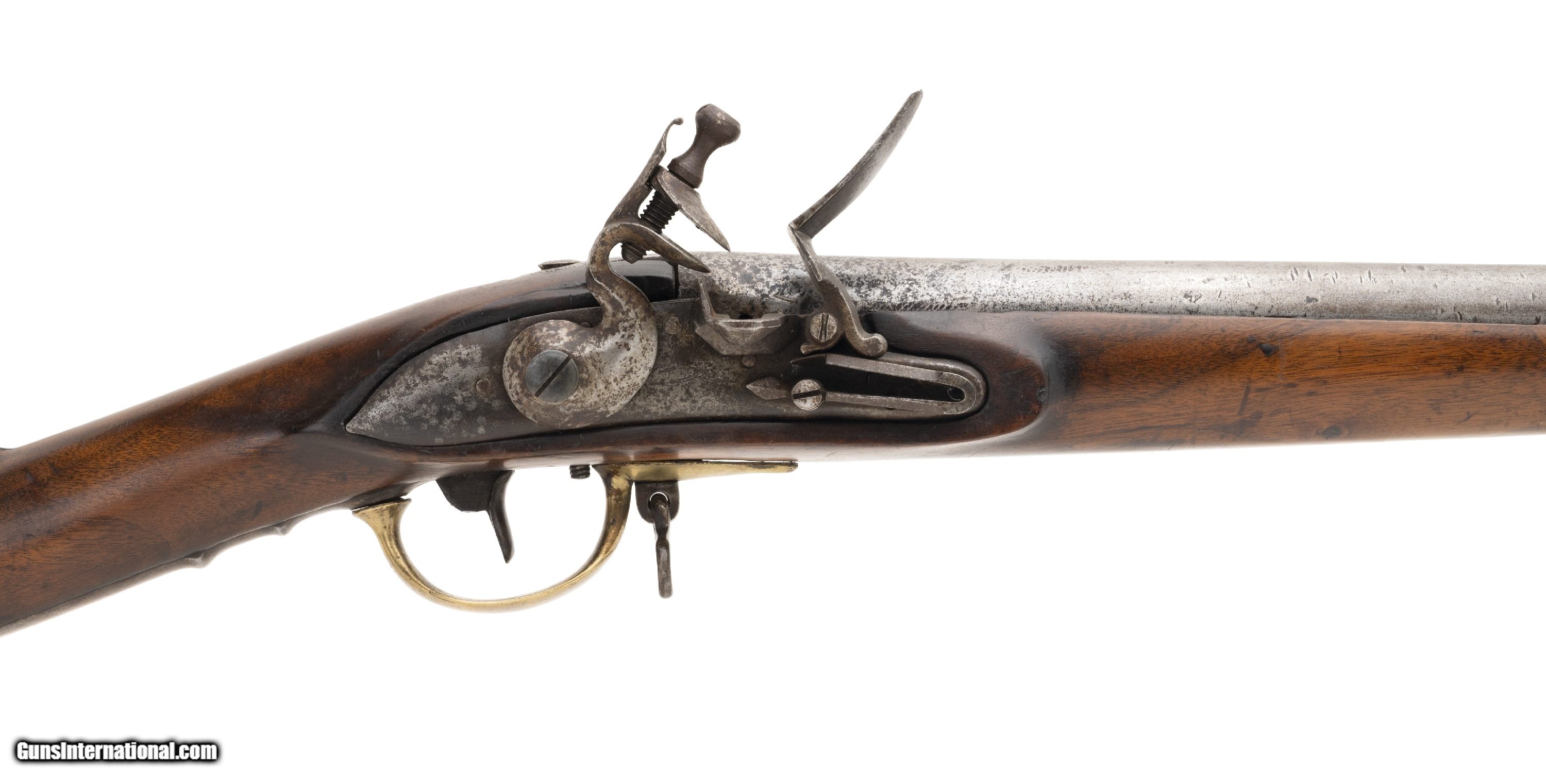 Description: "This interesting musket was probably assembled during the Revolutionary War. The overall length is approx. 59"". The 43"" round 74 caliber barrel has a good bore with light pitting. The barrel is smooth and bright with brown spotting and light roughness in the touchhole area. There are no proof or inspection marks on the barrel. It has a top mounted bayonet stud. The lock is slightly curved, has a large faceted iron pan, S shaped cock (with replaced cock screw), a large frizzen, and frizzen spring with a spear point. The lock is unmarked on the exterior. The interior has a rectangular EM touch mark and VI assembly number. It may be Dutch in origin. The barrel is fastened to the stock with bands, similar to the French Model 1763, but no band springs are present and the lower two bands appear to be blacksmith work or rework. The three bands have band spring holes. The bands are friction fit only. The iron side plate appears to be of French style. The brass trigger guard and early Brown Bess style butt plate (top screw has half the head broken off) are very good. The trigger guard ends in a rounded point about 1.75"" forward of the bow. The iron trigger plate, with two finger ridges, extends 5"" behind the rear bow. The walnut stock is very good with light usage wear for its age, a small chip to the rear of the barrel tang, and no other cracks or chips. It does not show any evidence that band springs were ever installed. There is one sling swivel forward of the trigger guard bow and a ramrod which may be a later replacement. The lock functions correctly. It is our opinion that this musket was assembled in America from available parts circa the Revolutionary War. It certainly merits further research. AUSTIN LOCATION Antique: Yes Price: $5,500.00 Contact Seller |