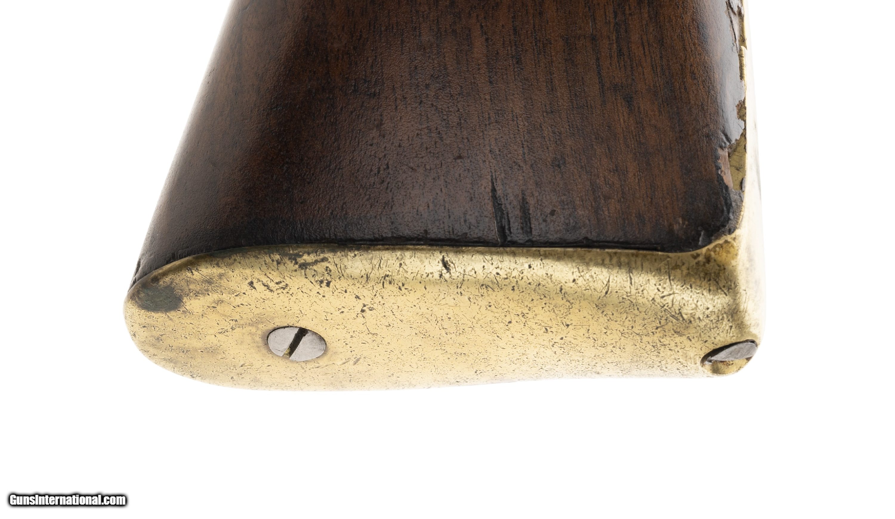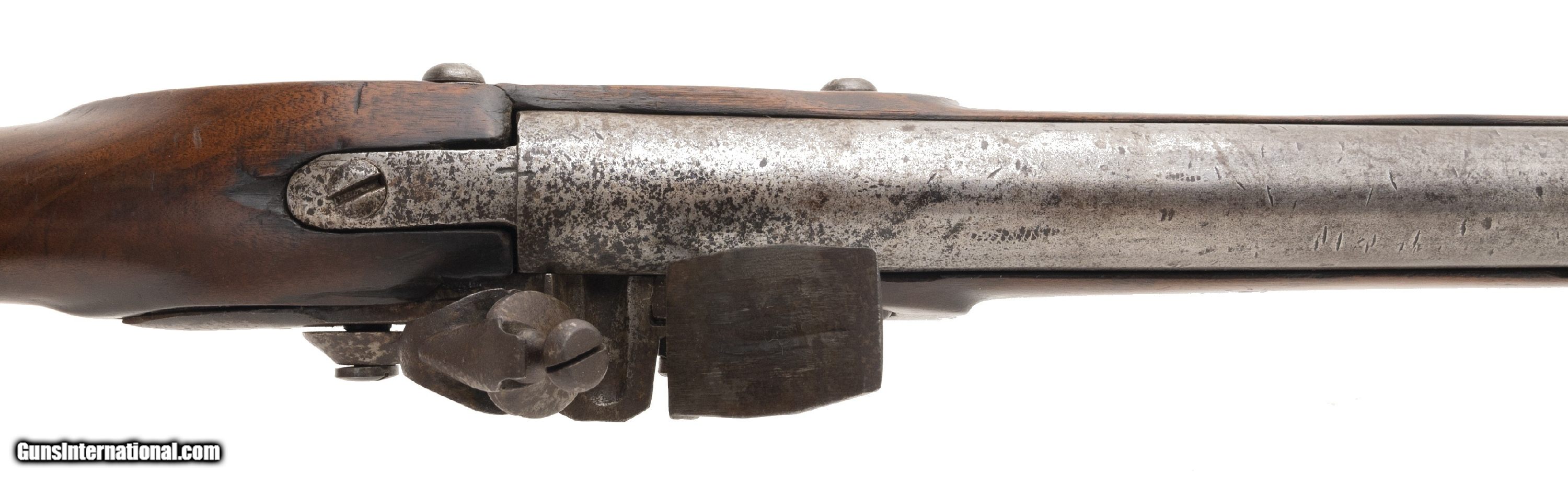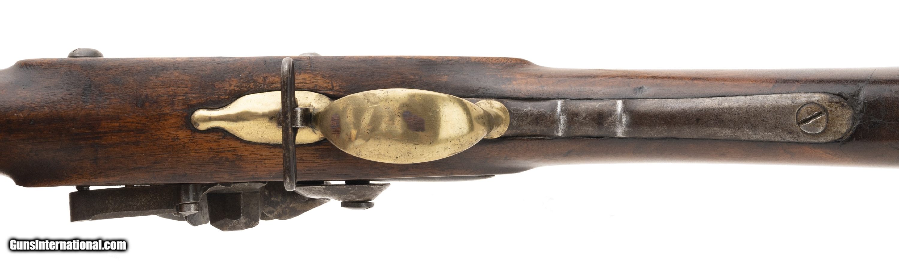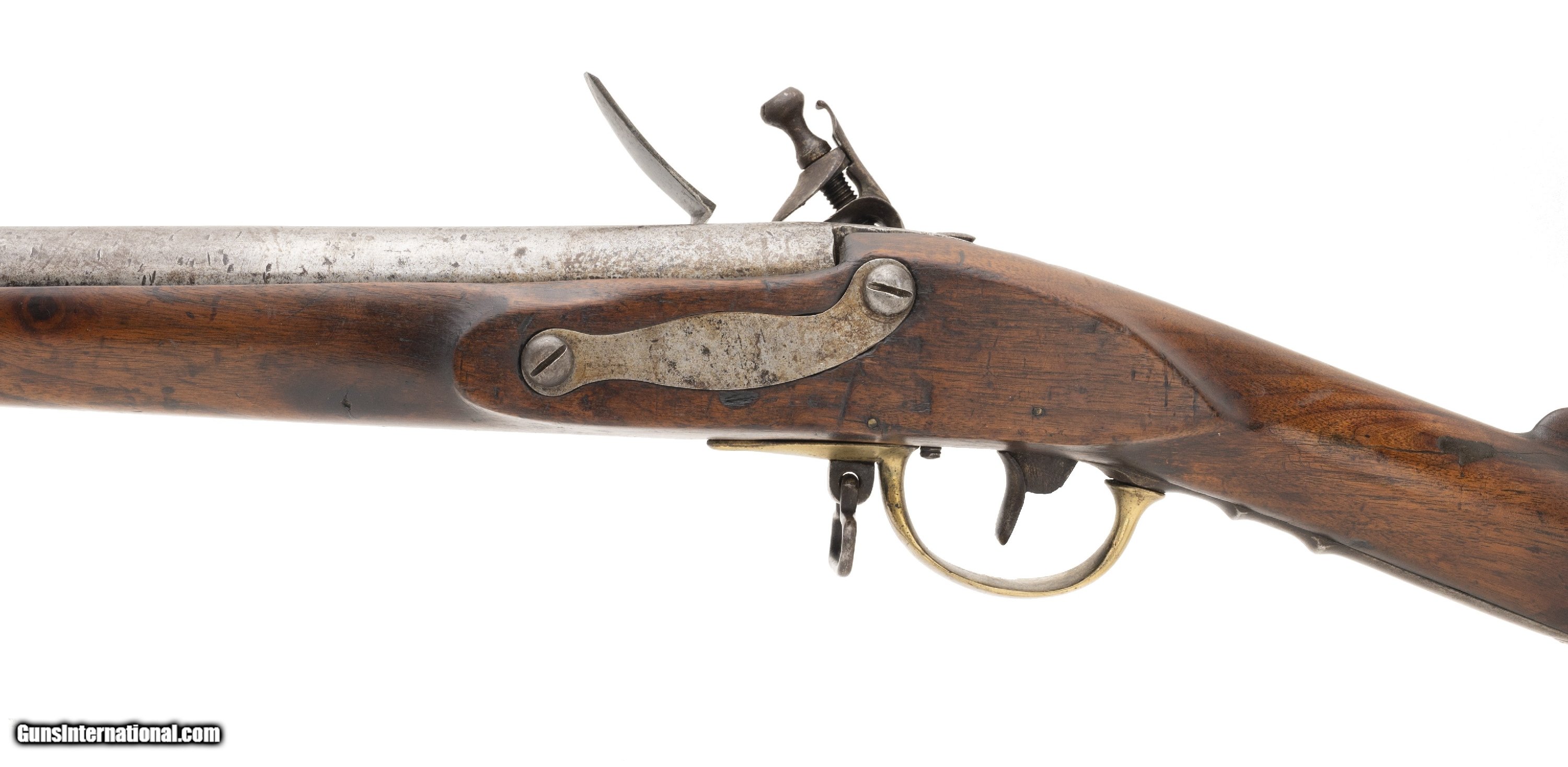 Description: "This interesting musket was probably assembled during the Revolutionary War. The overall length is approx. 59"". The 43"" round 74 caliber barrel has a good bore with light pitting. The barrel is smooth and bright with brown spotting and light roughness in the touchhole area. There are no proof or inspection marks on the barrel. It has a top mounted bayonet stud. The lock is slightly curved, has a large faceted iron pan, S shaped cock (with replaced cock screw), a large frizzen, and frizzen spring with a spear point. The lock is unmarked on the exterior. The interior has a rectangular EM touch mark and VI assembly number. It may be Dutch in origin. The barrel is fastened to the stock with bands, similar to the French Model 1763, but no band springs are present and the lower two bands appear to be blacksmith work or rework. The three bands have band spring holes. The bands are friction fit only. The iron side plate appears to be of French style. The brass trigger guard and early Brown Bess style butt plate (top screw has half the head broken off) are very good. The trigger guard ends in a rounded point about 1.75"" forward of the bow. The iron trigger plate, with two finger ridges, extends 5"" behind the rear bow. The walnut stock is very good with light usage wear for its age, a small chip to the rear of the barrel tang, and no other cracks or chips. It does not show any evidence that band springs were ever installed. There is one sling swivel forward of the trigger guard bow and a ramrod which may be a later replacement. The lock functions correctly. It is our opinion that this musket was assembled in America from available parts circa the Revolutionary War. It certainly merits further research. AUSTIN LOCATION Antique: Yes Price: $5,500.00 Contact Seller |