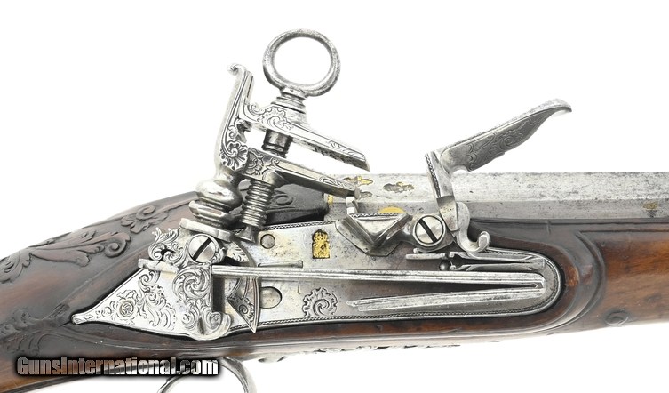 Scarce 15 Bore (.677) Spanish Miquelet-Lock Sporting gun by Guisasola, probably Antonio, 1770, With two-stage barrel retained by a single slender pierced iron band, fitted with a gold “Splder" front sight enclosed by gold scrolls, chiselled girdle decorated with foliage and gilt scrolls, octagonal breech stamped with a series of gold-lined decorative marks and the gold-lined Punzon of Domingo de Clabe and a further Punzon including a dog and a hound (unclear), inlaid with a gold line vent, the breech fitted with molded silver rear sight on a saddle, engraved tang decorated with scrolling foliage, scroll-engraved beveled Miquelet lock stamped with the gold-lined Punzon of “Guisola" and with engraved lock and bridle. Figured half-stock (reduced from full stock), carved with scrolling foliage about the ramrod aperture and the tang. “Catalan" style butt, engraved iron mounts comprising open work. Side-plate decorated with foliage, trigger guard with Punzon en suite with the lock, and butt plate with foliate terminal, and horn tipped ramrod (37.6"), and 37⅝" barrel. Provenance Spanish Firearms expert Dr. James D. Lavin. Antonio Guisasola is recorded in Eibar as a barrelmaker. His name is on a fowling piece made in 1796 that was presented to Carlos IV, now preserved in the Metropolitan Museum of Art (acc, no. 16.135). This is a very high quality and unusual Spanish Miquelet-Lock gun.