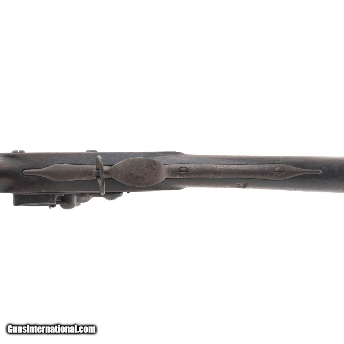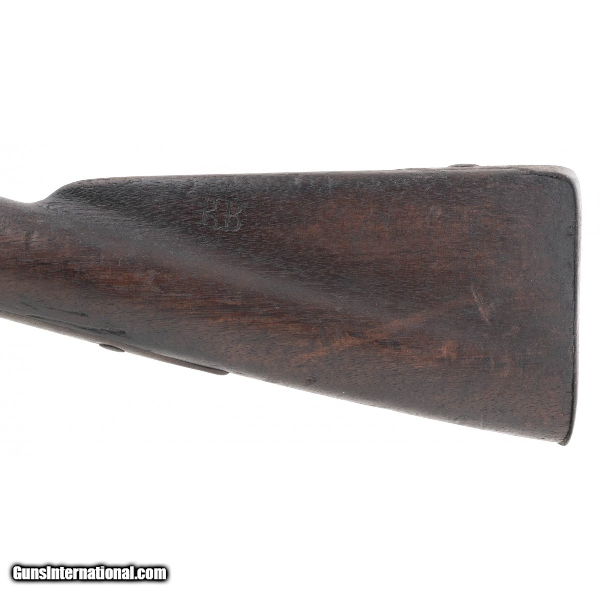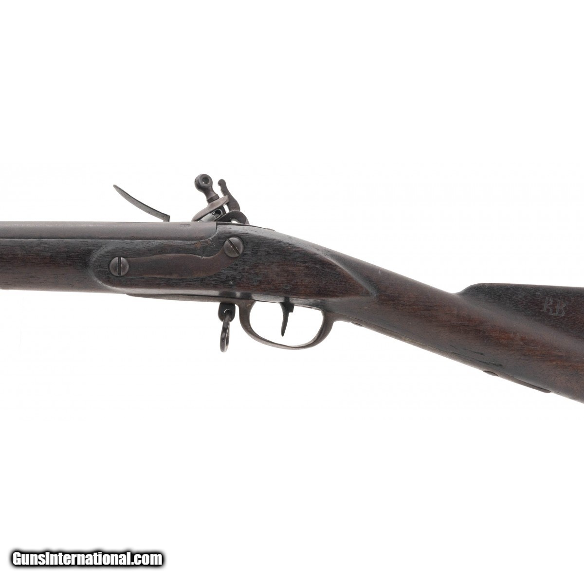 Description: " .69 caliber 44"" long smoothbore Commonwealth of Pennsylvania 1797 flintlock musket by Baker. One of only ten to known to exist. Metal is a dark patina with surface oxidation noted, barrel is marked with ""CP"" and ""P"" with Liberty cap proof mark. Stock is good with some dings and mars present, also the initials ""RB"" are carved into the left side of the butt-stock. Lock is marked Baker/CP, action functions correctly. This contract musket was made famous as being used during the Battle of Lake Erie! A scarce Martial long arm. SOLD |