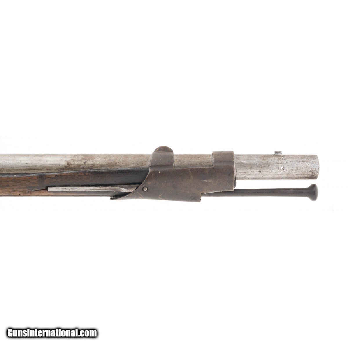 Description: " NSN .69 caliber flintlock contract musket with a 43"" round smoothbore barrel. Metal is a smooth light grey patina, barrel is marked ""P"" ""M"" /IM 1808. Stock is good with some dings, scratches and mars visible. Some wood loss is noted between the middle and front barrel band. ""NC"" is marked on the right side under the butt plate. Action functions correctly and lock is unmarked. SOLD Antique: Yes |