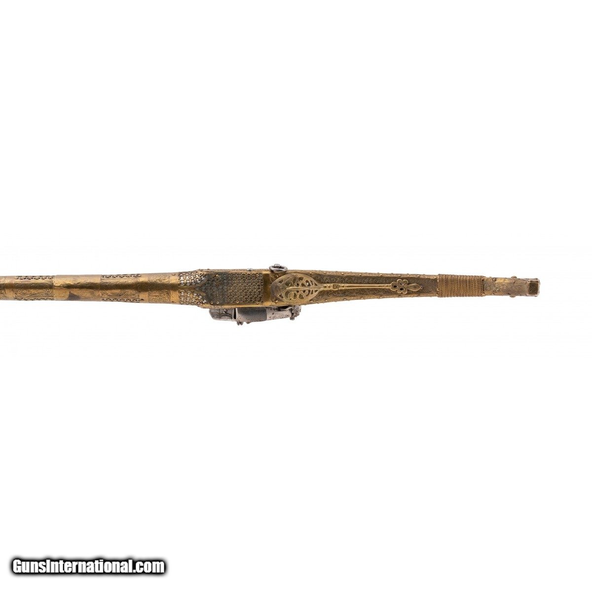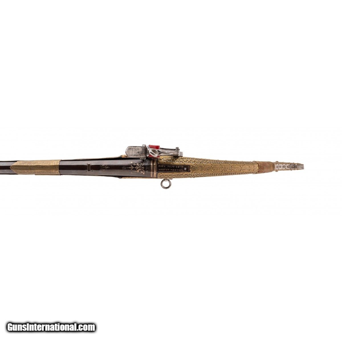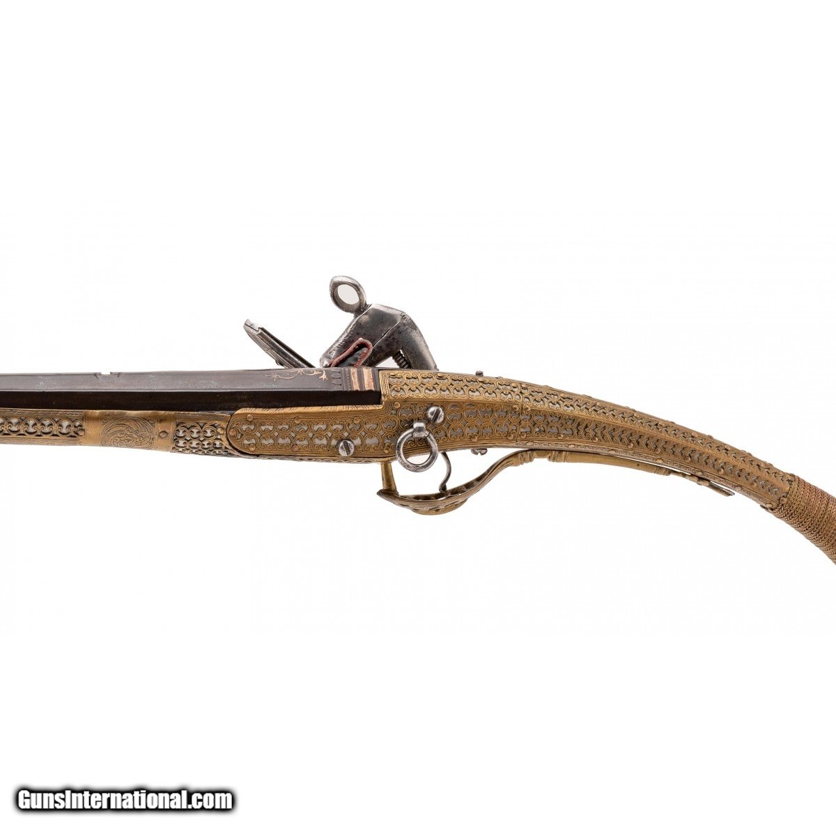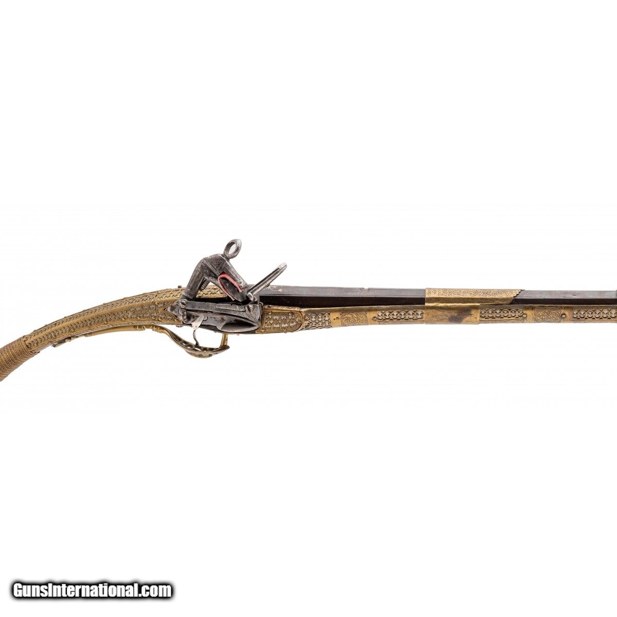 Description: "Made circa 12800. This is an exceptional example with first class adornment. The pierced metal stock is superbly made with very fine engraving. The grip ia wrapped in a brass rope. The barrel is Italian with a flared muzzle. The tang is inscribed and dated 1837. Extremely fine Balkan Arnautka Musket! SOLD Antique: Yes |