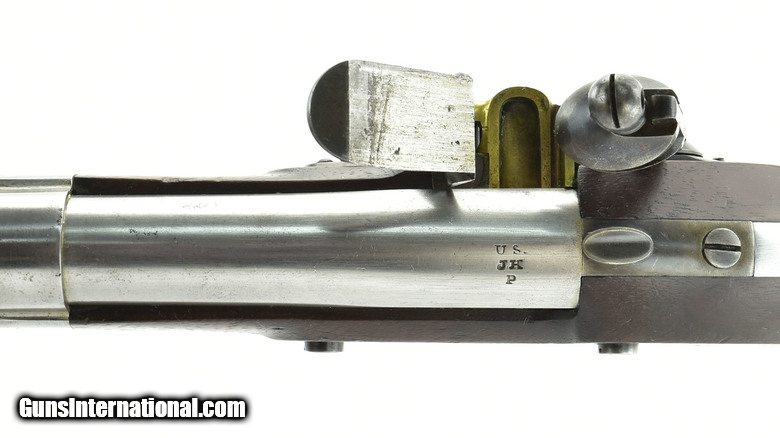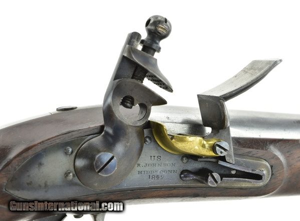 U.S. Model 1836 Flintlock Pistol. Dated 1842 by R. Johnson, Middletown Connecticuter. This pistol in new, unfired condition. The metal parts “in the white” are perfect. The stock is crisp with raised grain. The lock has 100% of its case colors, as does the frizzen and cock. Inspector cartouches are perfect. If you want a top condition 1836, this is it! The Model 1836 has long been considered the most eye appealing U.S. martial flintlock pistol by many well respected collectors.