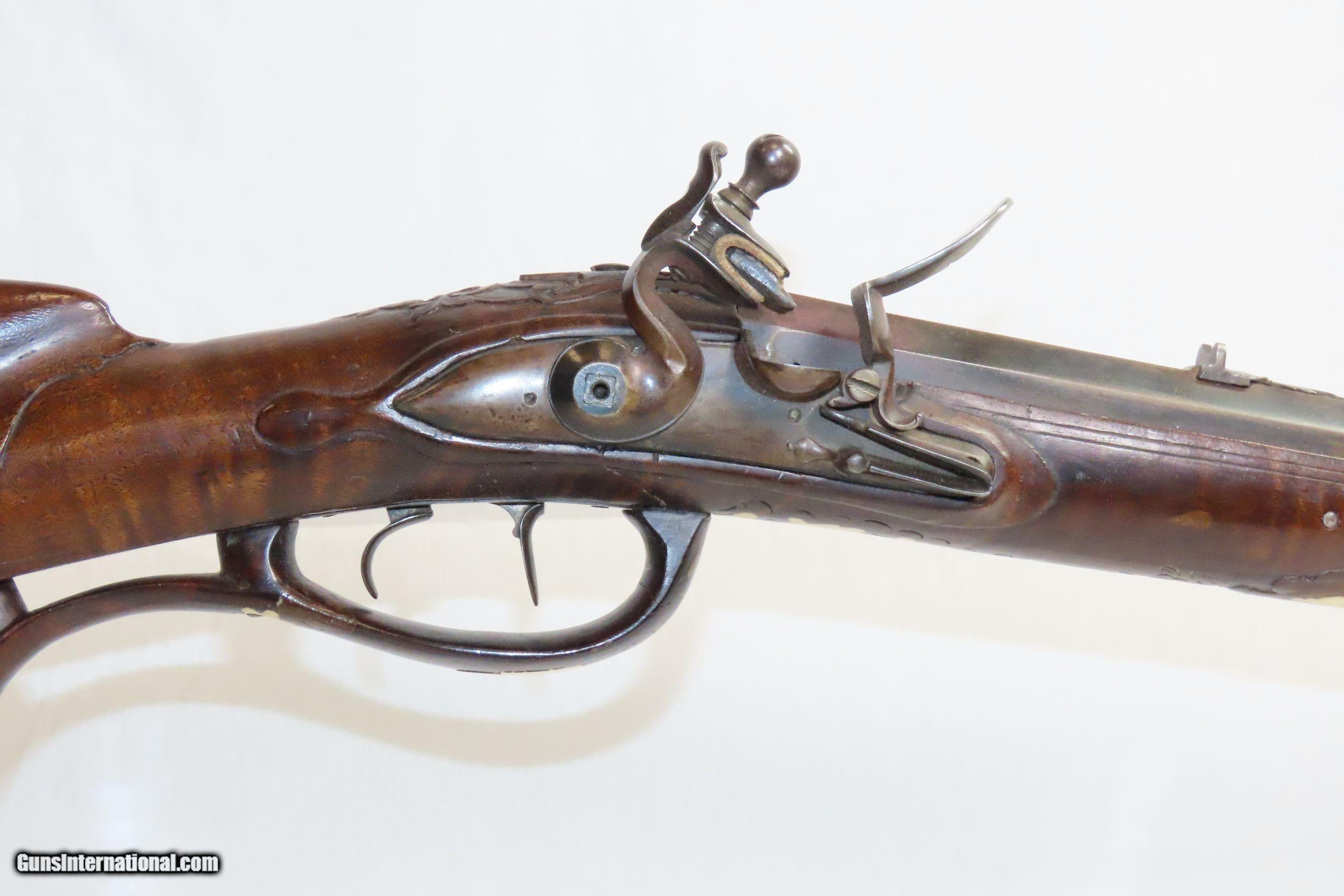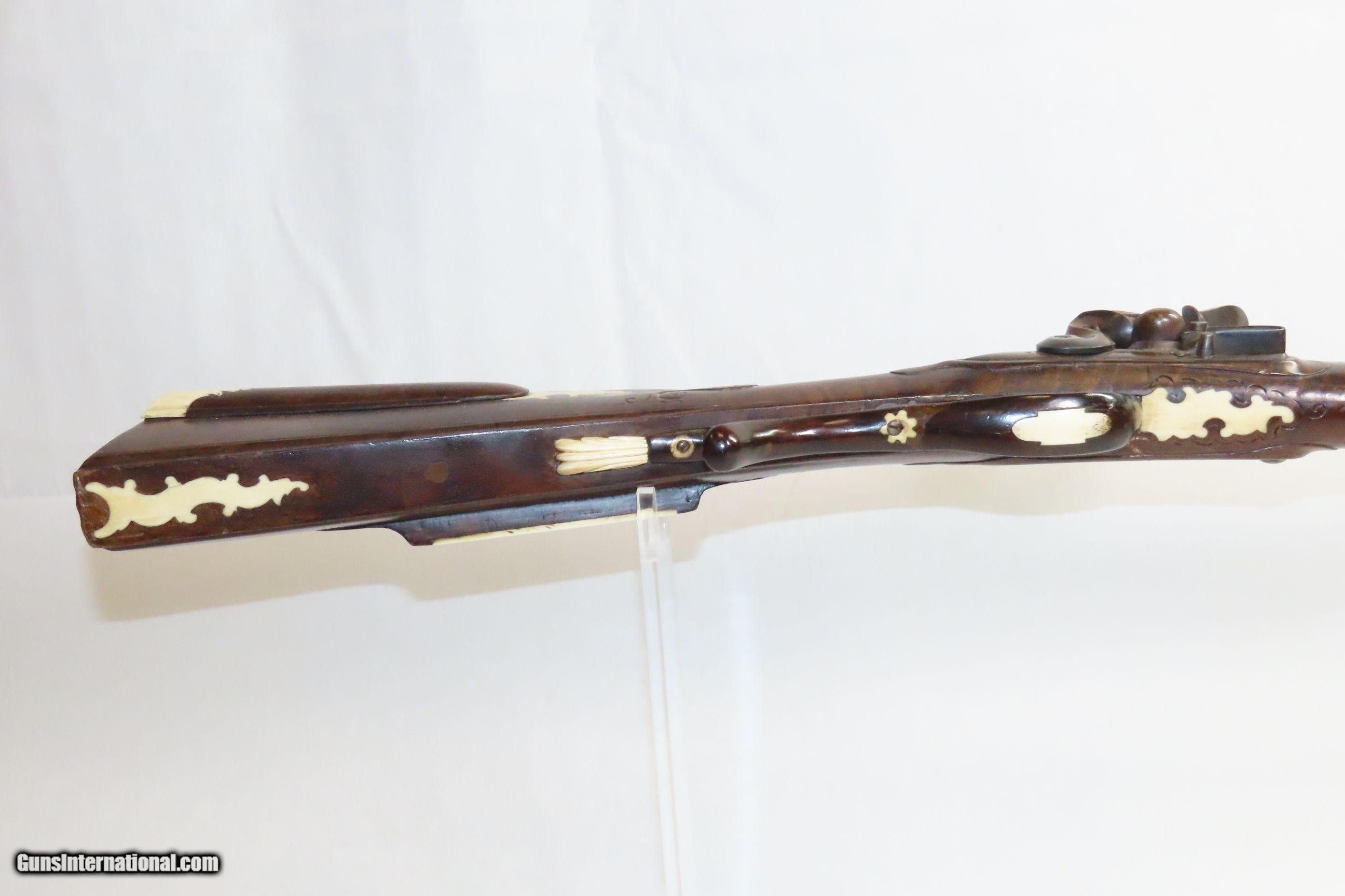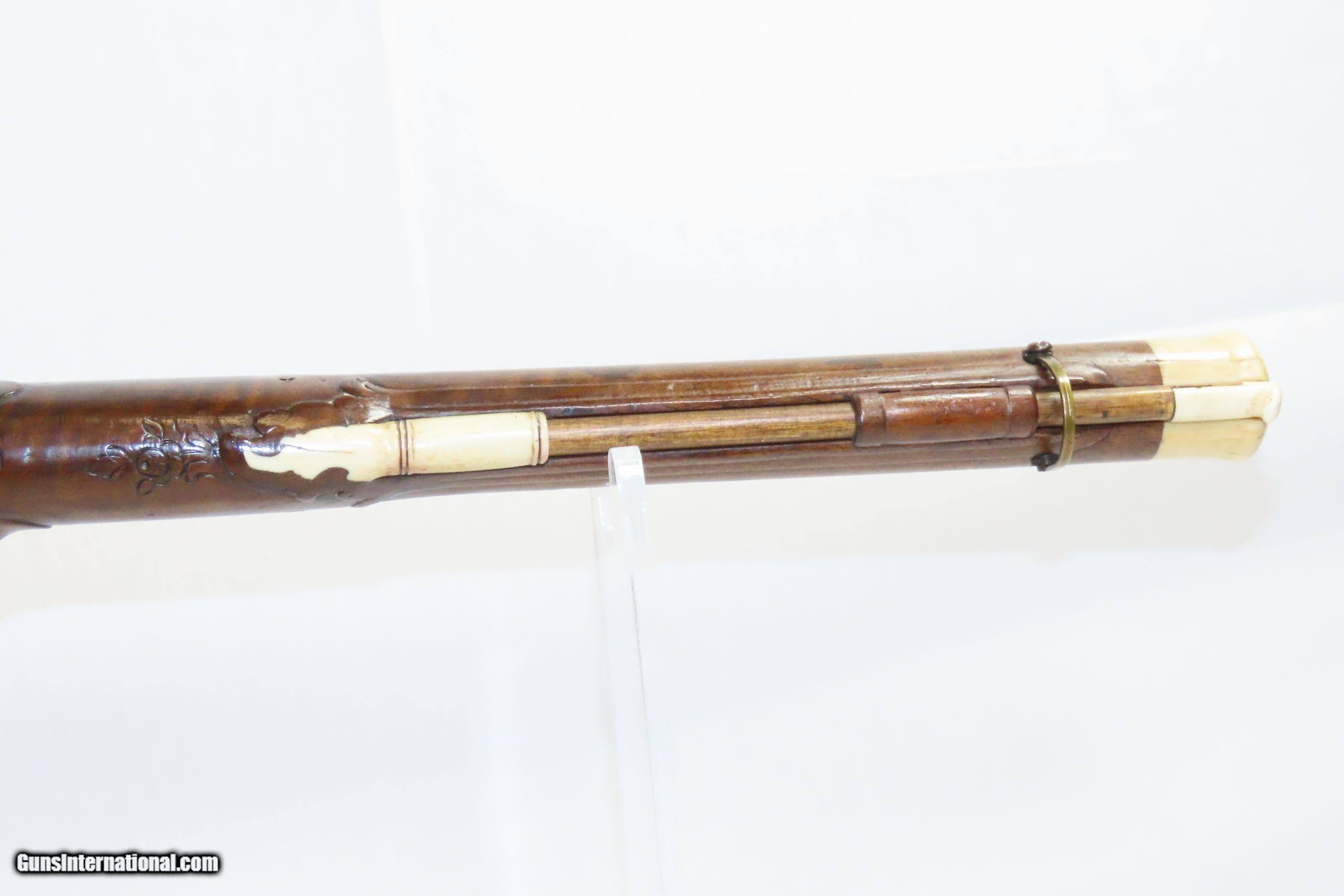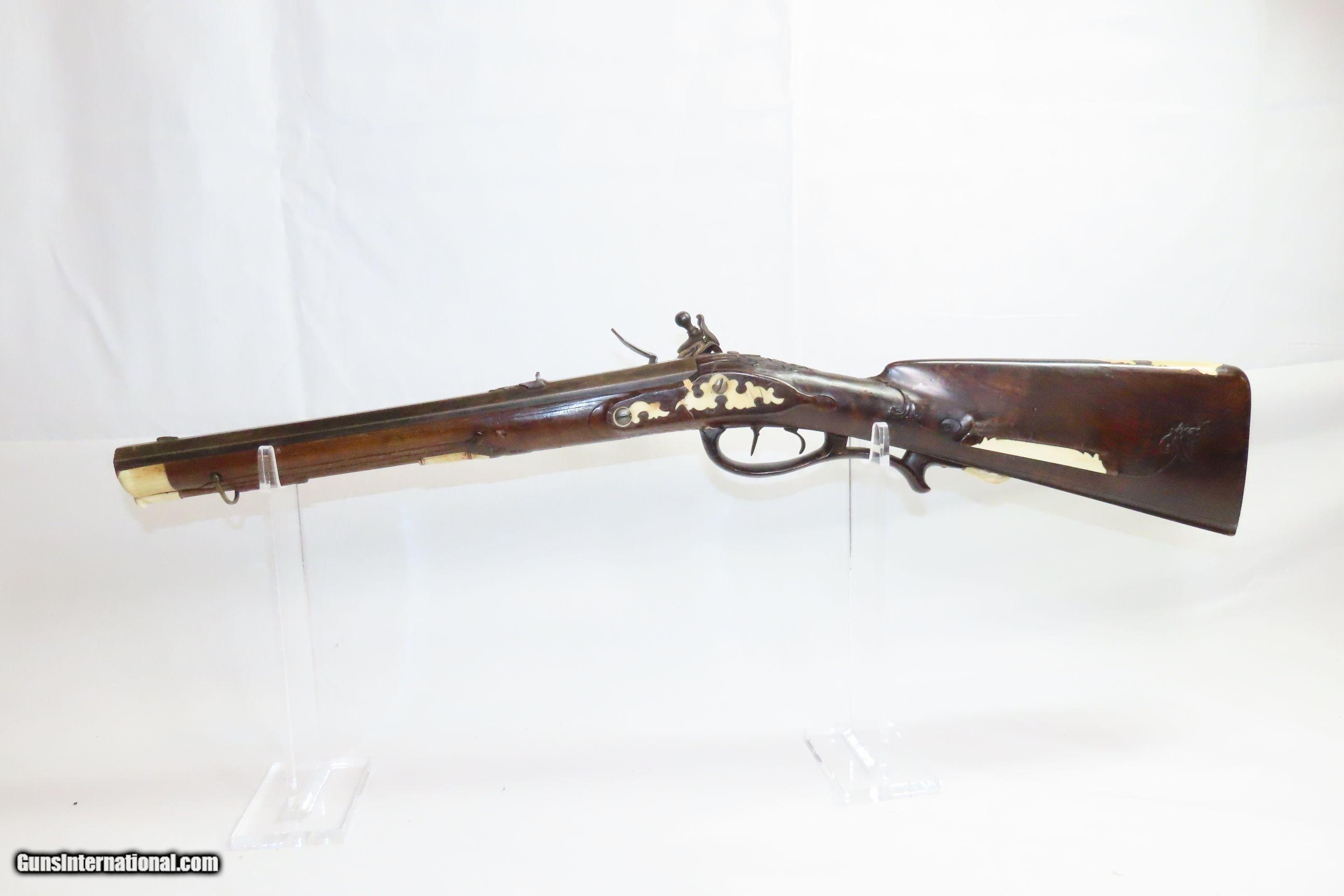 Description: 18th Century GERMANIC Antique FLINTLOCK CARBINE Stutz Rifle Carved Ivory With CARVED and INLAID STOCK Here we present an antique Germanic Stutz Flintlock Carbine, made circa the mid-18th Century. This is essentially a stocked pistol with a deeply rifled octagonal barrel that measures .475 from land to land. This was made for ease of use and handiness from the back of a horse. Like other Germanic rifles of the time, this one has a boxy stock with a sliding wooden patchbox as well as a carved wooden trigger guard. Ivory has been embedded in the stock throughout. The wood has been carved throughout including some nice scrollwork and leaf & acorn embellishments. The letter “Z” appears twice at the rear of the butt stock. The barrel is marked “PJ” or “PF” “Eichhorn”. The overall condition is good. Modestely refinished long ago. The action is excellent. The double set trigger works well and the cock and frizzen will throw a spark. The bore is in very good condition with deep and sharp rifling. The stock has been repaired around the area of the lock and remains solid. The cock screw is absent but the cock does not come off easily. A very nice and very scarce carbine from the 18th Century German States! Own the original! This is a legitimate antique and not a reproduction. Barrel is 13-5/8 inches. Caliber: .475 (land to land) Overall condition as seen in photos. Very Fast. Very Safe. FREE SHIPPING WORLDWIDE. Delivered directly to your door by express mail! Guaranteed AUTHENTIC & Includes CERTIFICATE OF AUTHENTICITY. ancestryguns $3200 #227612 SOLD Antique: Yes |