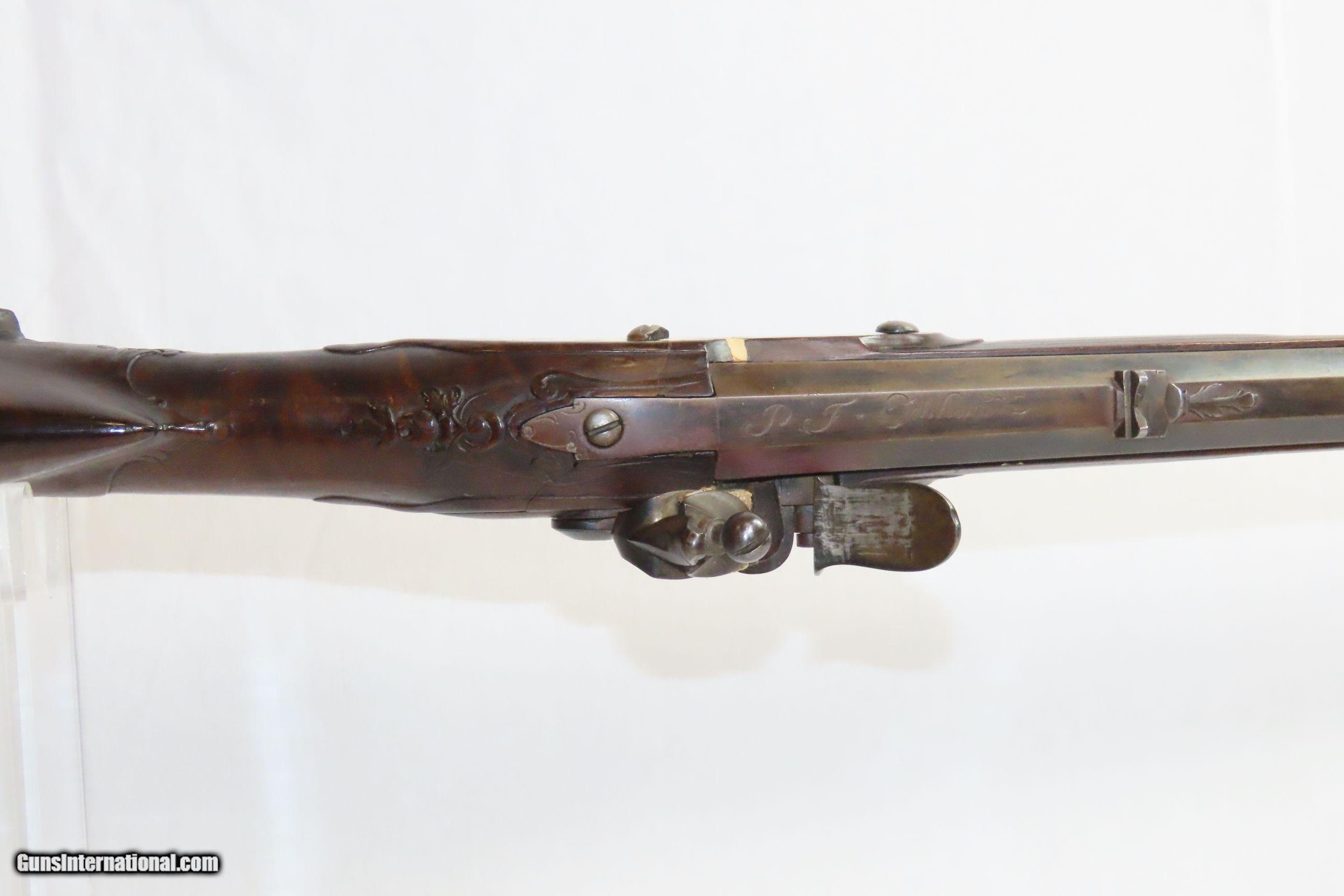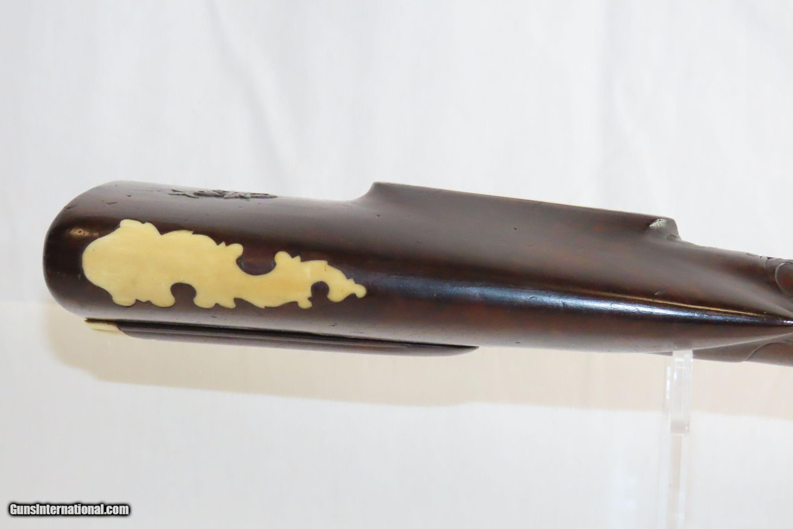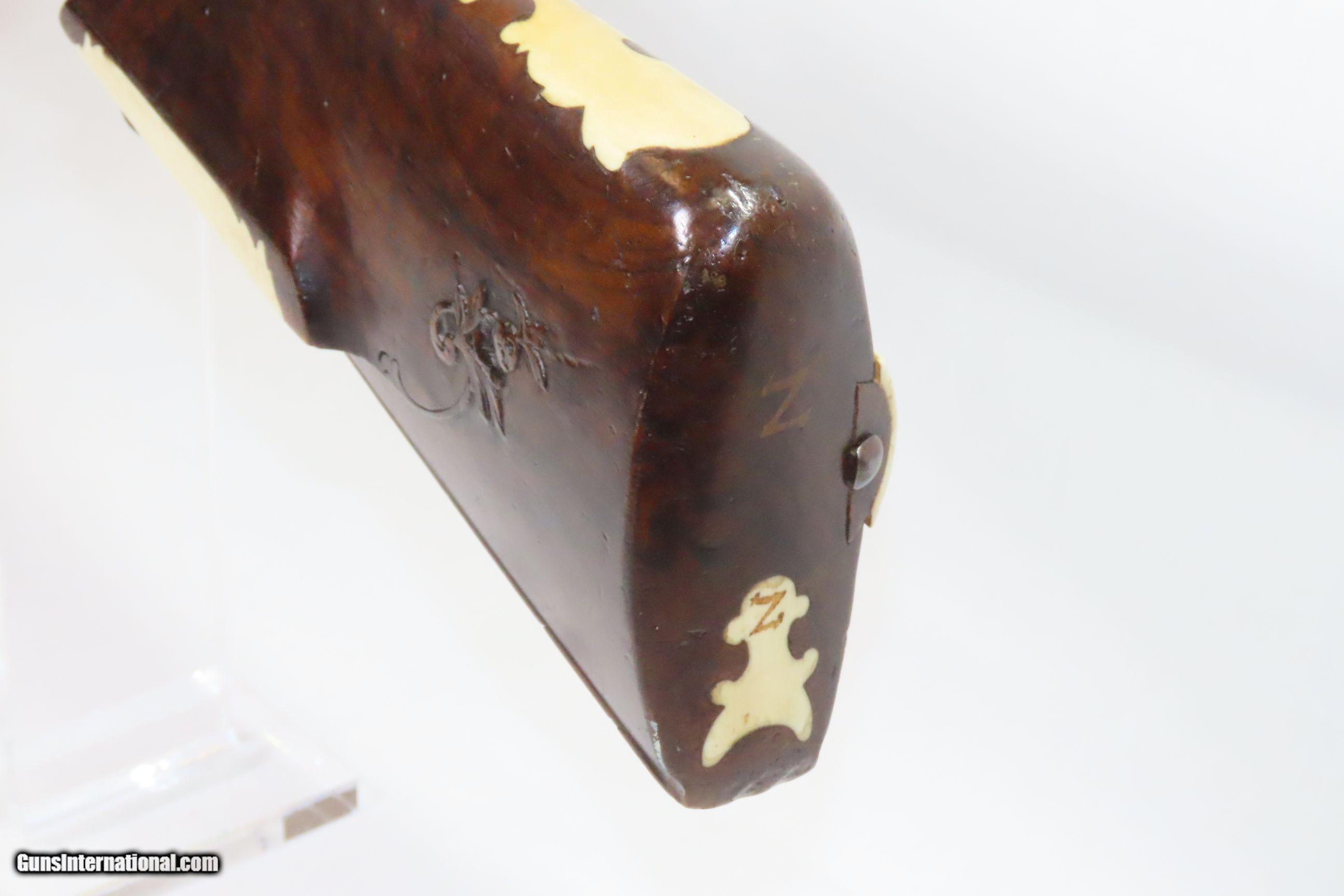 Description: 18th Century GERMANIC Antique FLINTLOCK CARBINE Stutz Rifle Carved Ivory With CARVED and INLAID STOCK Here we present an antique Germanic Stutz Flintlock Carbine, made circa the mid-18th Century. This is essentially a stocked pistol with a deeply rifled octagonal barrel that measures .475 from land to land. This was made for ease of use and handiness from the back of a horse. Like other Germanic rifles of the time, this one has a boxy stock with a sliding wooden patchbox as well as a carved wooden trigger guard. Ivory has been embedded in the stock throughout. The wood has been carved throughout including some nice scrollwork and leaf & acorn embellishments. The letter “Z” appears twice at the rear of the butt stock. The barrel is marked “PJ” or “PF” “Eichhorn”. The overall condition is good. Modestely refinished long ago. The action is excellent. The double set trigger works well and the cock and frizzen will throw a spark. The bore is in very good condition with deep and sharp rifling. The stock has been repaired around the area of the lock and remains solid. The cock screw is absent but the cock does not come off easily. A very nice and very scarce carbine from the 18th Century German States! Own the original! This is a legitimate antique and not a reproduction. Barrel is 13-5/8 inches. Caliber: .475 (land to land) Overall condition as seen in photos. Very Fast. Very Safe. FREE SHIPPING WORLDWIDE. Delivered directly to your door by express mail! Guaranteed AUTHENTIC & Includes CERTIFICATE OF AUTHENTICITY. ancestryguns $3200 #227612 SOLD Antique: Yes |
