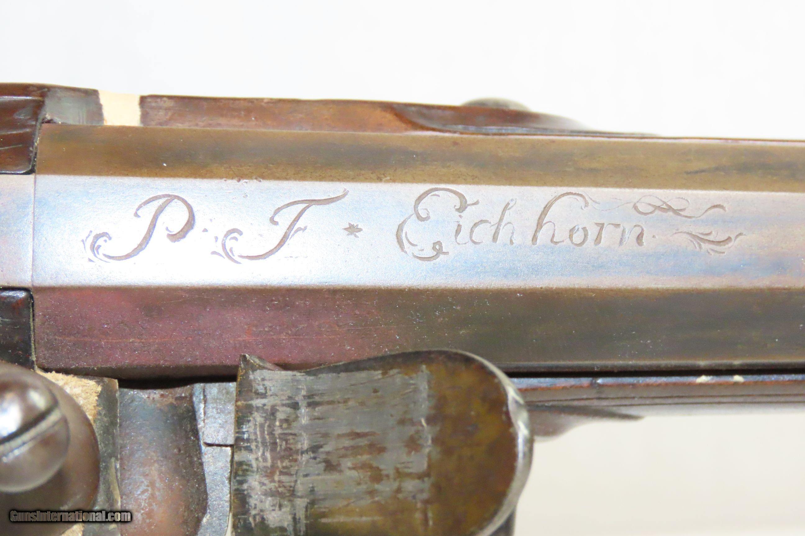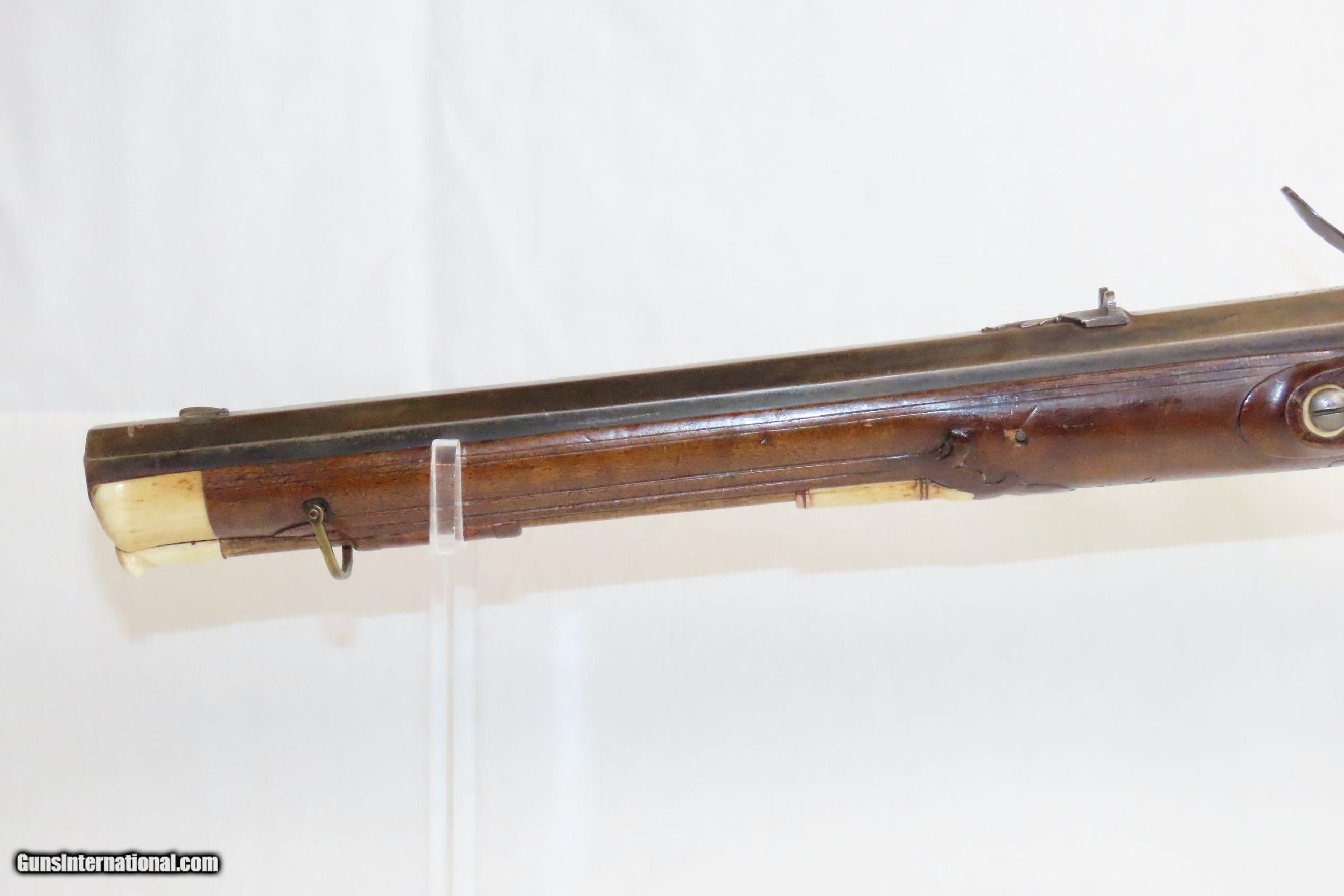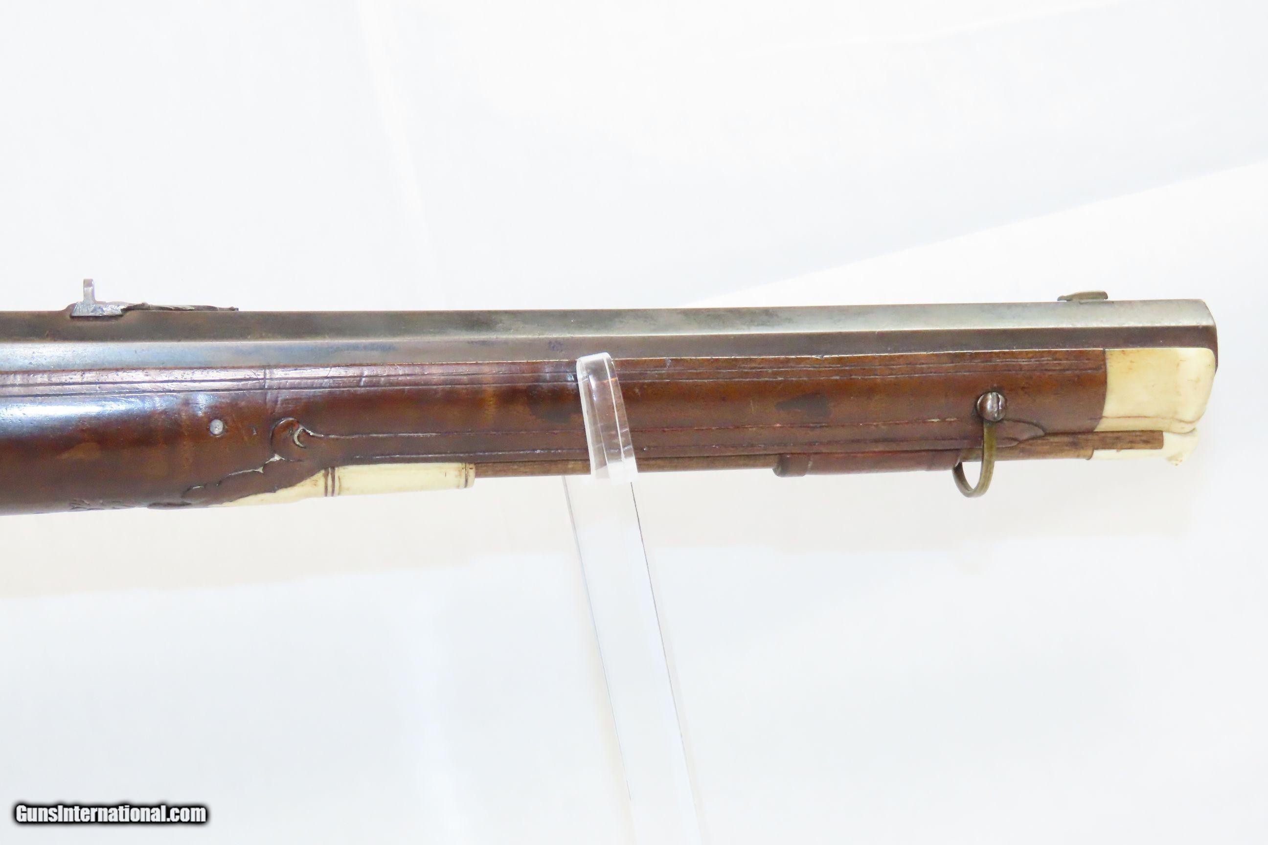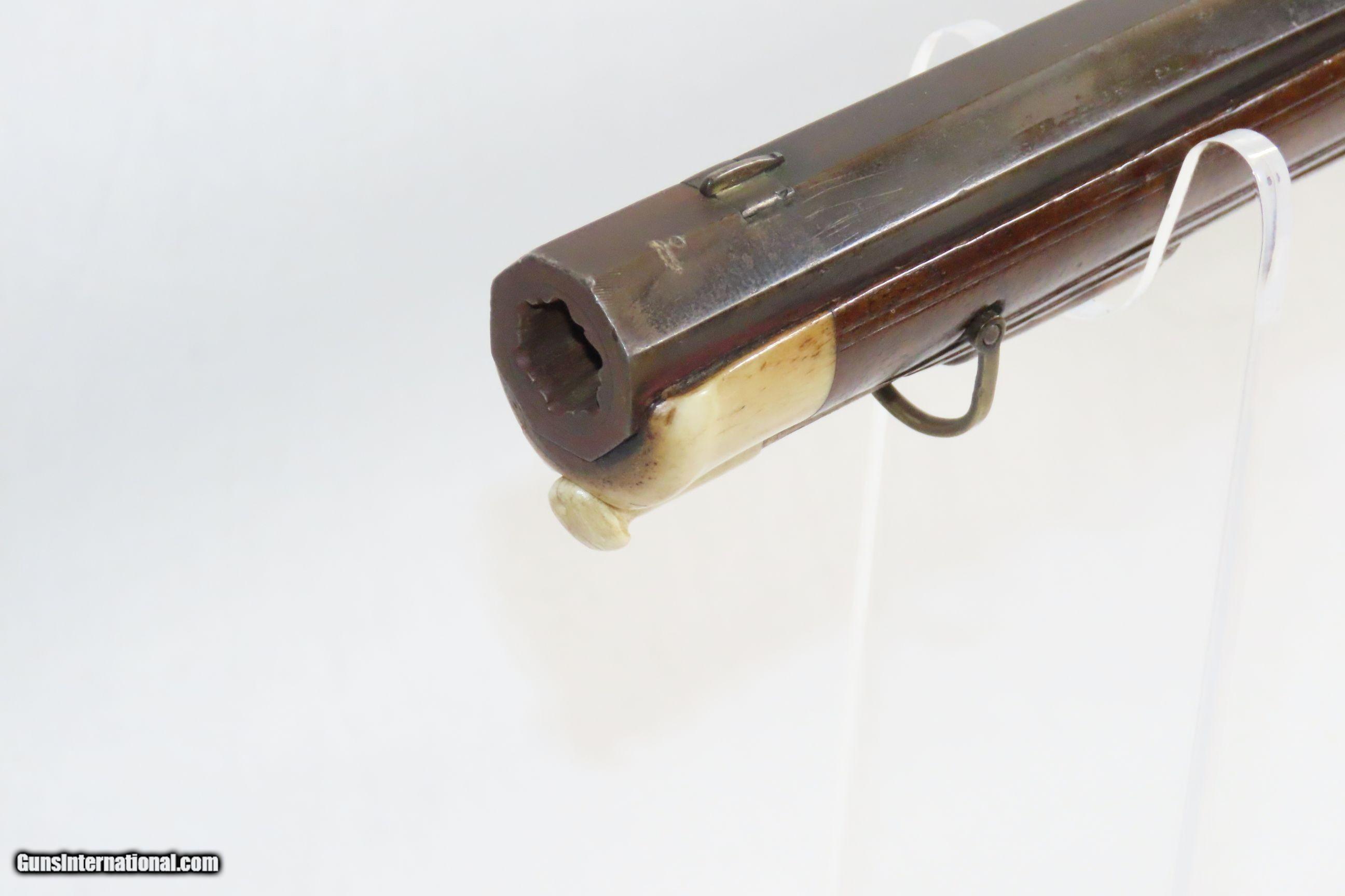Description: 18th Century GERMANIC Antique FLINTLOCK CARBINE Stutz Rifle Carved Ivory With CARVED and INLAID STOCK Here we present an antique Germanic Stutz Flintlock Carbine, made circa the mid-18th Century. This is essentially a stocked pistol with a deeply rifled octagonal barrel that measures .475 from land to land. This was made for ease of use and handiness from the back of a horse. Like other Germanic rifles of the time, this one has a boxy stock with a sliding wooden patchbox as well as a carved wooden trigger guard. Ivory has been embedded in the stock throughout. The wood has been carved throughout including some nice scrollwork and leaf & acorn embellishments. The letter “Z” appears twice at the rear of the butt stock. The barrel is marked “PJ” or “PF” “Eichhorn”. The overall condition is good. Modestely refinished long ago. The action is excellent. The double set trigger works well and the cock and frizzen will throw a spark. The bore is in very good condition with deep and sharp rifling. The stock has been repaired around the area of the lock and remains solid. The cock screw is absent but the cock does not come off easily. A very nice and very scarce carbine from the 18th Century German States! Own the original! This is a legitimate antique and not a reproduction. Barrel is 13-5/8 inches. Caliber: .475 (land to land) Overall condition as seen in photos. Very Fast. Very Safe. FREE SHIPPING WORLDWIDE. Delivered directly to your door by express mail! Guaranteed AUTHENTIC & Includes CERTIFICATE OF AUTHENTICITY. ancestryguns $3200 #227612 SOLD Antique: Yes |