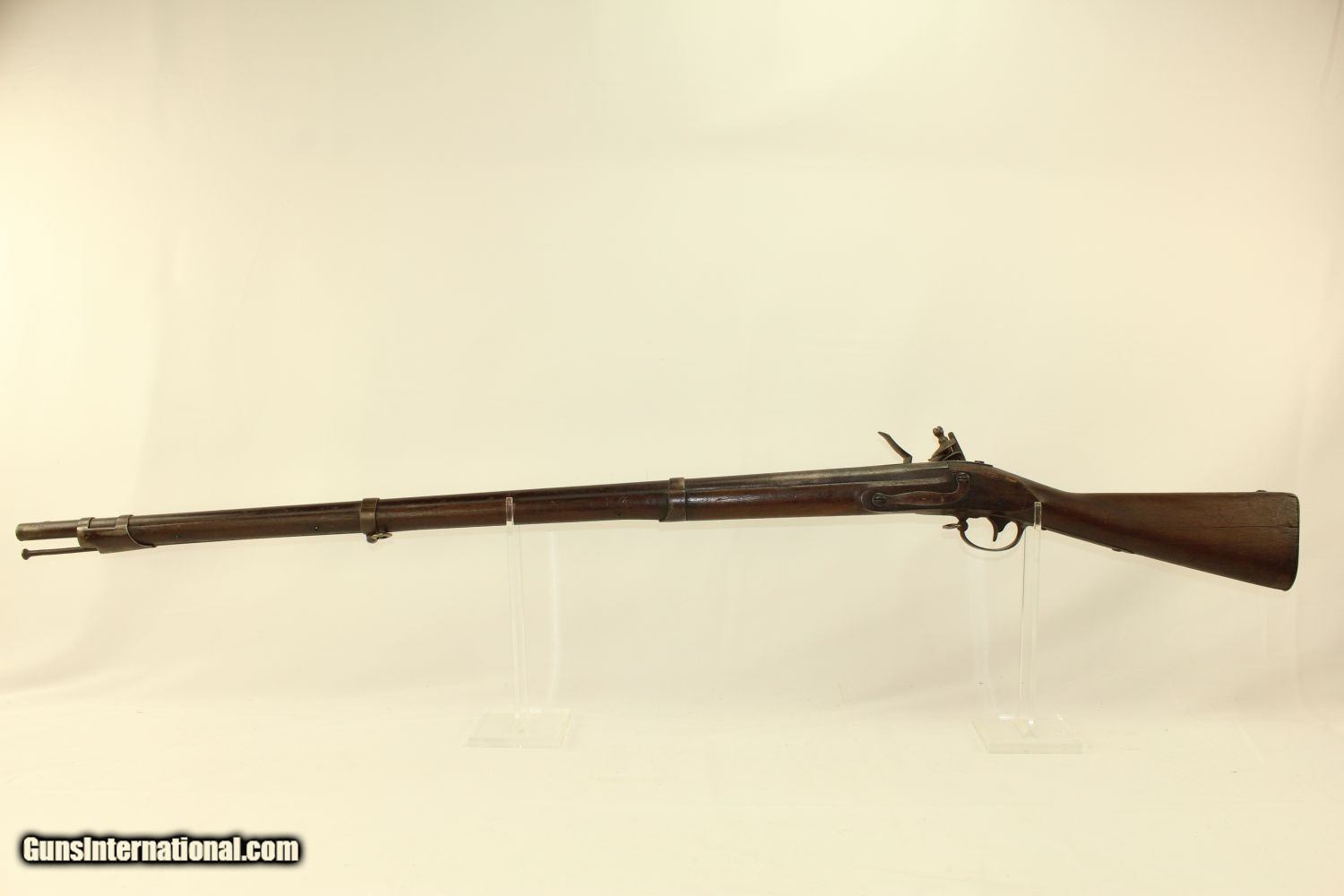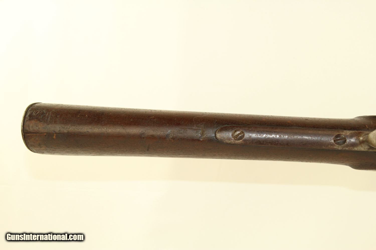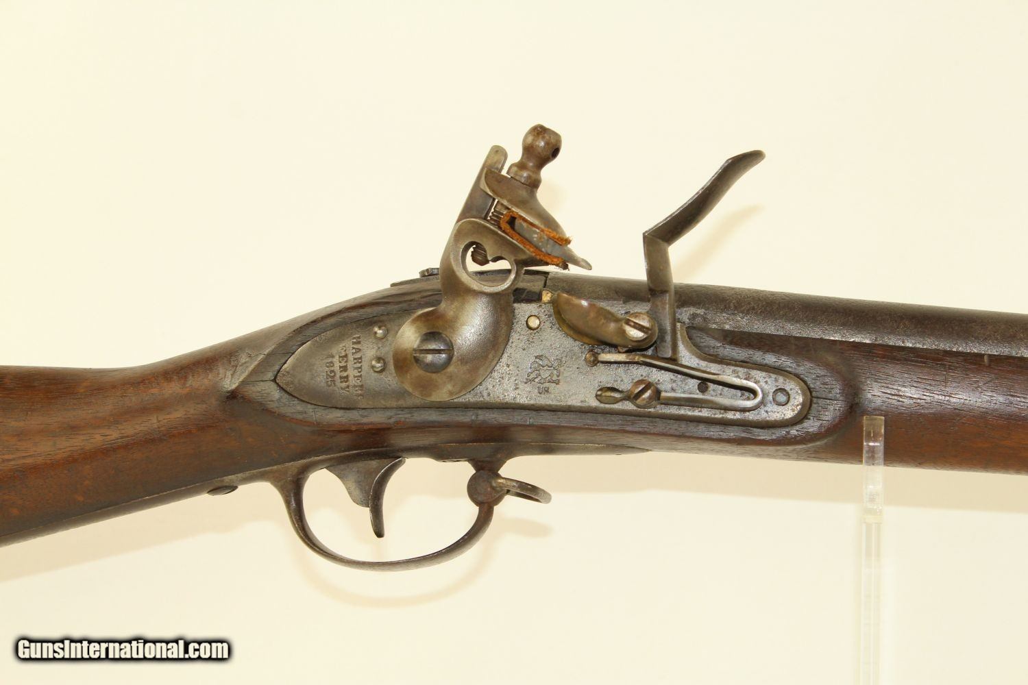 Description: Antique HARPERS FERRY Armory 1816 FLINTLOCK Musket Dated “1825”! Here we present an antique Harpers Ferry US Model 1816 Flintlock Musket, manufactured at the armory at Harpers Ferry, Virginia circa 1825. This musket was at one time updated to the percussion firing system before being converted back to flintlock. The War of 1812 revealed many weaknesses in American muskets. In an attempt to improve both the design and manufacture of the musket, the Model 1812 musket was created. The Model 1816 made further improvements, and replaced the Model 1812. Harpers Ferry became America’s second national armory after the site was personally selected by George Washington, with the Springfield Armory being the first. The U.S. Congress authorized the building of the new foundry in 1794, and by the following year, was producing hundreds of arms for the national army, which was primarily flintlock muskets and pistols. Inspired largely by the French Charleville Model 1777 musket, Harpers Ferry began producing the Model 1816. The M1816 was a smoothbore, muzzle loading weapon which used a .69 caliber musket ball. A trained shooter could fire between two and three rounds at a range of up to 200 yards per minute. The M1816 was in production at Springfield (325,000) and Harpers Ferry (350,000) between 1816 to 1844 with around 675,000 muskets produced during this run. It saw service during the Mexican-American War and was even pressed into service during the Civil War in both the updated percussion and the old flintlock format. In the 1850’s, many 1816’s went through the conversion from flintlock to percussion. Here we have a true survivor still in its original flintlock state! The tail of the lock is marked “HARPERS/FERRY/1825”. The overall condition is good. The bore is smooth and quite dusty. The action remains strong. Own the original! This is a legitimate antique and not a reproduction. Barrel is 42 inches. Caliber: .69 Overall condition as seen in photos. Very Fast. Very Safe. FREE SHIPPING WORLDWIDE. Delivered directly to your door by express mail! Guaranteed AUTHENTIC & Includes CERTIFICATE OF AUTHENTICITY. ancestryguns $2100 #190309 SOLD Antique: Yes |