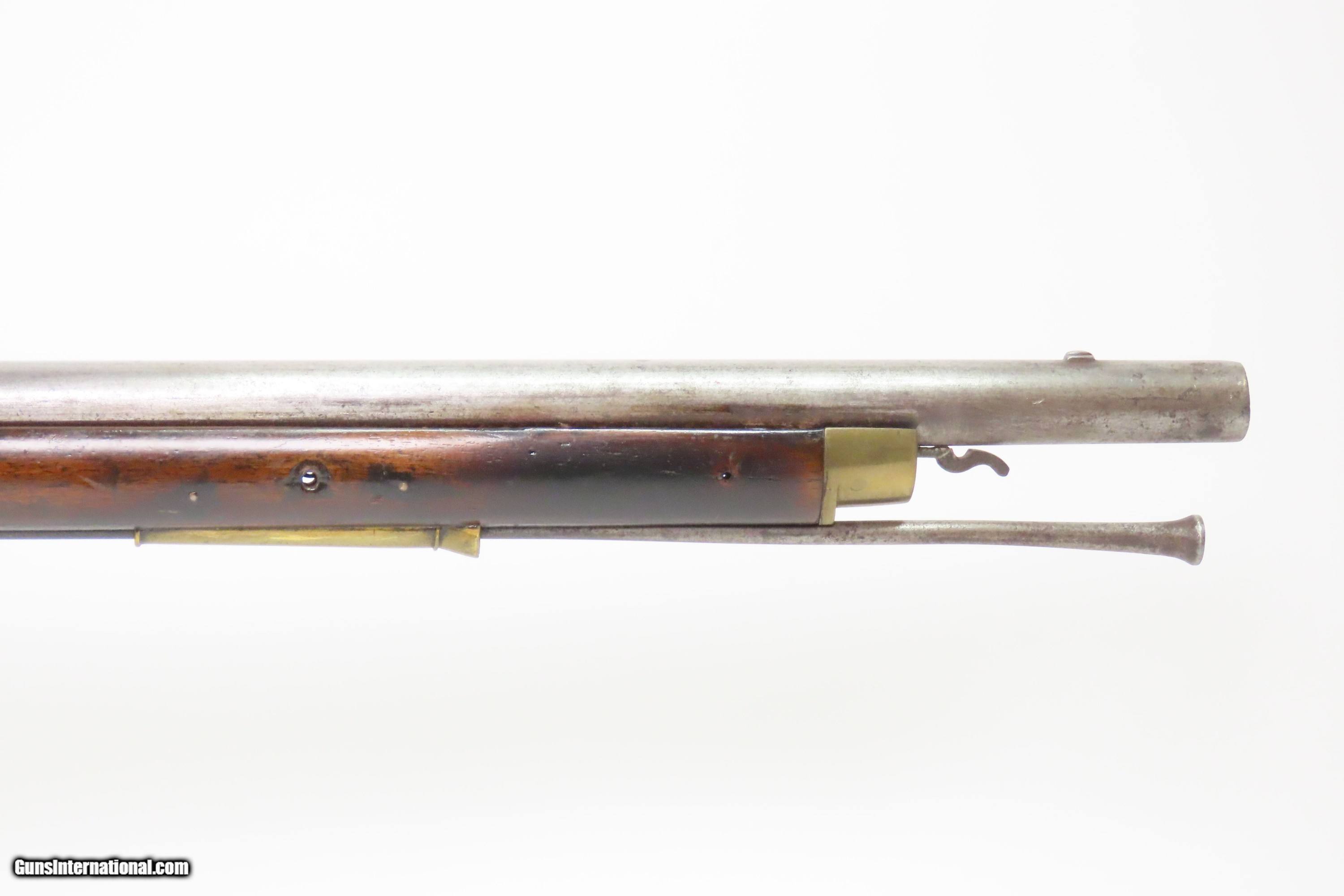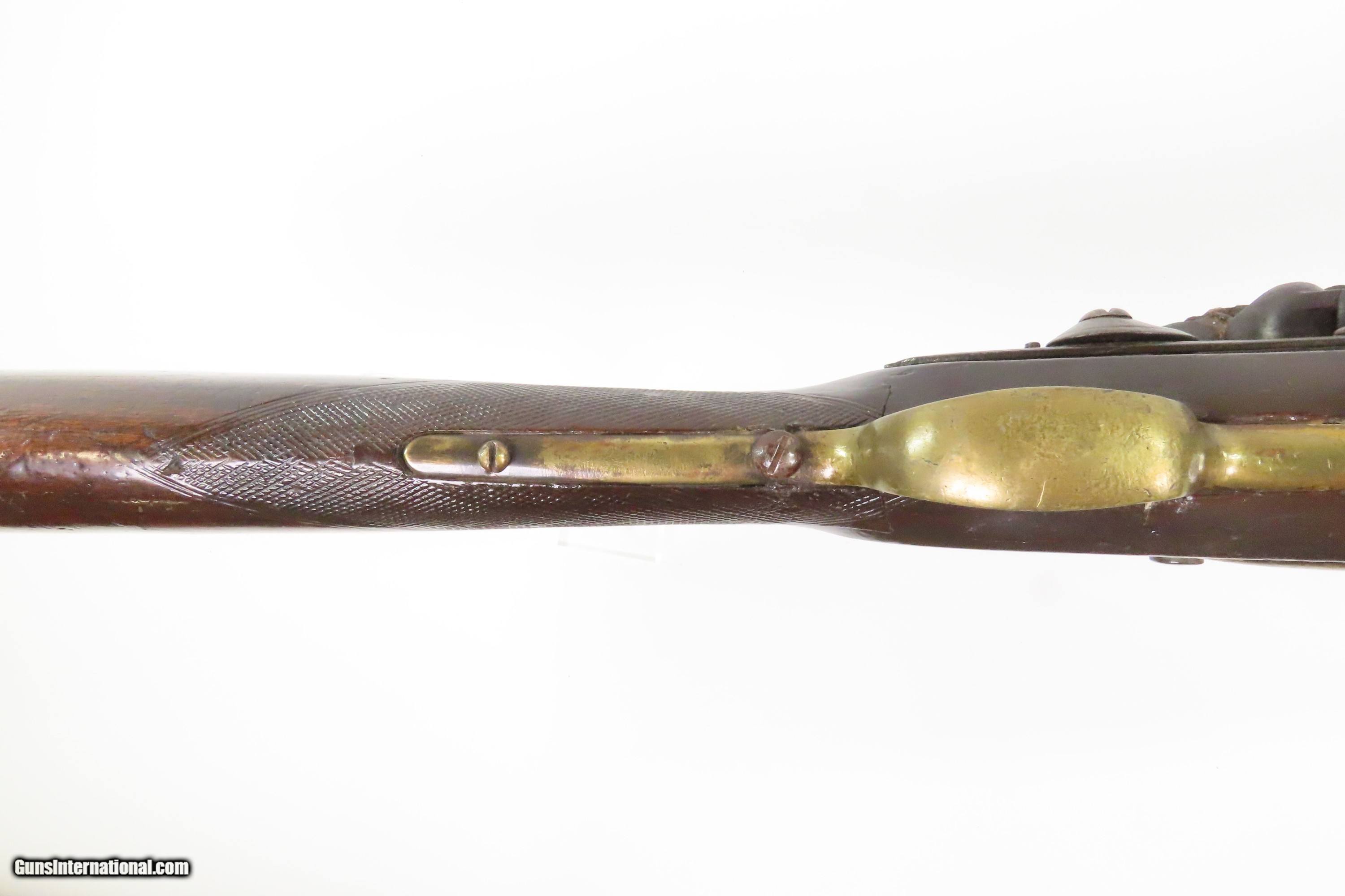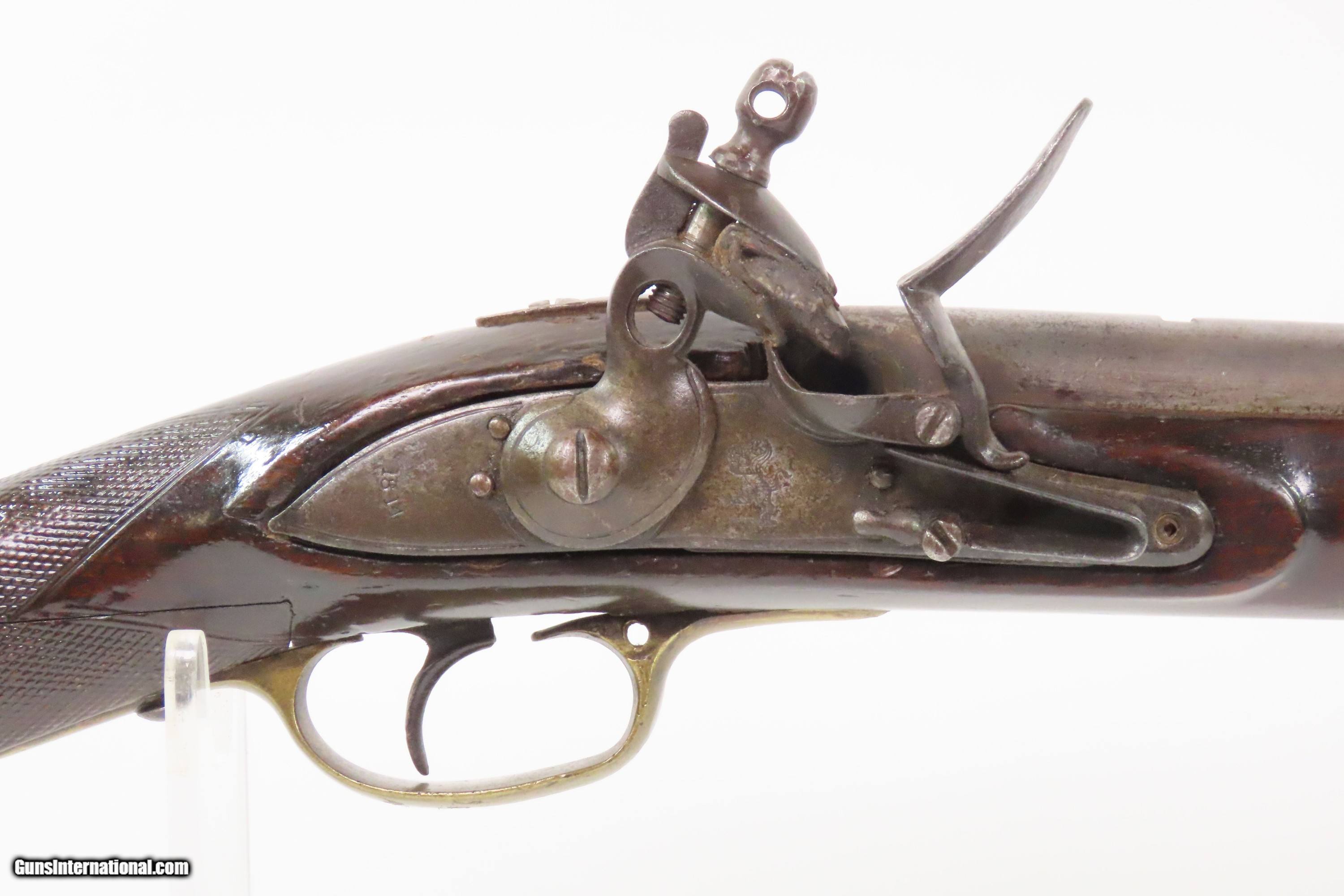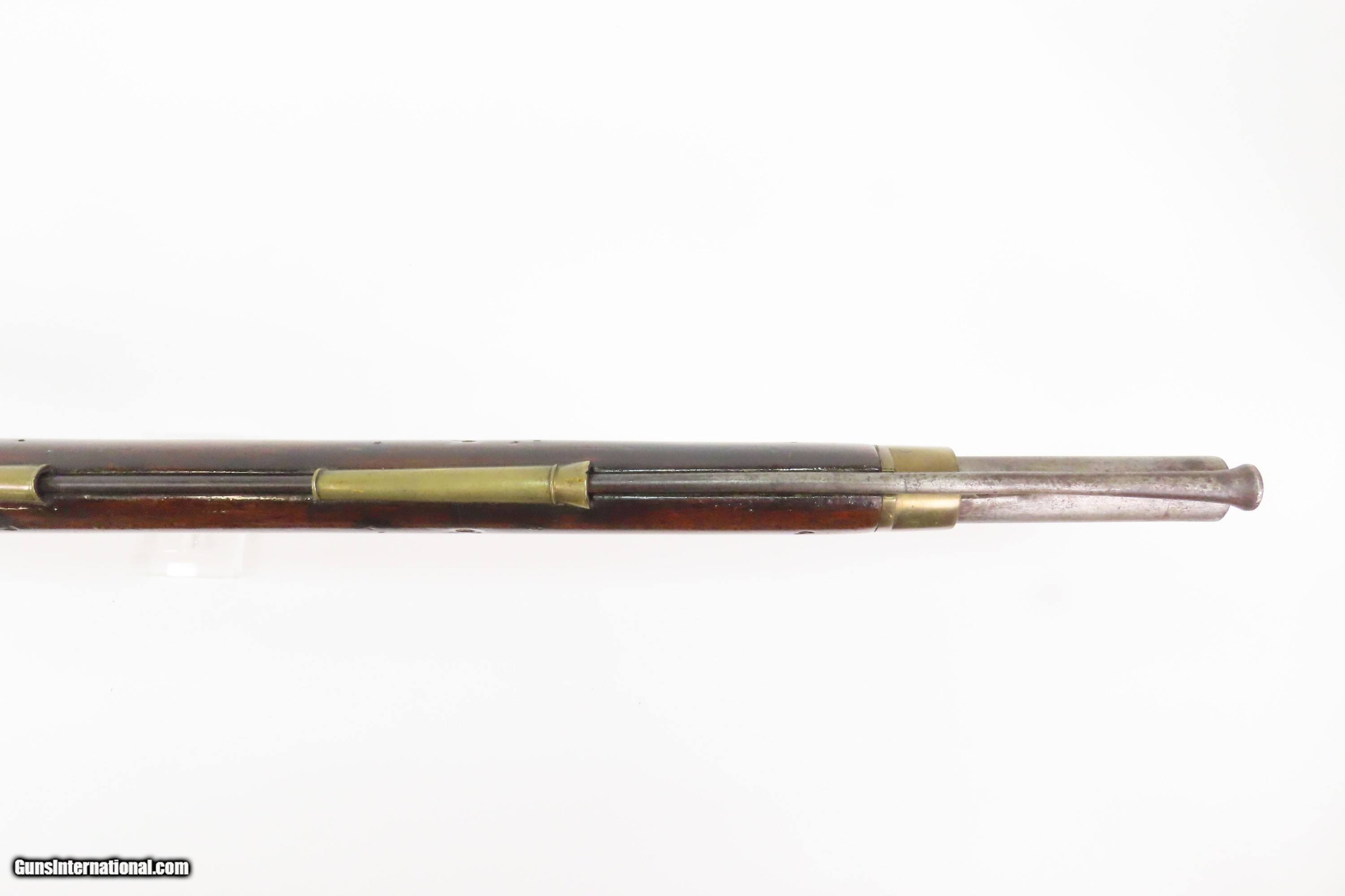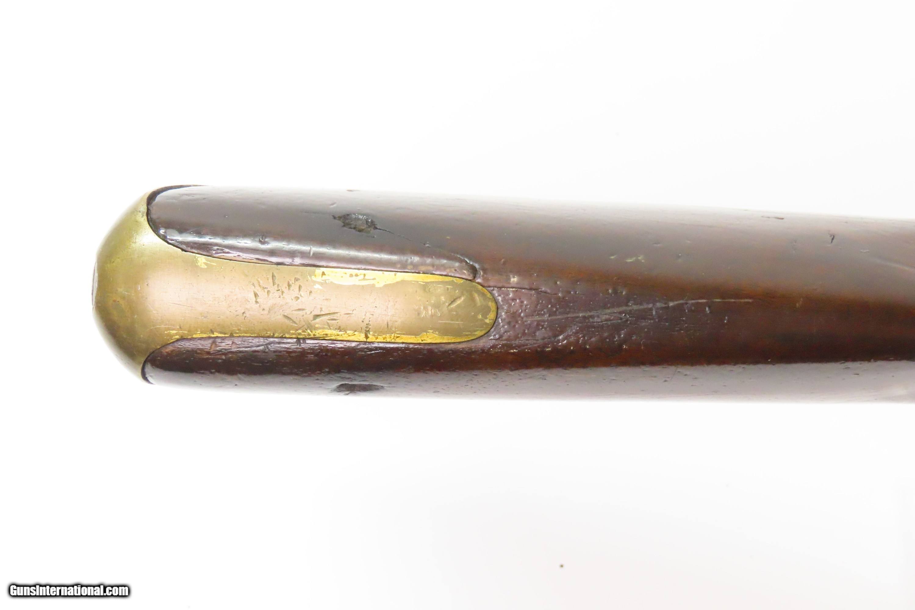 Description: BRITISH 1814 Dated EAST INDIA Co Marked BROWN BESS Pattern Flintlock Musket With “RAMPANT LION holding CROWN” Logo Here we present an antique British East India Company marked Flintlock Musket, made circa 1814. It features the rampant lion and crown emblem of the Honourable East India Company, "1814" at the tail of the lock, with London proofs. This musket would have served at some point with the East India Company early and well into the 19th Century. It is possible that it was witness to the Indian Mutiny in 1857. This musket shows signs of use well after it was made obsolete, likely in the British colonies. This pattern of Brown Bess is the same that fought Napoleon Bonaparte in numerous iconic battles, as well as the United States and their American Indian Allies during the War of 1812. This pattern may also correctly be called the “India Pattern” since the Honorable East India Company was the entity responsible for this update to the gun that had been around since 1722. When war with France loomed on the horizon, the British Board of Ordnance diverted these muskets from the EIC contract to supply the war effort. The success of this model can be gauged by the fact that between 1793 and 1815, nearly 3,000,000 guns were produced. Although the Birmingham gun trade was responsible for the majority of the production, the London gun trade played a part, through gun makers such as Ezekial Baker, William Parker, Thomas Reynolds, and Durs Egg. According to the London proof-house records, they and others in London were responsible for producing 845,477 muskets. Bright gray barrel patina. The action functions. The wrist has been repaired on an otherwise good stock. The bore is good for its age. The barrel pins are missing which allows the barrel to separate from the forend. The lock is not properly affixed. The trigger guard is cracked at the screw and is easily removed. Some movement is present at the wrist repair. This example is reconverted. Own the original! This is a legitimate antique and not a reproduction. Barrel is 39 inches. Caliber: .75 Flintlock Overall condition as seen in photos. Very Fast. Very Safe. FREE SHIPPING WORLDWIDE. Delivered directly to your door by express mail! Guaranteed AUTHENTIC & Includes CERTIFICATE OF AUTHENTICITY. ancestryguns $1200 #247186 SOLD Antique: Yes |