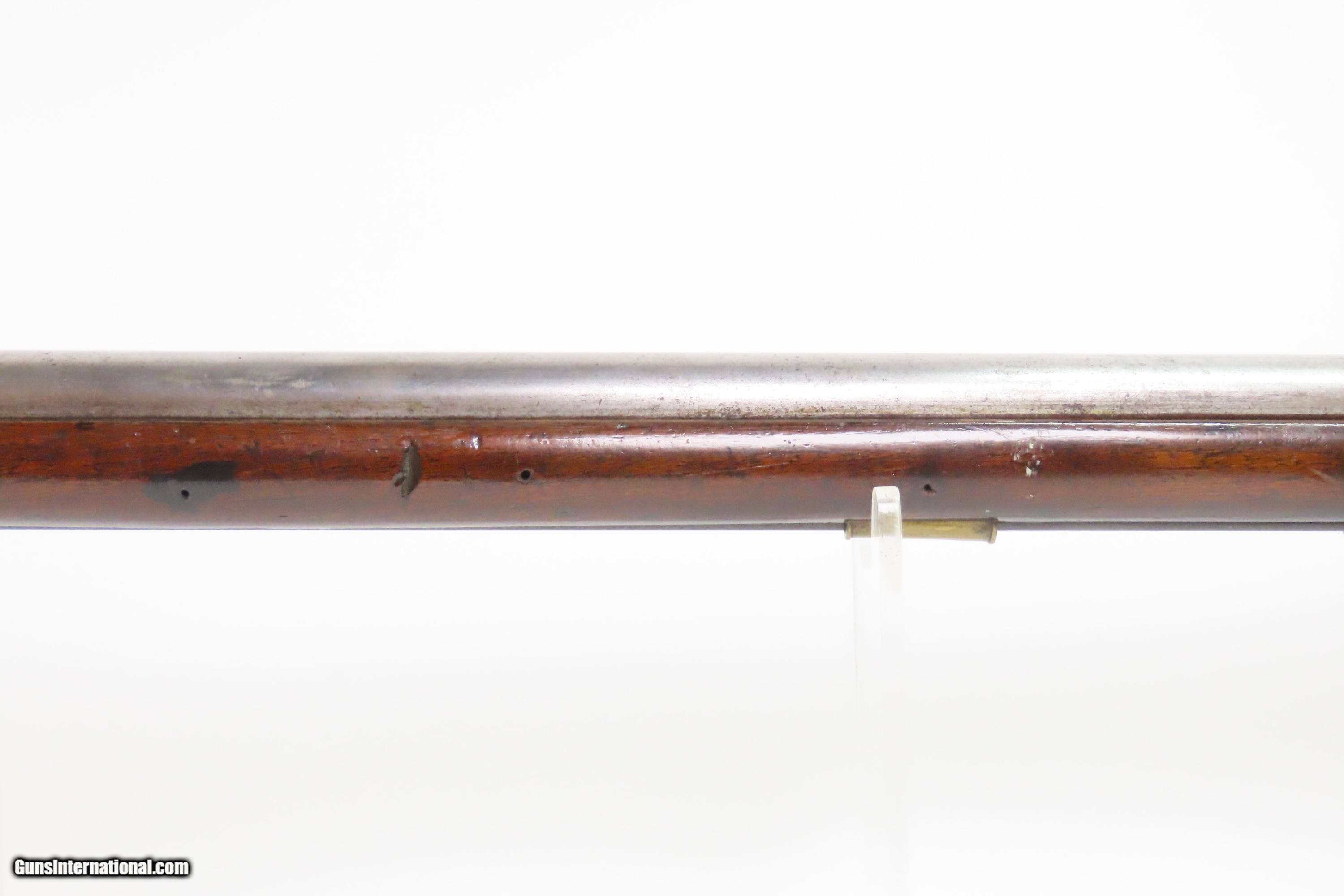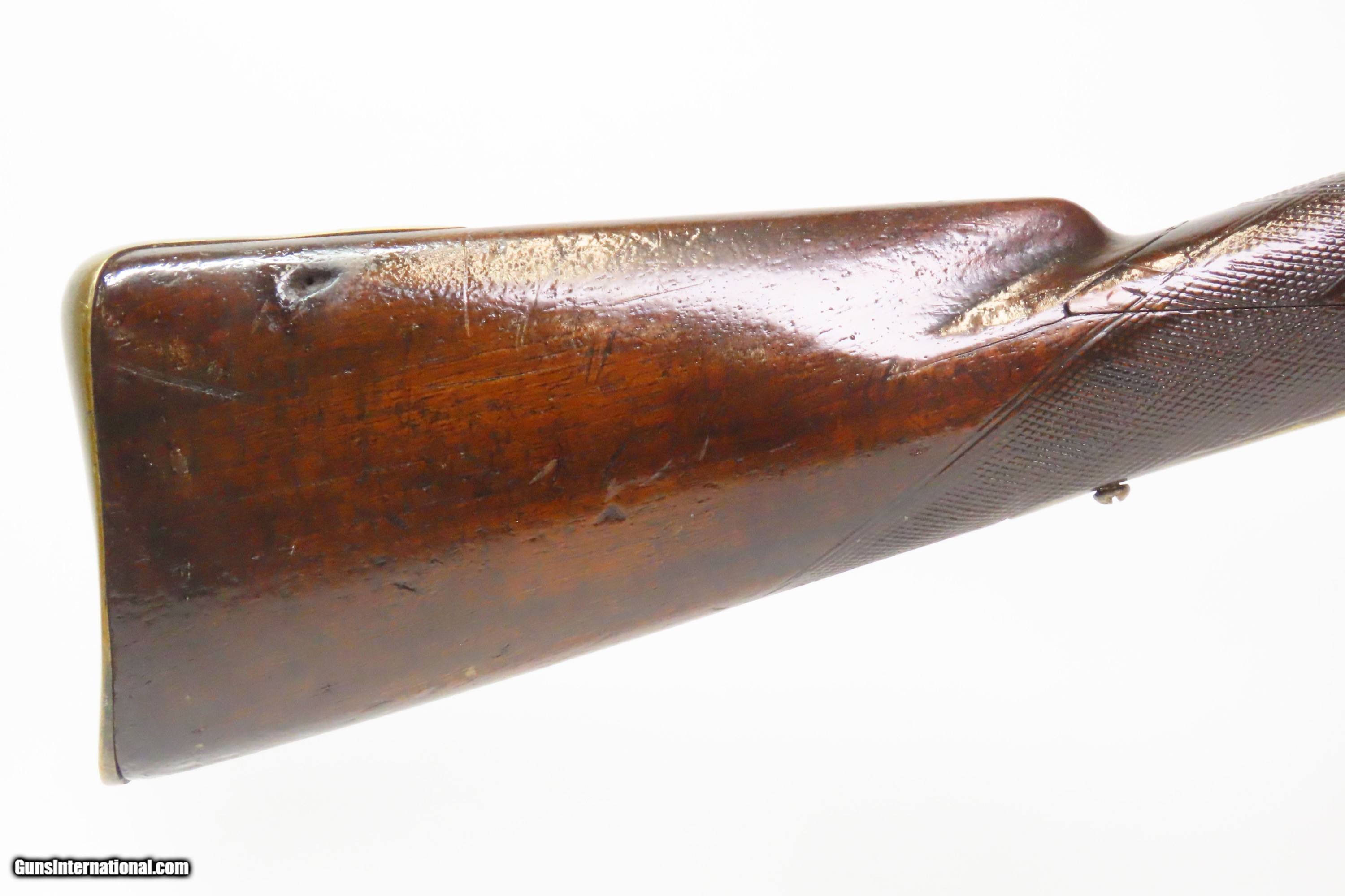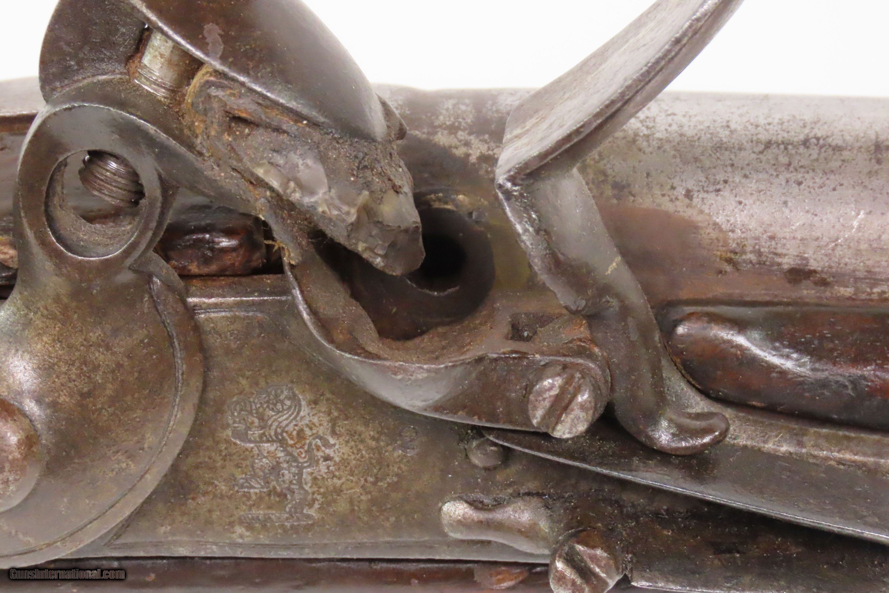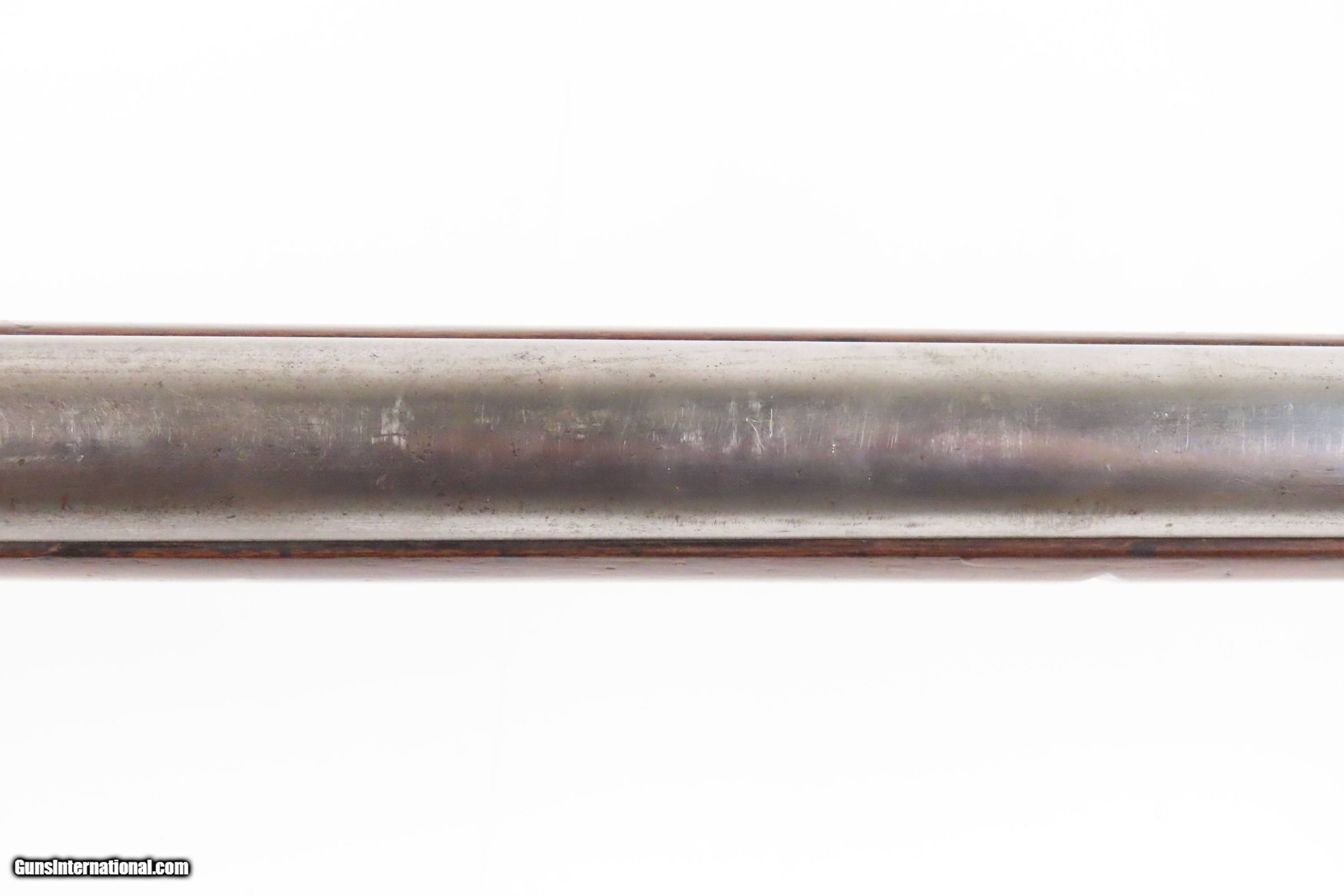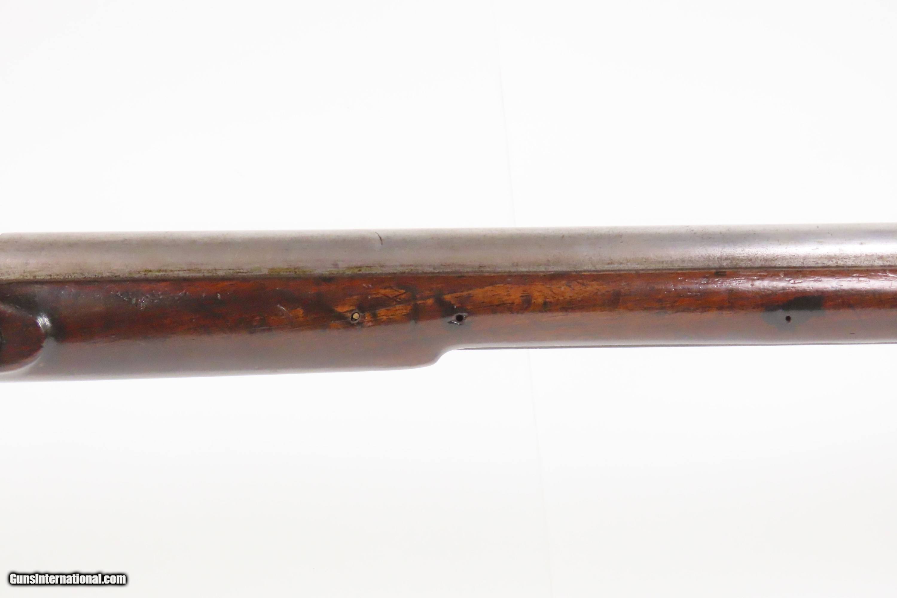 Description: BRITISH 1814 Dated EAST INDIA Co Marked BROWN BESS Pattern Flintlock Musket With “RAMPANT LION holding CROWN” Logo Here we present an antique British East India Company marked Flintlock Musket, made circa 1814. It features the rampant lion and crown emblem of the Honourable East India Company, "1814" at the tail of the lock, with London proofs. This musket would have served at some point with the East India Company early and well into the 19th Century. It is possible that it was witness to the Indian Mutiny in 1857. This musket shows signs of use well after it was made obsolete, likely in the British colonies. This pattern of Brown Bess is the same that fought Napoleon Bonaparte in numerous iconic battles, as well as the United States and their American Indian Allies during the War of 1812. This pattern may also correctly be called the “India Pattern” since the Honorable East India Company was the entity responsible for this update to the gun that had been around since 1722. When war with France loomed on the horizon, the British Board of Ordnance diverted these muskets from the EIC contract to supply the war effort. The success of this model can be gauged by the fact that between 1793 and 1815, nearly 3,000,000 guns were produced. Although the Birmingham gun trade was responsible for the majority of the production, the London gun trade played a part, through gun makers such as Ezekial Baker, William Parker, Thomas Reynolds, and Durs Egg. According to the London proof-house records, they and others in London were responsible for producing 845,477 muskets. Bright gray barrel patina. The action functions. The wrist has been repaired on an otherwise good stock. The bore is good for its age. The barrel pins are missing which allows the barrel to separate from the forend. The lock is not properly affixed. The trigger guard is cracked at the screw and is easily removed. Some movement is present at the wrist repair. This example is reconverted. Own the original! This is a legitimate antique and not a reproduction. Barrel is 39 inches. Caliber: .75 Flintlock Overall condition as seen in photos. Very Fast. Very Safe. FREE SHIPPING WORLDWIDE. Delivered directly to your door by express mail! Guaranteed AUTHENTIC & Includes CERTIFICATE OF AUTHENTICITY. ancestryguns $1200 #247186 SOLD Antique: Yes |