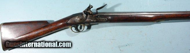 Description: BRITISH GEORGE III WINDUS PATTERN E.I.C. BROWN BESS FLINTLOCK MUSKET BY GOFF DATED 1793. .78 cal. 39” smoothbore sighted barrel. Extra nice example in original flint configuration and not a reconversion. Beautiful barrel markings with nice E.I.C. “HEART/4” and “GOFF-1793” in large engraved lettering and with George III Ordnance proofs at the left breech. Lovely original medium grey metal patina. These saw long service all the way into the mid 1800’s and this one is arsenal date stamped “1849” at the breech as well. Lock plate with East India Company “HEART/4” engraved at the tail. Stock with most of the original finish and a very crisp “CROWN/EW” Ordnance Inspector cartouche for Col. Edward Windus. Period of use repair to the forend wood near the muzzle which is very old probably dating to the 1849 date stamp. Superior condition overall and with the original ramrod. Scarce. SOLD Antique: Yes |