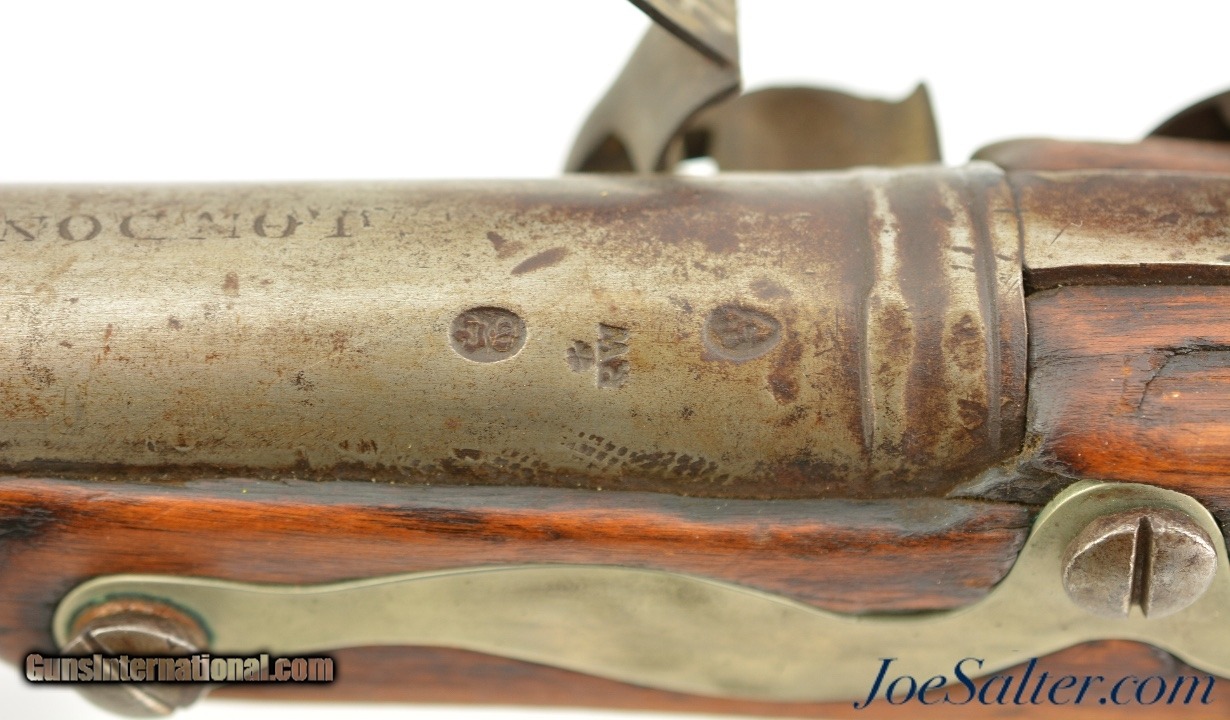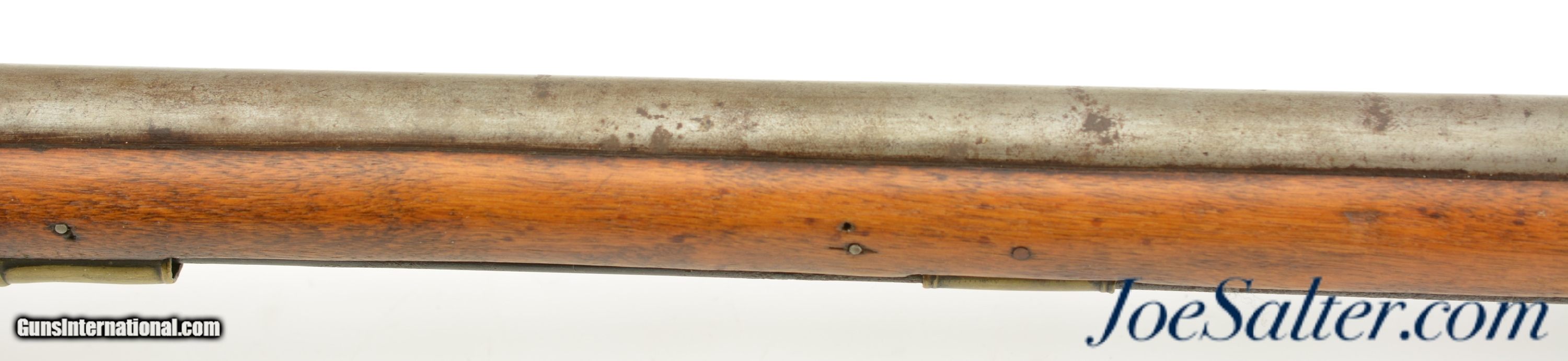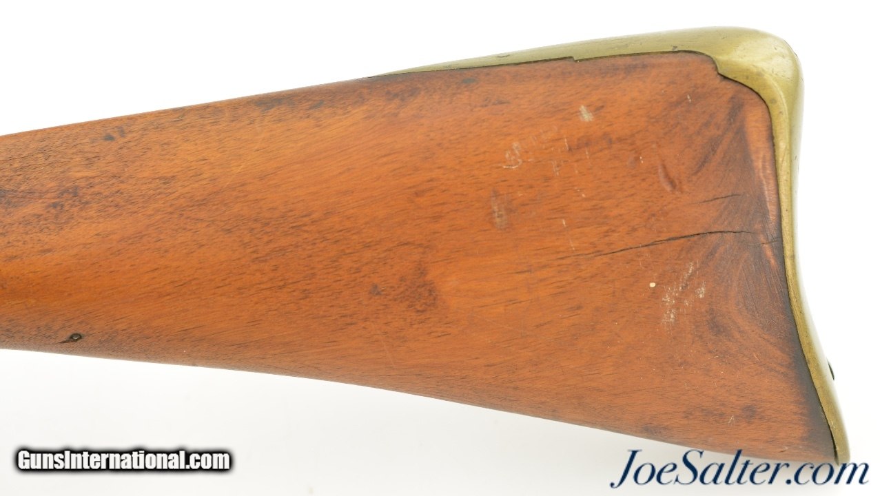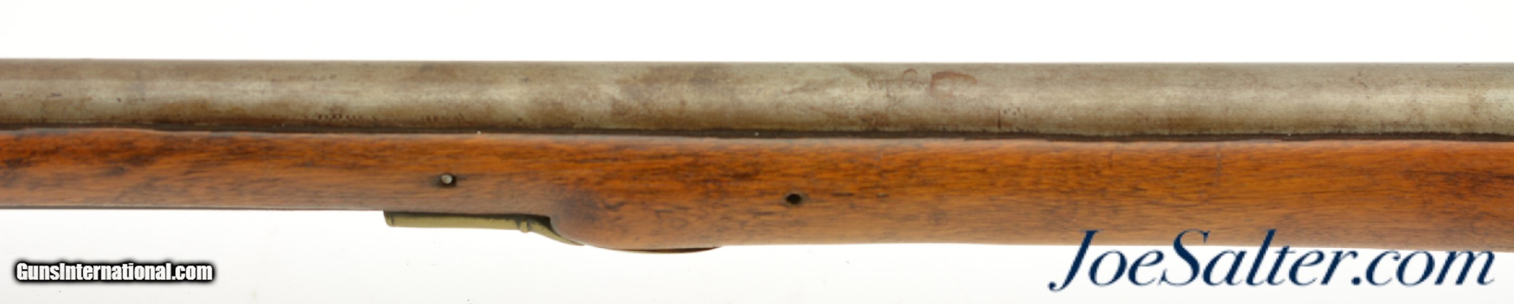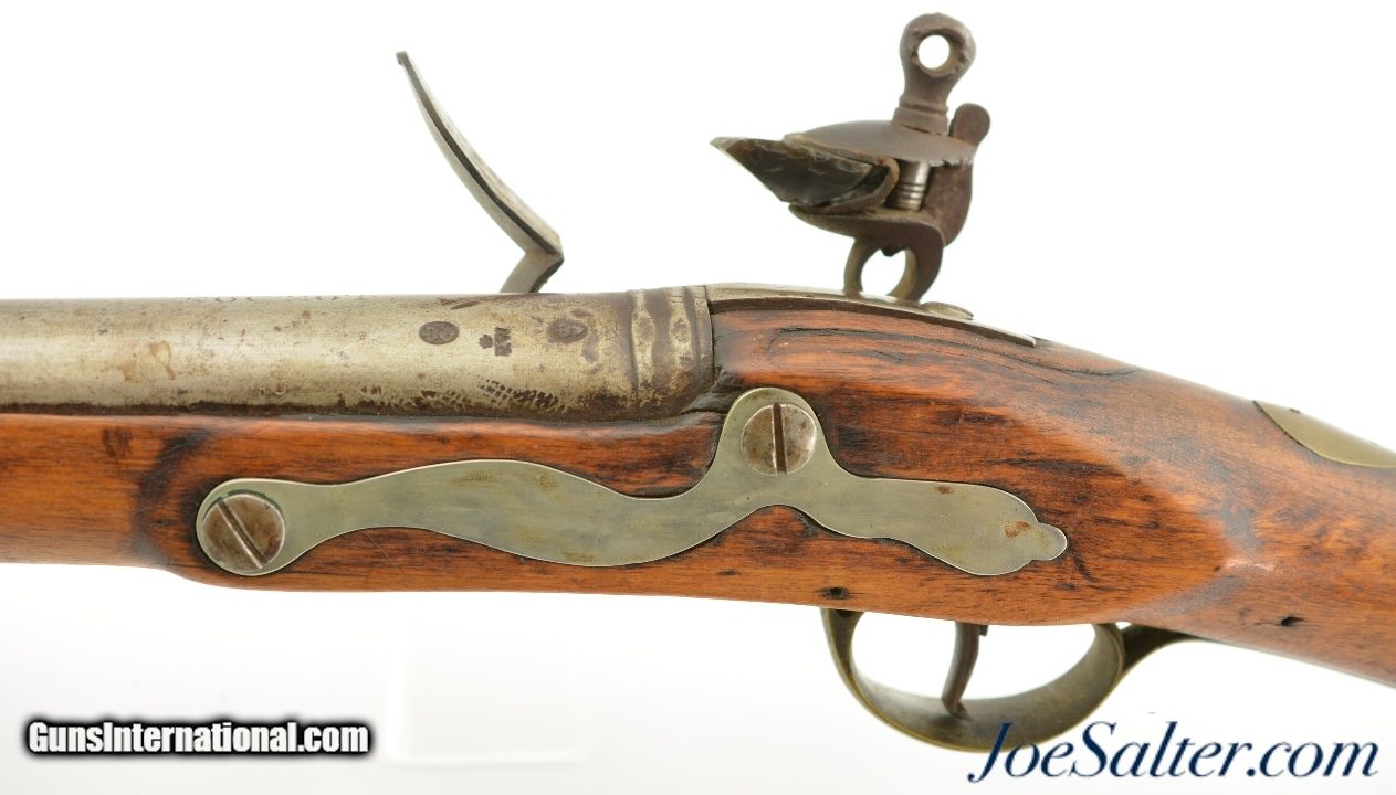 Description: NSN, .75 Caliber, 46" barrel with an about good, pitted bore. This is a "TOWER" and "(Crown only)" marked musket that has London commercial proofs at the breech of the "LONDON" marked barrel, and a 2nd Type India Pattern lock. The barrel has a mottled pewter gray patina with scattered spots of plum-brown that darkens at the breech. The lock has a mostly dark brown patina with traces of silvering along the high and exposed edges, and there is oxidation inside the pan and around the vent. The pin-fastened stock has numerous small handling marks and blemishes scattered about the sanded and reapplied finish, with chips in the wood along the forend where the sling bail used be installed (the rear sling swivel is also missing. Some stable drying cracks are also present on either side of the buttstock. The brass furniture has developed a dark ochre patina, with darker spots scattered about the metal, although the sideplate is nickel silver and has a pale, frosted appearance. The metal ramrod is heavily pitted at the tip, and the lock is fully functional, locking firmly at both half and full-cock. This is a nice looking "Brown Bess" type musket with an original 46" barrel, and is in good-near very good condition overall. Antique; Antique: Yes Price: $2,495.00 Contact Seller |