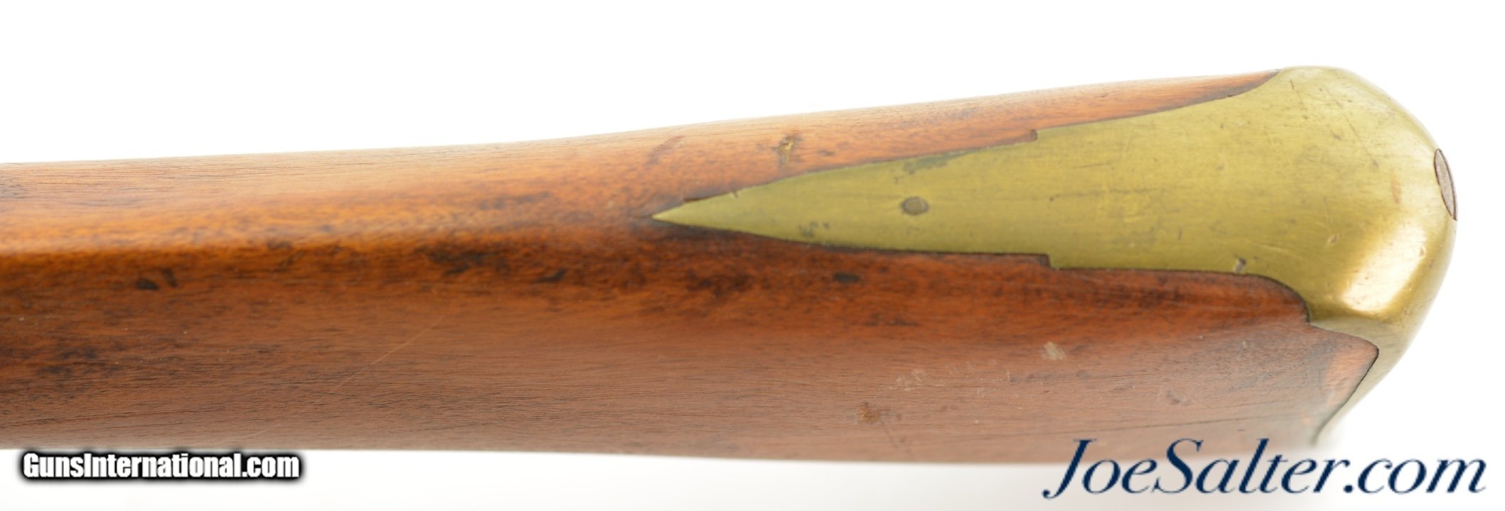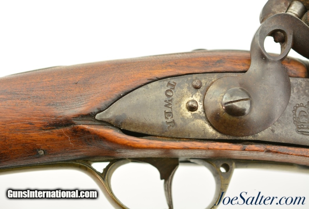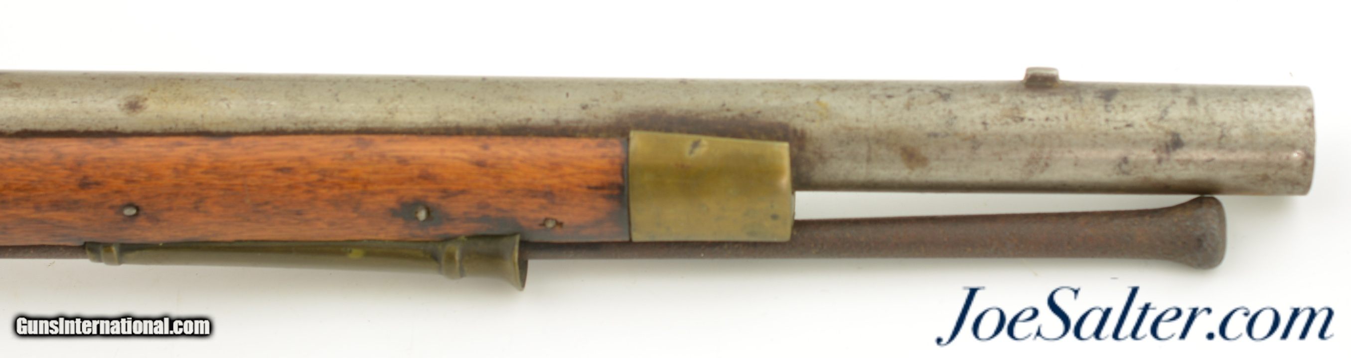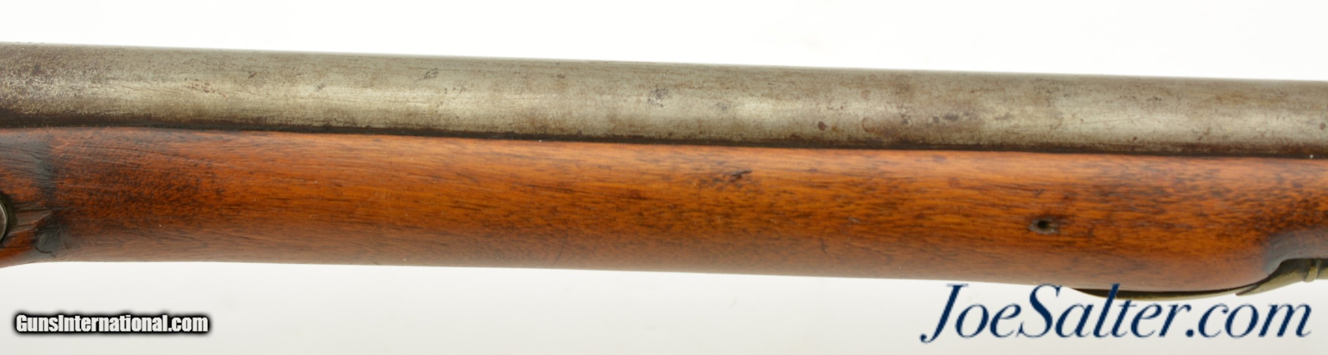 Description: NSN, .75 Caliber, 46" barrel with an about good, pitted bore. This is a "TOWER" and "(Crown only)" marked musket that has London commercial proofs at the breech of the "LONDON" marked barrel, and a 2nd Type India Pattern lock. The barrel has a mottled pewter gray patina with scattered spots of plum-brown that darkens at the breech. The lock has a mostly dark brown patina with traces of silvering along the high and exposed edges, and there is oxidation inside the pan and around the vent. The pin-fastened stock has numerous small handling marks and blemishes scattered about the sanded and reapplied finish, with chips in the wood along the forend where the sling bail used be installed (the rear sling swivel is also missing. Some stable drying cracks are also present on either side of the buttstock. The brass furniture has developed a dark ochre patina, with darker spots scattered about the metal, although the sideplate is nickel silver and has a pale, frosted appearance. The metal ramrod is heavily pitted at the tip, and the lock is fully functional, locking firmly at both half and full-cock. This is a nice looking "Brown Bess" type musket with an original 46" barrel, and is in good-near very good condition overall. Antique; Antique: Yes Price: $2,495.00 Contact Seller |