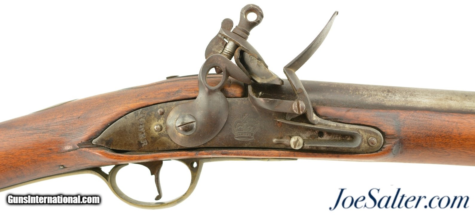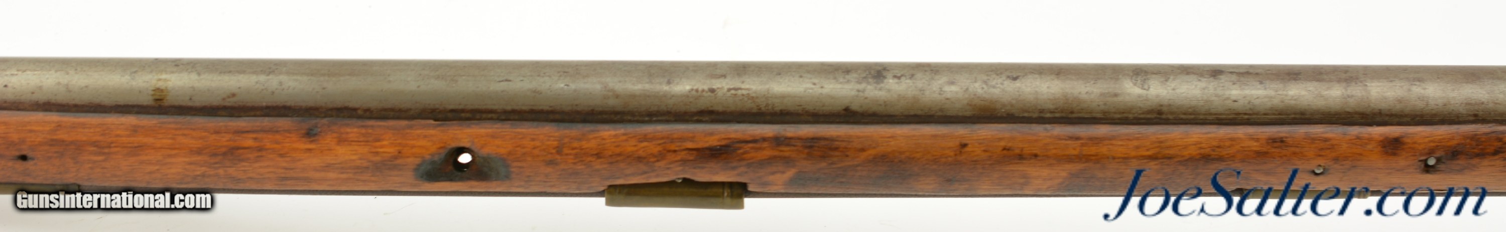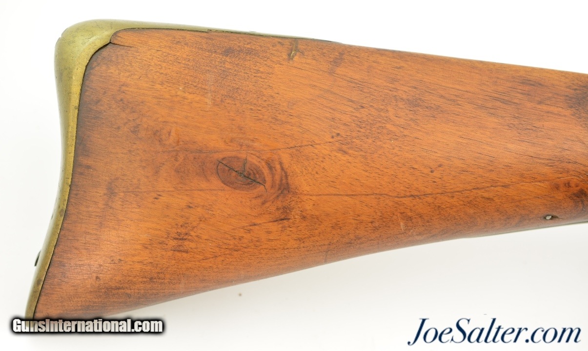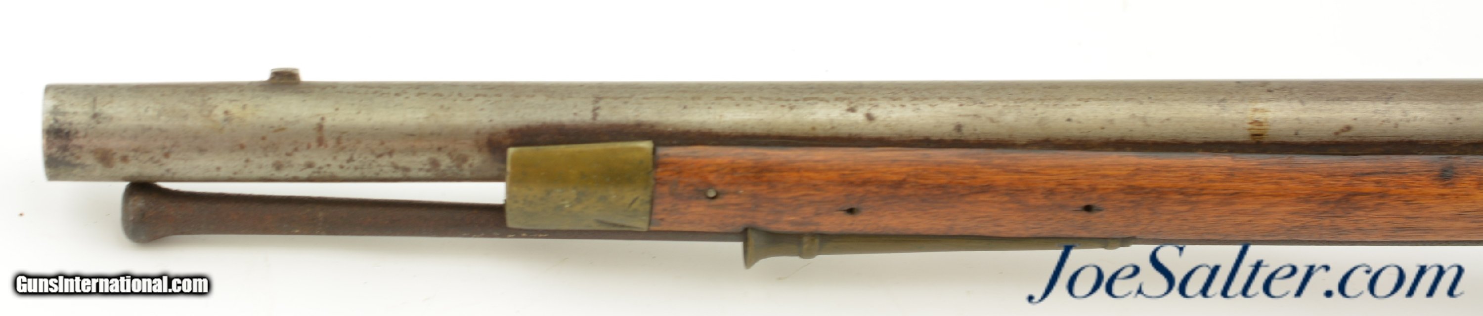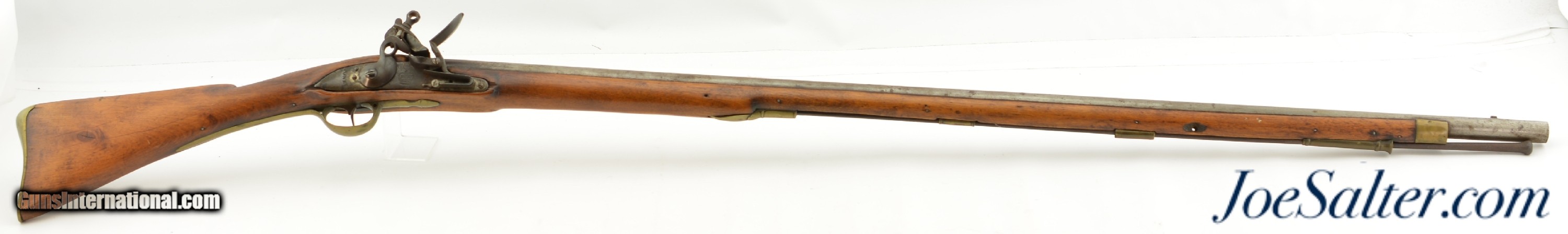 Description: NSN, .75 Caliber, 46" barrel with an about good, pitted bore. This is a "TOWER" and "(Crown only)" marked musket that has London commercial proofs at the breech of the "LONDON" marked barrel, and a 2nd Type India Pattern lock. The barrel has a mottled pewter gray patina with scattered spots of plum-brown that darkens at the breech. The lock has a mostly dark brown patina with traces of silvering along the high and exposed edges, and there is oxidation inside the pan and around the vent. The pin-fastened stock has numerous small handling marks and blemishes scattered about the sanded and reapplied finish, with chips in the wood along the forend where the sling bail used be installed (the rear sling swivel is also missing. Some stable drying cracks are also present on either side of the buttstock. The brass furniture has developed a dark ochre patina, with darker spots scattered about the metal, although the sideplate is nickel silver and has a pale, frosted appearance. The metal ramrod is heavily pitted at the tip, and the lock is fully functional, locking firmly at both half and full-cock. This is a nice looking "Brown Bess" type musket with an original 46" barrel, and is in good-near very good condition overall. Antique; Antique: Yes Price: $2,495.00 Contact Seller |