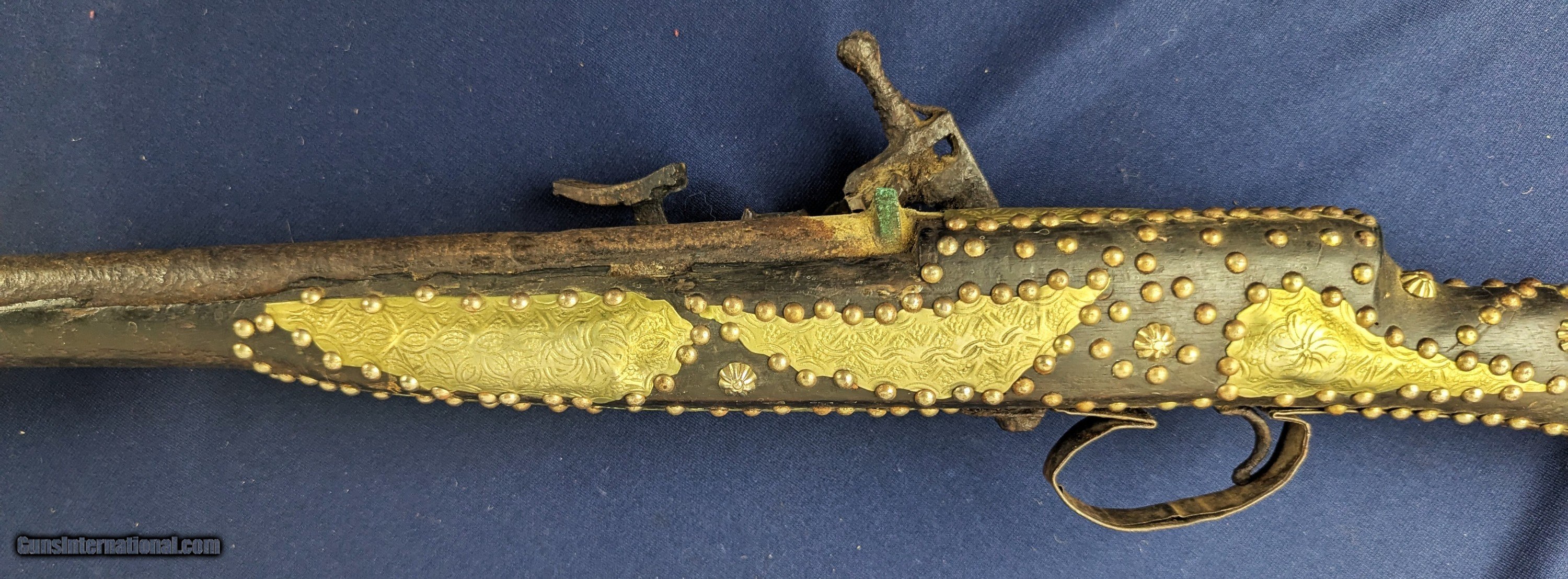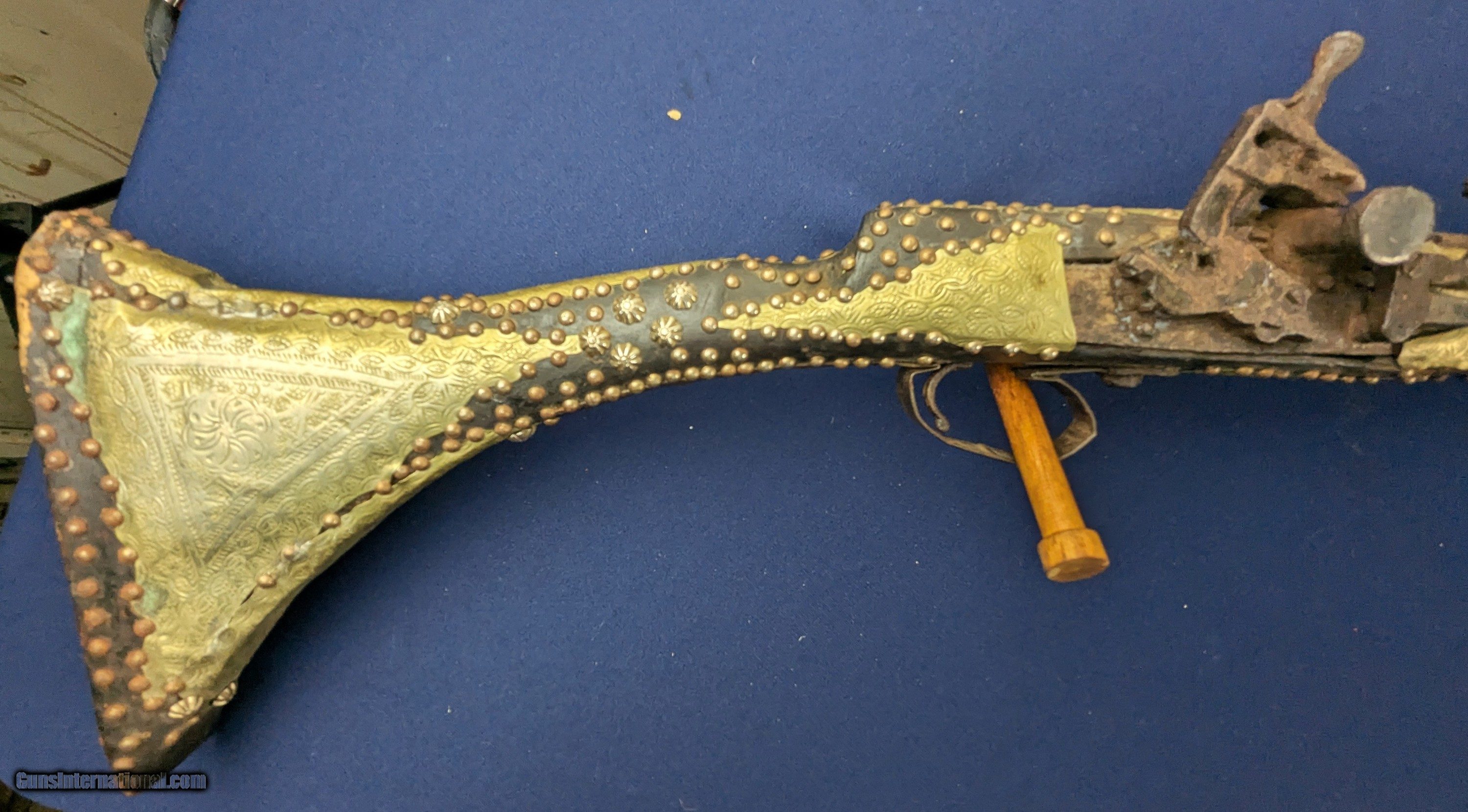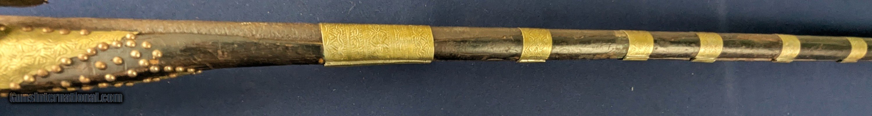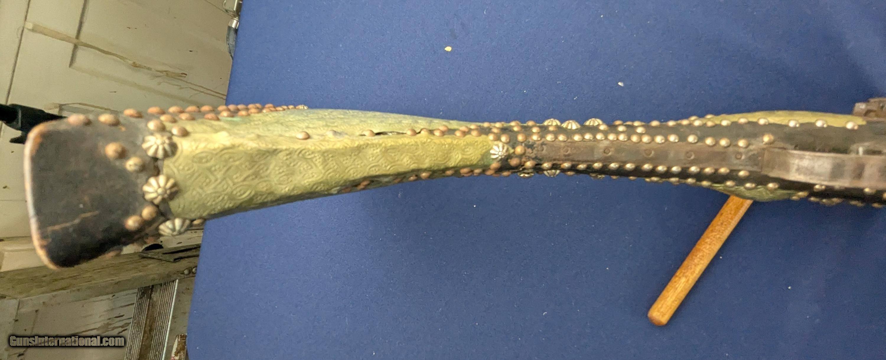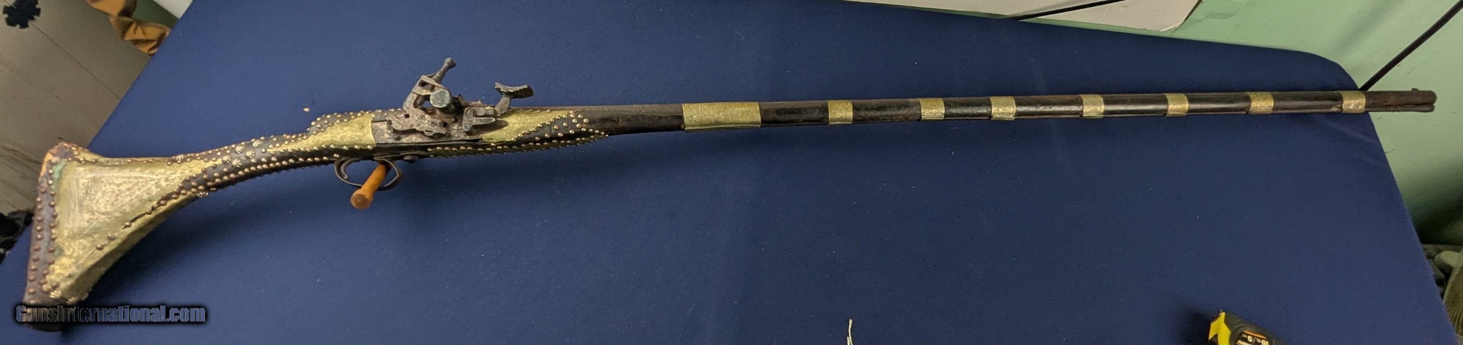 Description: Classic Early Antique Algerian Berber Long Musket Offered her for sale and just acquired along with a collection of antique Indo Persian firearms and edged weapons is this original and untouched mid 1800s Algerian Berber musket. From our research it appears to be an Algerian Berber musket similar to those depicted on page 36 of Tirri's book Magrib to Mogul: Islamic Weapons. The musket is complete and in working condition. It is however covered in a “crusty” surface patina overall which we have not touched. Ornately decorated with hammered brass this very long musket will certainly be a welcome addition for the right collector. Standard shipping is $68. however final shipping amount is based upon geographical area. Handling is $18.00 for longarms only. We gladly accept money orders, bank checks and personal checks. Credit card orders (VISA AND MASTER CARD ONLY) charged 3.95% additional for use. PLEASE CALL DALIA AT 203-257-5256 TO GIVE CREDIT CARD I NFORMATION. Also, please view our at hansenguns. Clicencounhterk on "Online Catalog" and see All OF OUR ITEMS LISTED CONSECUTIVELY on or search online on that site with the ID “lope”...... OFFERED ONLINE AND AVAILABLE IN OUR RETAIL GALLERY IN SOUTHPORT, CT. Visit us also on Facebook at ://facebook/hansenguns/?fref=ts. We also own and/or operate Hansen Cartridge Co. and the Ruger Collectors Assc.(RCA). Hansen & Hansen wishes to expedite each order received, however we ship 80-100 items weekly, therefore orders paid by money orders or bank checks are cleared for shipping 5-7 days after deposited funds show in our account. Shipping date is scheduled ONLY AFTER VERIFICATION TAKES PLACE AND FFL/C&R IS RECEIVED (IF APPLIES). This is 5-7 days after WE receive order by mail - NOT customer date mailed and postmarked and after credit card funds are posted. Credit card orders exceeding $500 must be cleared through customer’s bank before shipping. Personal checks are accepted but orders are held UP TO 3 WEEKS after deposit of funds before items released for shipping. IF you have special instructions or require overnight or expedited shipping please advise at time of ordering and we will gladly prioritize shipping FOR AN ADDITIONAL CHARGE. THIS IS OUR POLICY and we encourage buyers to PLEASE READ AND UNDERSTAND OUR POLICY BEFORE . We would be pleased to answer ANY questions by phone (our toll free number is 1-800-571-7337 or e-mail cwlopiaol. Antique: Yes Rifle Caliber: .50 Price: $1,750.00 Buy Now Contact Seller |