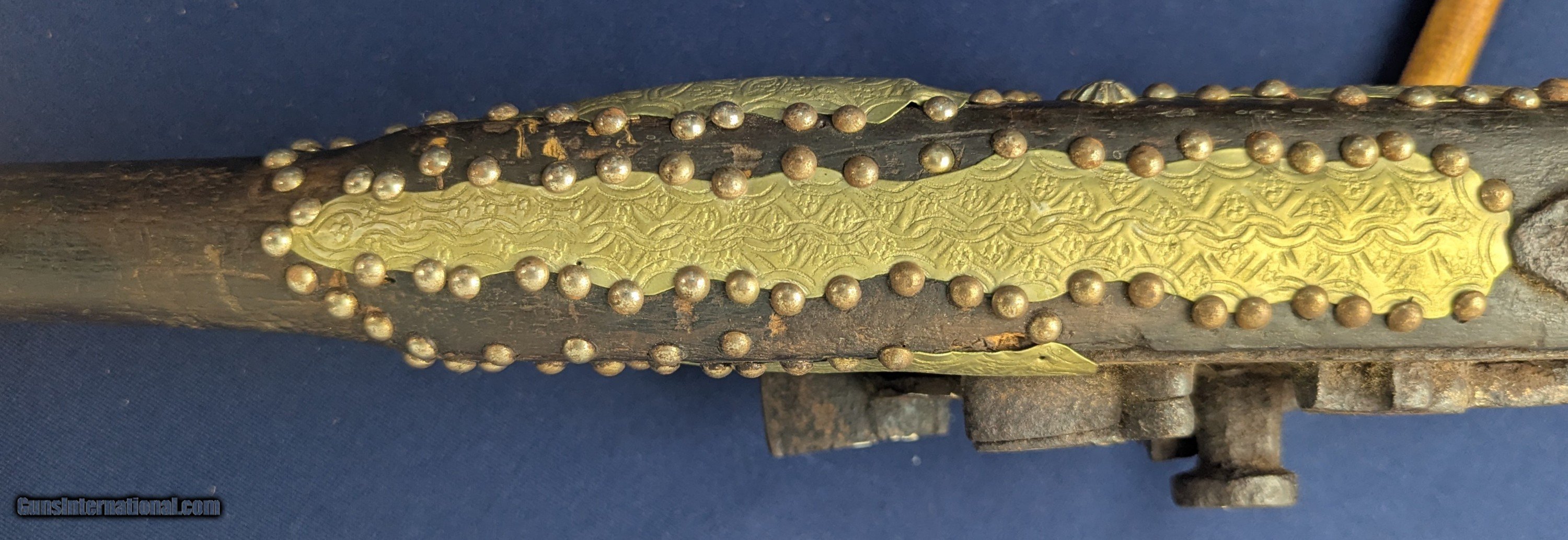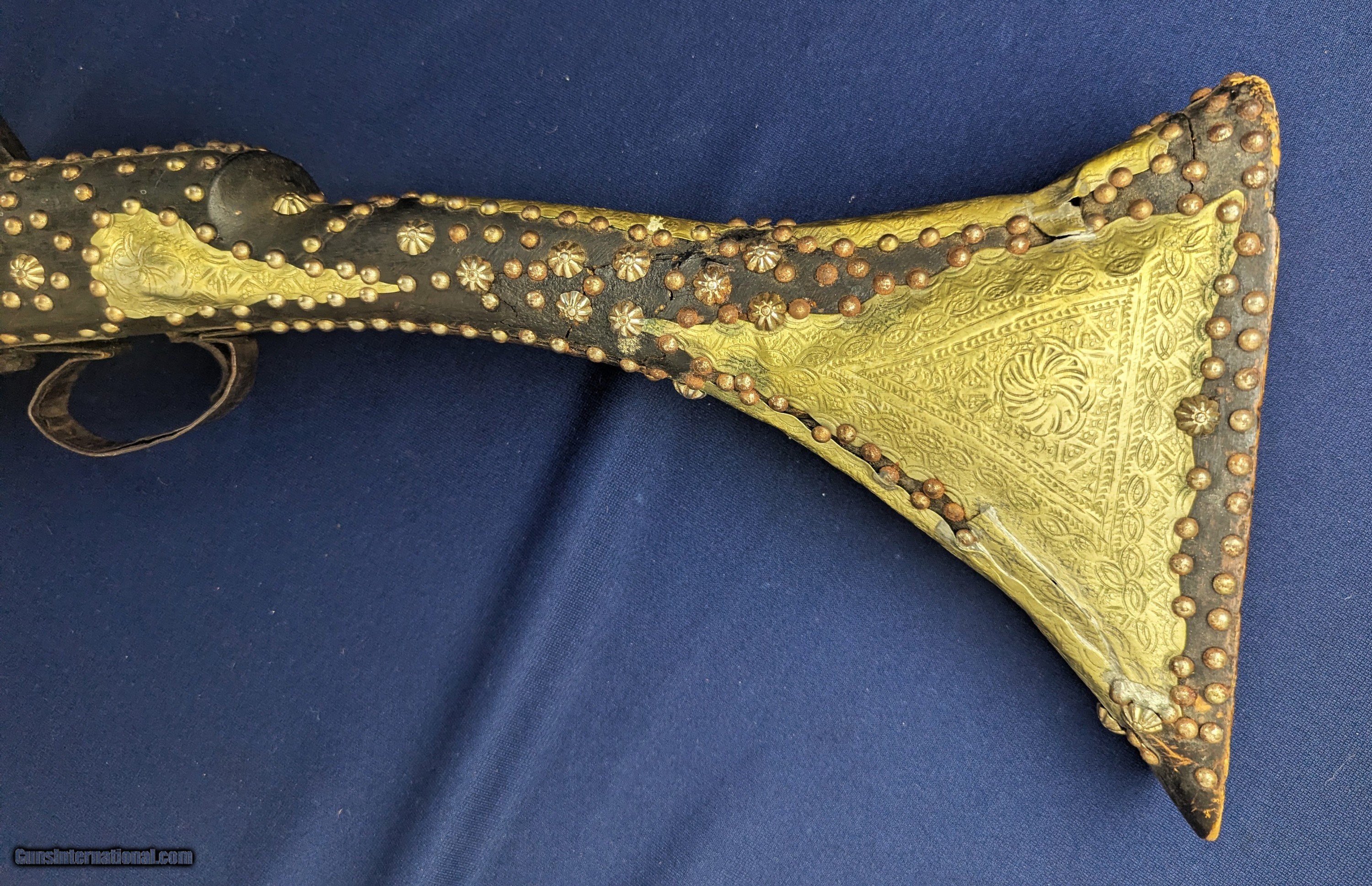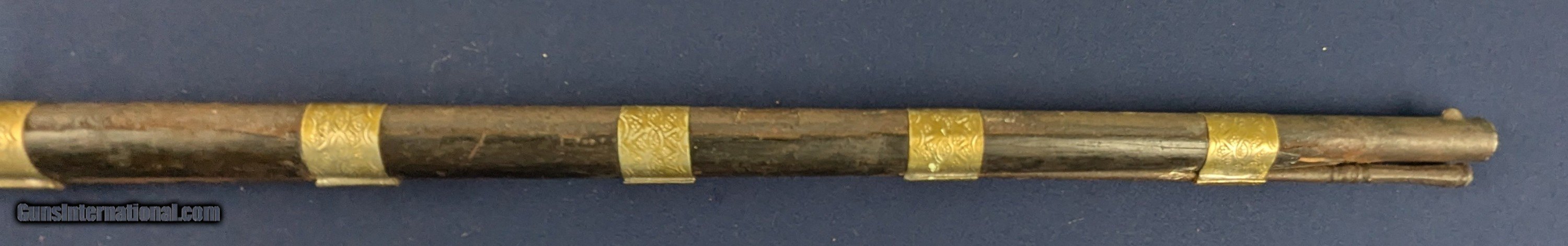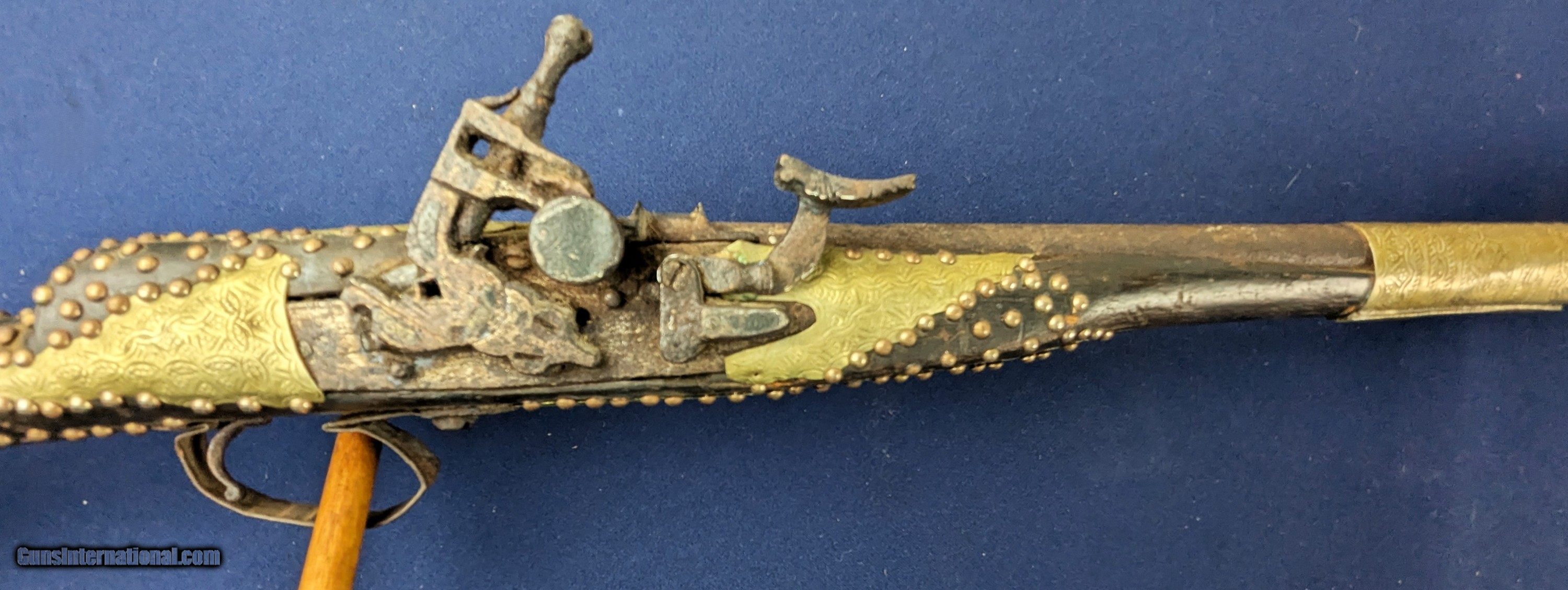 Description: Classic Early Antique Algerian Berber Long Musket Offered her for sale and just acquired along with a collection of antique Indo Persian firearms and edged weapons is this original and untouched mid 1800s Algerian Berber musket. From our research it appears to be an Algerian Berber musket similar to those depicted on page 36 of Tirri's book Magrib to Mogul: Islamic Weapons. The musket is complete and in working condition. It is however covered in a “crusty” surface patina overall which we have not touched. Ornately decorated with hammered brass this very long musket will certainly be a welcome addition for the right collector. Standard shipping is $68. however final shipping amount is based upon geographical area. Handling is $18.00 for longarms only. We gladly accept money orders, bank checks and personal checks. Credit card orders (VISA AND MASTER CARD ONLY) charged 3.95% additional for use. PLEASE CALL DALIA AT 203-257-5256 TO GIVE CREDIT CARD I NFORMATION. Also, please view our at hansenguns. Clicencounhterk on "Online Catalog" and see All OF OUR ITEMS LISTED CONSECUTIVELY on or search online on that site with the ID “lope”...... OFFERED ONLINE AND AVAILABLE IN OUR RETAIL GALLERY IN SOUTHPORT, CT. Visit us also on Facebook at ://facebook/hansenguns/?fref=ts. We also own and/or operate Hansen Cartridge Co. and the Ruger Collectors Assc.(RCA). Hansen & Hansen wishes to expedite each order received, however we ship 80-100 items weekly, therefore orders paid by money orders or bank checks are cleared for shipping 5-7 days after deposited funds show in our account. Shipping date is scheduled ONLY AFTER VERIFICATION TAKES PLACE AND FFL/C&R IS RECEIVED (IF APPLIES). This is 5-7 days after WE receive order by mail - NOT customer date mailed and postmarked and after credit card funds are posted. Credit card orders exceeding $500 must be cleared through customer’s bank before shipping. Personal checks are accepted but orders are held UP TO 3 WEEKS after deposit of funds before items released for shipping. IF you have special instructions or require overnight or expedited shipping please advise at time of ordering and we will gladly prioritize shipping FOR AN ADDITIONAL CHARGE. THIS IS OUR POLICY and we encourage buyers to PLEASE READ AND UNDERSTAND OUR POLICY BEFORE . We would be pleased to answer ANY questions by phone (our toll free number is 1-800-571-7337 or e-mail cwlopiaol. Antique: Yes Rifle Caliber: .50 Price: $1,750.00 Buy Now Contact Seller |