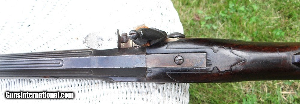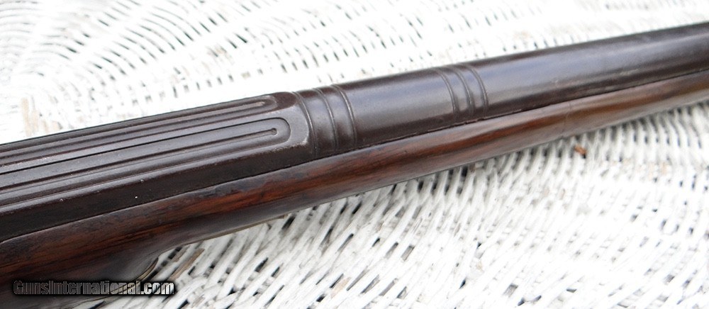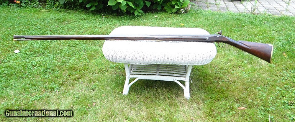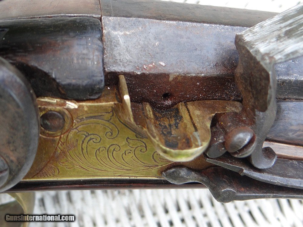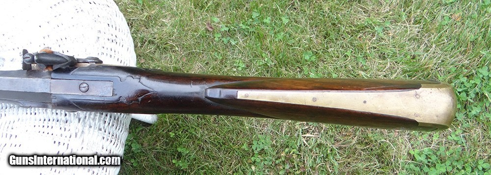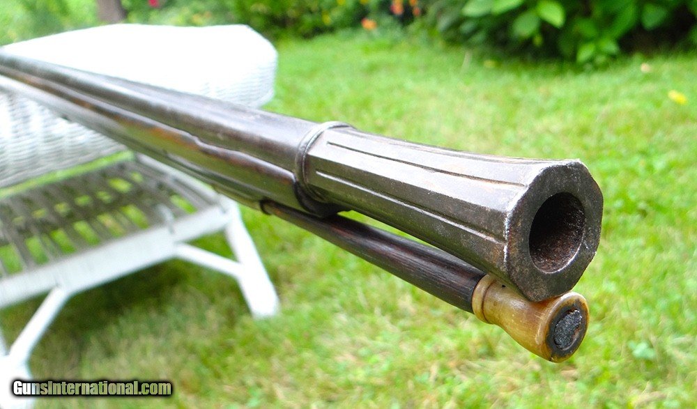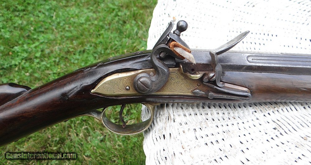 Description: A rare Dutch Colonial 18th century ’Swan Gun’ in excellent condition. Six foot + long guns became popular in Holland during the 17th century for the hunting of swans and ducks, the meat of both species, swan feathers and down were also of value. These guns were also found to be of some military use. Dutch emigrating to North America were advised to bring these long fowling pieces to the New World and over time the guns evolved into the American Hudson Valley ‘Longfowler.’ During the 17th century the Dutch Republic became a major maritime power acquiring colonies and trading bases in both the Atlantic and Pacific Oceans. In the Pacific they were very active in the spice trade voyaging to the islands of Sumatra, Java, and Bali - which eventually became the Dutch East Indies - Indonesia. The Dutch brought long Swan Guns with them and and found a great demand for firearms in the East Indies. Dutch gunsmiths emigrated to the East Indies where they found very capable metalworkers to employ in building guns, including ‘Swan Guns’ . The earliest examples follow 17th Centertury Dutch forms while those built in the 18th century follow Dutch forms of that period also incorporating East Indian features. Considerable information and pictures of both Dutch and Dutch Colonial (East Indies) long fowling pieces can be found in, “DUTCH FIREARMS”, by Arne Hoff, Sotheby Parke Bernet Publications, NYC, 1978. See Chapter IX , P-193 - 196 for Dutch examples, Chapter XI, Pages 222- 228 for Colonial East Asian examples - plate 1, examples 84, 86 being of particular interest. The seven ’Swan Guns pictured in chapters IX & Xi are in the collection of the Tojhusmuseum, Copenhagen, Denmark. Examples in private collections are rare. Our Dutch Colonial ‘Swan Gun’ / longfowler, shown in overall and detail pictures, was built in the Dutch East India colonies in the period 1740-1780. This gun displays high quality workmanship and excellent form on a par with Dutch prototypes. It follows standard Dutch form of the period with a 58” half round barrel , the octagonal sections fluted in Dutch Colonial form, the round section ending in a stepped ring witha flaring octagonal and fluted muzzle. The barrel is .63 caliber( aprox. 16 gauge) , smaller than the usual .78 - .80 of fowling pieces of that pereiod, wi the barrel thick walled and heavier than a standard fowling piece. The original flintlock features a brass lock plate and is of normal mid 18th century Dutch form without a pan bridle. The brass furniture is of Dutch form and quite heavy with the rear ramrod fitting and trigger guard forward finial showing some Asian influence. The butt plate is especially heavy with a very long tang, likely intended to help counter balance the heavy barrel. This gun is stocked in beautifully grained East Indian rosewood / ebony. It is of Dutch mid 18th century form with raised carving behind the barrel tang and flats on either side of the lock. There is no side plate since Asian rosewood / ebony is so hard and dense a side plate is not required to support the lock screws. The very high quality of this gun combined with its .63 caliber and heavier than usual barrel lead one to think it imay have been built with military usage in mind - long fowling guns were often used in Europe and the New World as long range military arms. This one could have been built for a Dutch Colonial officer, or for one of the local Rajahs or Sultans controlling independent principalities on Sumatra, java, and Bali for whom it would have been a status symbol as well as a weapon. This very impressive gun may well have an interesting American association. It is well known that the main American Northeast shipping ports from Boston south to Savannah acquired great wealth and power while engaged in the China Trade from the 1790s throughout most of the 19th century. What is not so well known is that the fortunes of Salem Massachusetts were derived from the East Indian Spice Trade - Salem ships from the late 18th well into the 19th centuries sailed to Sumatra, java, Bali, and other ports in the Sulu Sea for the very valuable spices available only in those waters. The Sultans and Rajahs in control demanded payment in specie - silver Spanish 8 reales or Mexican silver pesos - the international currency of the period. But the Indian Ocean and Sulu Sea were dangerous waters to sail. Some of the independent rulers in the Spice Trade had a nasty racket, especially on the island of Sumatra. Local rulers might wait for a Salem ship to arrive in their hasrbor, or at the mouth of a river leading to their fortress and upon its arrival a celebration would be made, fine trading would ensue, the Americans would load a valuable cargo of spices and the Sultan would recceive a chest of silver. Everybody would be happy. However the night before the Salem Ship set sail the Sultan would send a body of his men to board the American ship, kill all aboard, take back the spice cargo, and burn and sink the ship to destroy all evidence. He would then await the arrival of another Salem ship…and warmly greet its captain and crew. Numbers of American ships set sail in that period which were never heard from again. Word of these murders did eventually get back to America and the US Navy sent a the frigate POTOMAC to Sumatra in. 1832 - ‘the First Sumatra Expedition’ - and the score was well settled. However in 1838 the US Navy had to send a second expedition - the frigates ‘COLUMBIA’ , ‘JOHN ADAMS” , and their landing force - which solved the problem. This rare long gun is in excellent condition. It shows genuine use but the barrel retains an excellent deep patina with no pitting save around the touch hole. All edges, engraving, and contours are crisp with no evidence of abrasion. The lock functions well. The brass mountings have a fine patina. The rosewood / ebony stock is excellent with minor age / use wear on the upper edges of the forestock. The 