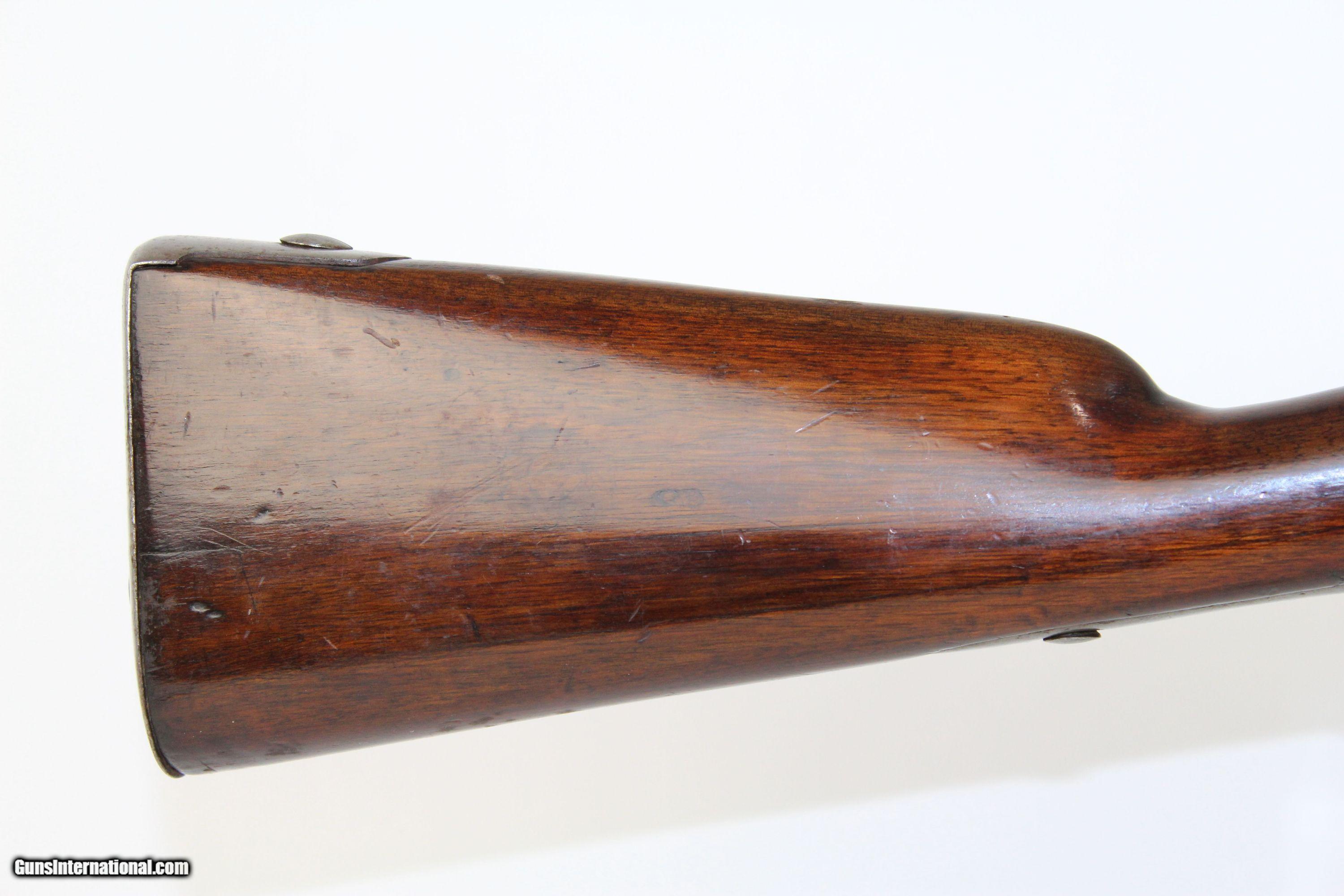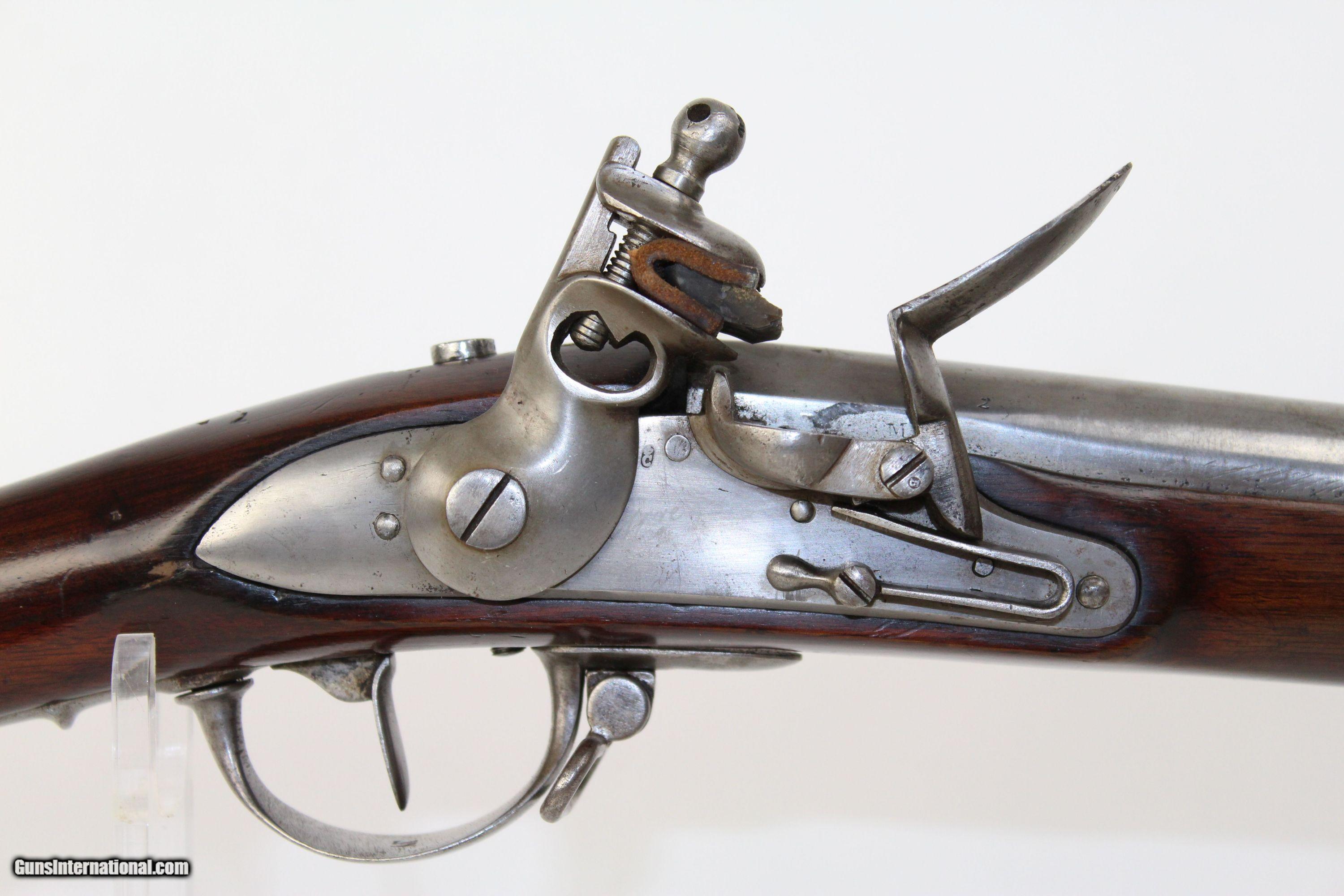 Description: FRENCH Antique Model 1822 Flintlock MUSKETOON Very Nice Flintlock Covered with Markings! Here we present an antique French Model 1822 Flintlock Musketoon, made circa the 1820s in Liege. Liege has long been a manufacturing center for the world’s arms trade and at this time was a part of the United Kingdom of the Netherlands. The Model 1822 was in use in the years following Napoleon Bonaparte’s defeat and the following internal political and social upheaval. This one is in musketoon configuration. This was a shortened version of the full-length rifle, generally issued to troops who could especially use a shorter, lighter weapon such as cavalry, artillery, sappers, etc. This rifled musket is marked on every part with letters, numbers, and symbols. The top of the barrel is Liege proofed. The barrel tang is marked with a partially visible “1822”. There is a bayonet lug on the underside of the barrel near the muzzle. The overall condition is very good. Metal surfaces have been polished back to the original bright finish. The markings are mostly clear. The stock is smooth, glossy and in great shape. The bore is semi-bright with good rifling. The action is excellent, strong and crisp. This rifle looks great, would make an interesting study in markings, and should be a joy to fire. Own the original! This is a legitimate antique and not a reproduction. Barrel is 30 inches. Caliber: .72 Overall condition as seen in photos. Very Fast. Very Safe. FREE SHIPPING WORLDWIDE. Delivered directly to your door by express mail! Guaranteed AUTHENTIC & Includes CERTIFICATE OF AUTHENTICITY. ancestryguns $2850 #6458 SOLD Antique: Yes |