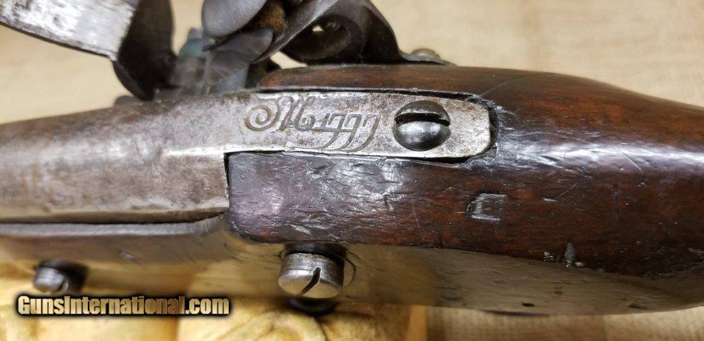 Description: French Columberg Model 1777 Flintlock Musket This model 1777 has been modified from its original configuration, shorter 20 inch barrel with new brass front sight, cut down stock and front band (proofed with a crown? over an "M") modified or changed showing how over 200 years of usage, firearms are salvaged and untilized for various means. Butt stock has been shaved to fit the cheek and in the same place a primitive cross has been carved. This musket may have been used as a cavalry piece due to its much shorter length. Overall length is 35 inches. The lock plate bears an inscription with the factory name Koninlijke Geweerfabriek Culemborg and is stamped with an award winning L (there may be an NG brand stamped on the inside but we did not take the firearm apart, info on the NG brand is being retained from an example in the Rjiksmuseum in the Netherlands). M 1777 is stamped on the tail of the barrel and possibly an S on the underside and an unidentifiable mark (S and unidentifiable mark info also came from the Rjiksmuseum example). A compass design is stamped into the stock. Two stage action works nice and tight, circa 1807 - 1809 SOLD Antique: Yes |