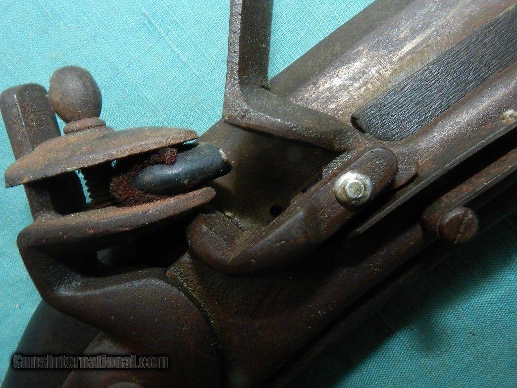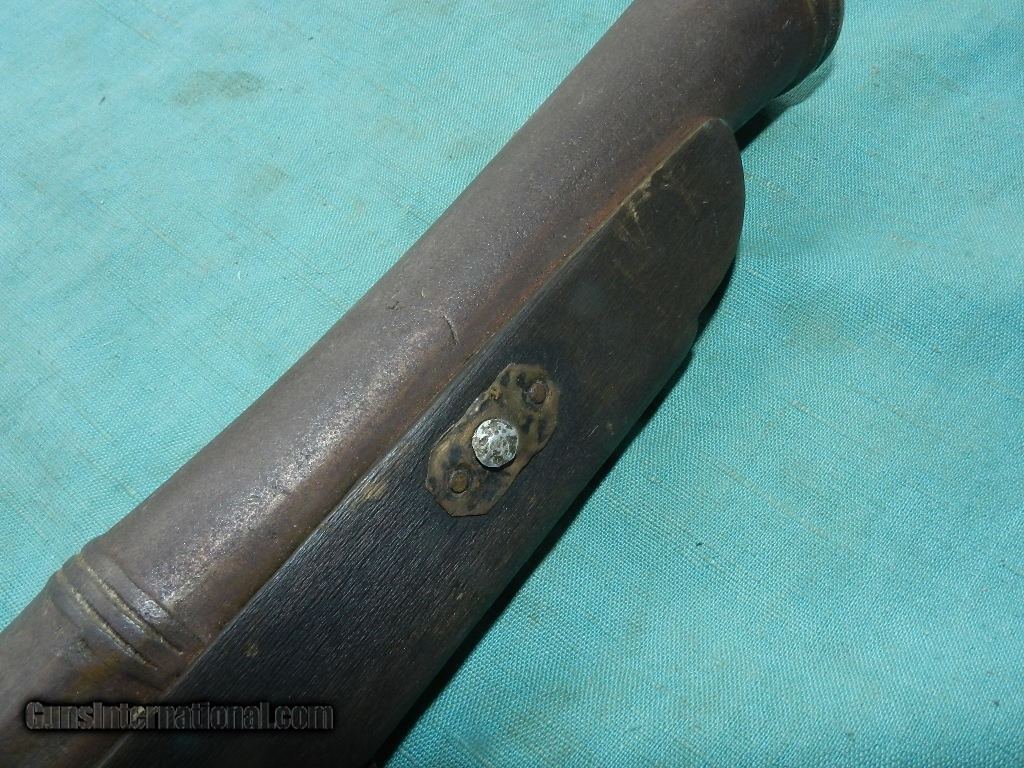 Description: SOLD I don't know how to list this heavy Pirate Blunderbuss as there is no category available.It measures about 29" long and the hgammer is pulled bakc and hold , but the mainspring s weak. In the jaws isa pebble not a flint, and the frizzen won;t spark. Taking it apart, the breech plug is not worthy or safe to fire. So this must be an ornimental blunderbuss with cast barrel , and thick trigger guard.. The barrel is about 17" long, and the metal looks aged. Weighs about 7 lbs. The right side has a brass plaque installed that states: Spanish Indenpendence War, Flintlock Blunderbuss 1810 Periode. Would make a great display or pirate carry around. No attempt should be made to fire this gun! When buying a gun always have it examined by a competent gunsmith before shooting. To buy a gun from me you must get a direct email for me, with details, and shipping cost. We don’t have a web site .I prefer money orders or a check. Item ships when funds come in. I try to keep guns affordable, which means I make less money than most dealers. You won’t get altitude sickness, or nose bleed, with my prices! I consistently have the best selection of older guns If you attempt to buy, you must still contact us for details . Best to email to buy. Sometimes a local person can stop buy and purchase before the gun is removed. Sometimes not home to get calls. Some guns are required shipment to a gun dealer near you for a transfer to you when it arrives. Otherwise many older or black powder guns ship to your door. With the widest selection of older guns at great prices, We don’t have a store, and sell on the internet only. I’m easy to get along with. Thank You. SOLD Antique: Yes |