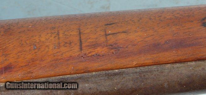 Description: HISTORIC REVOLUTIONARY WAR CHARLEVILLE MODEL 1774 MUSKET FROM THE OLD GARRISON HOUSE, KITTERY MAINE. 69 caliber smoothbore 45” barrel. In original flintlock and not a reconversion. Old tag circa early 1900’s states that it was one of two muskets “-acquired from the old Garrison House in Kittery, Maine where they hung for 175 years”. Also attached to the trigger guard is a lead collection tag of similar vintage with the impressed name of the early 1900’s collector “E. MILLER” and the number “25” on the obverse. The Garrison House at Kittery was one of a group of fortified dwellings established in the early 1700’s to protect the inhabitants against Indian attacks and which served as garrison houses and weapons depositories during the French and Indian War and the Revolution. In beautiful untouched and as found condition. Metal with all the proper markings and a very crisp script “CHARLEVILLE” mark on the lock plate. French inspection marks on the lock and side plate as well as the breech of the barrel. Side plate also stamped with a small “ME” and the forend with old worn brand “ME” as well-possibly indicating Maine. All original with the American steel ramrod and French Model 1754 hammer Revolutionary War replacements. Beautiful patina on metal excellent stock with only a sliver of wood missing on the left side near the forward band. Interestingly nearly all of the 70,000 Model 1774 muskets are presumed to have been shipped to America from Nantes in the late 1770’s (See Moller Vol. 1, pp. 296-297). Scarce and absolutely original Revolutionary War Charleville. SOLD Antique: Yes |