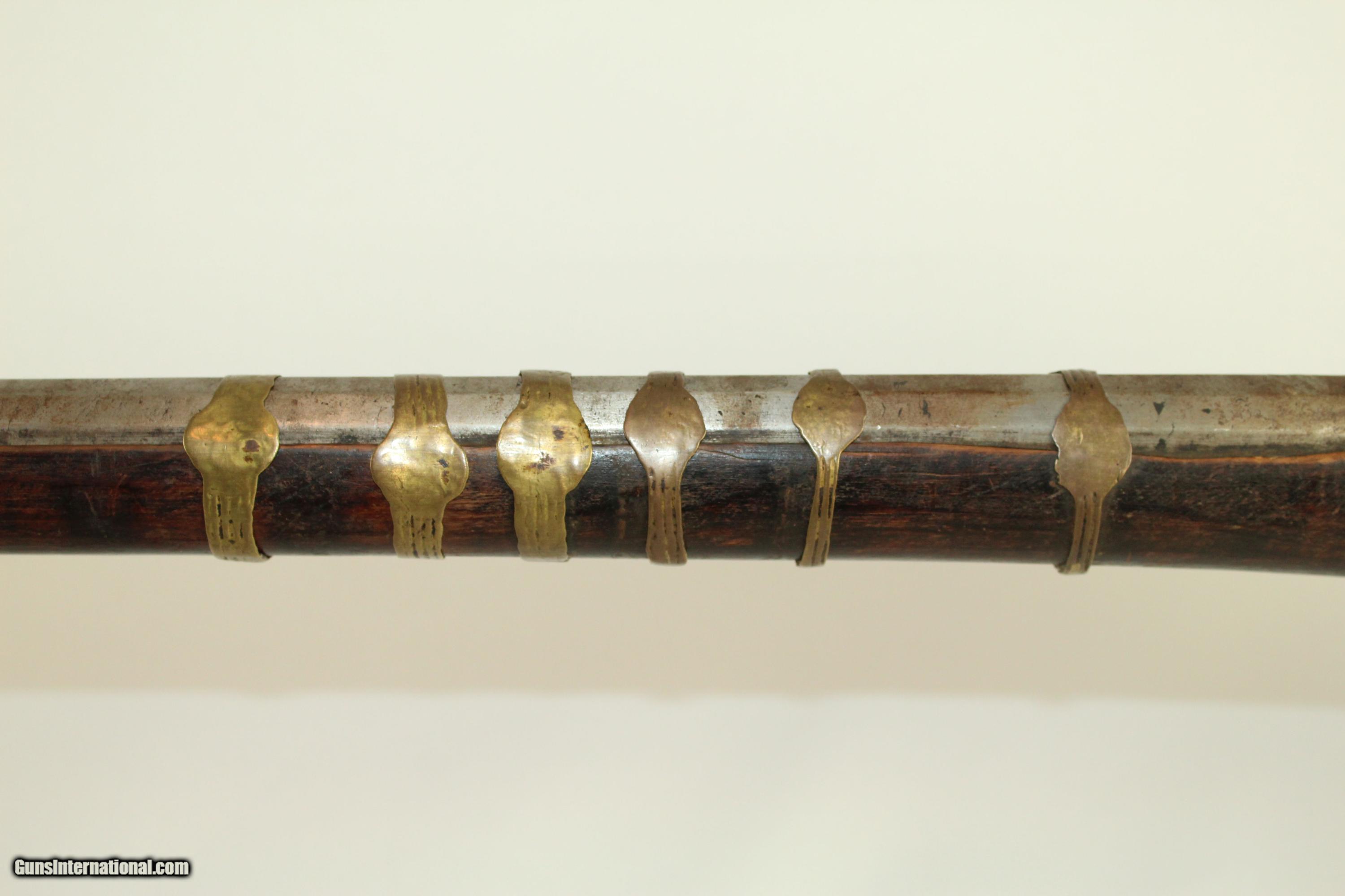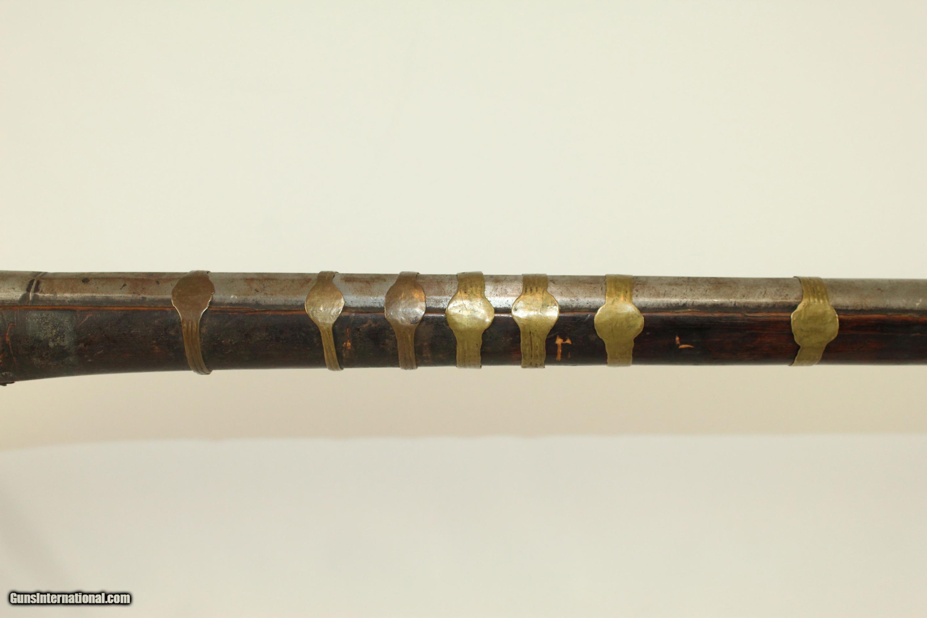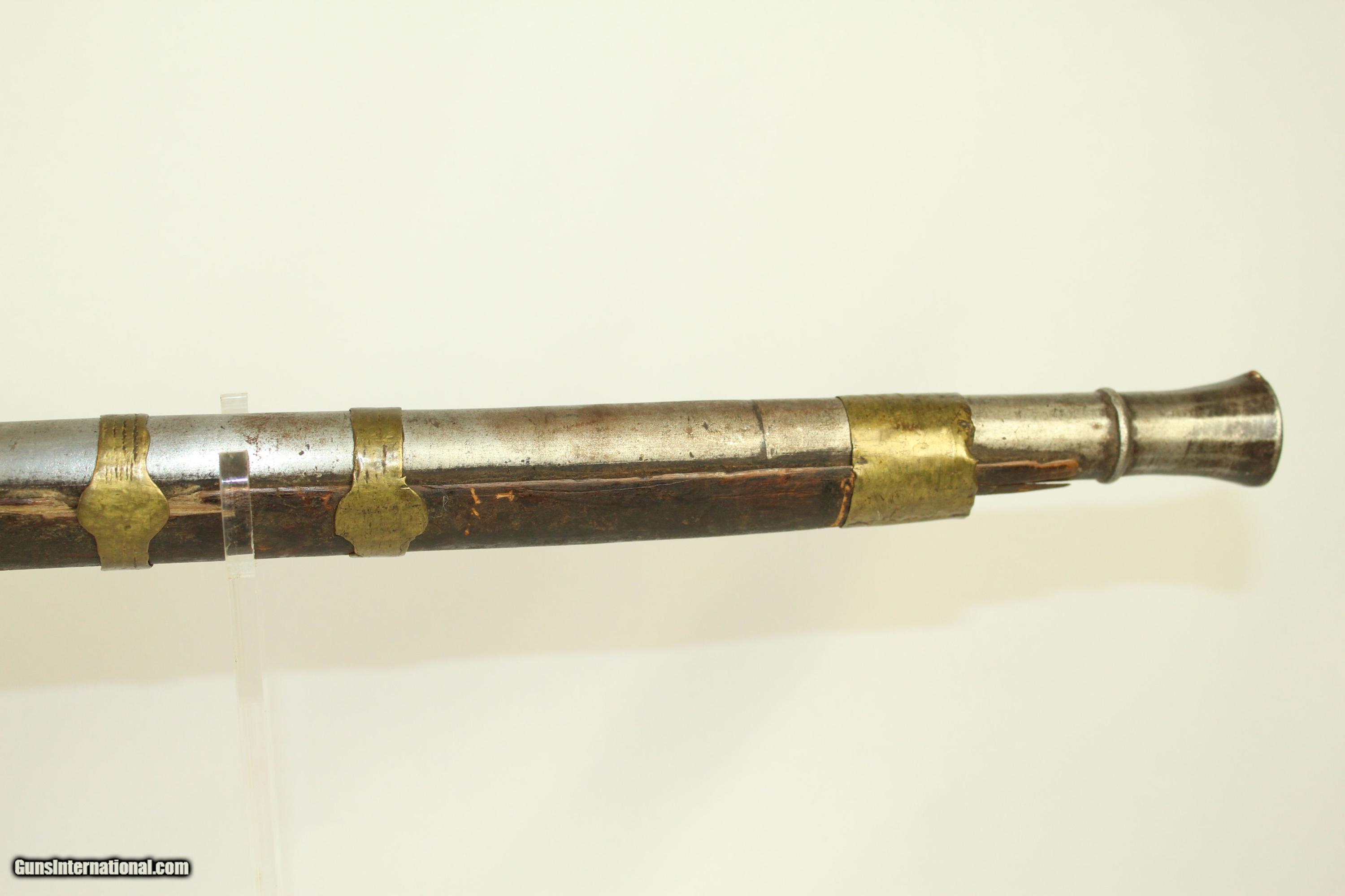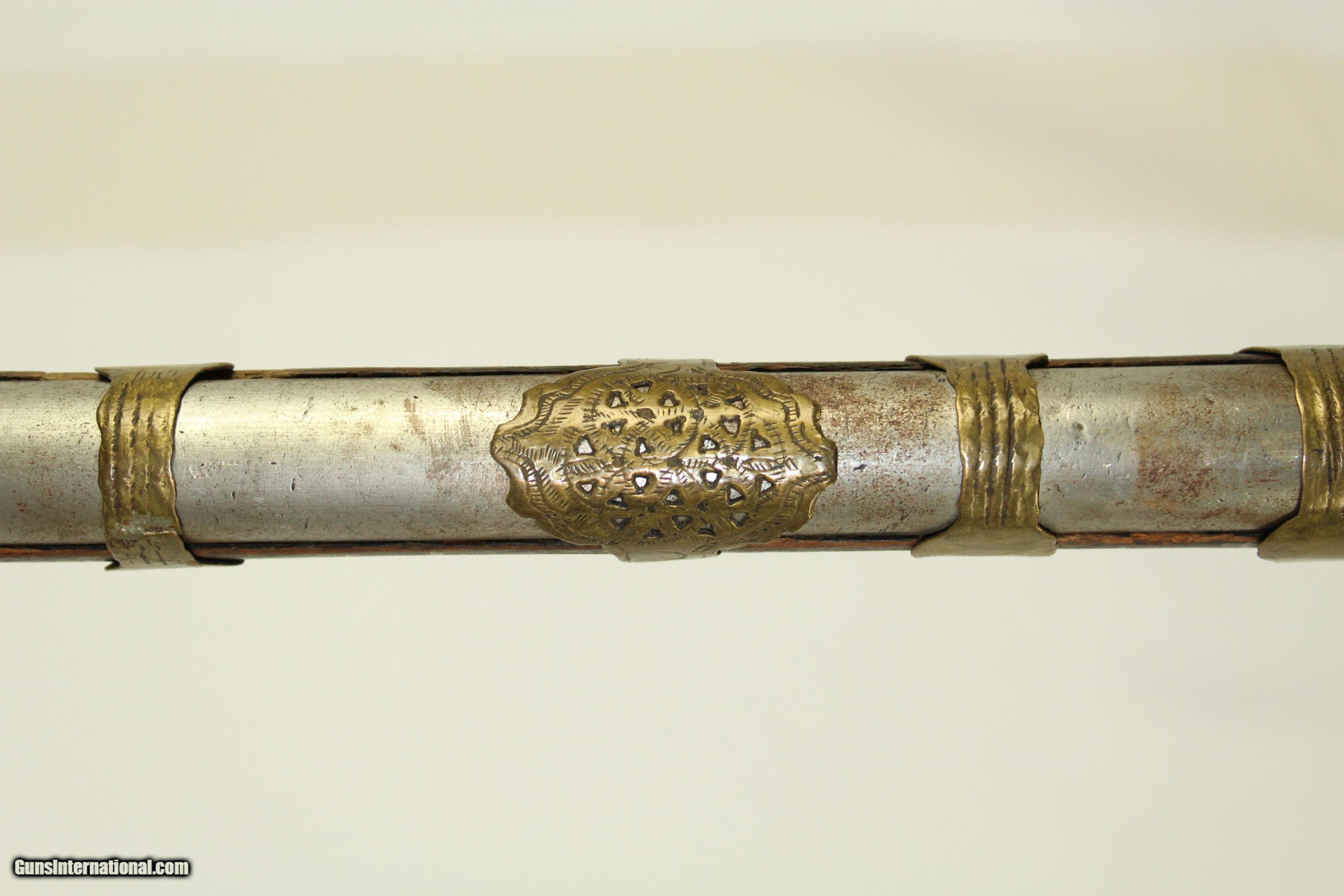 Description: Imperial British AFGHAN JEZAIL Flintlock Musket With Hand Engraved Brown Bess Lock & Long Barrel Here we present an antique Afghan Jezail Flintlock Musket with a British Brown Bess Lock, made circa 1800-1840s. Such weapons were used against the British in the Anglo-Afghan Wars by extremely capable Afghan warriors. As an officer described from the First Anglo-Afghan War: “Afghan snipers were expert marksmen and their juzzails fired roughened bullets, long iron nails or even pebbles over a range of some 250 metres. The Afghans could fling the large rifles across their shoulders as if they were feathers and spring nimbly from rock to rock.” The distinct shape of the stock and the length of the barrel is for convenience of shooting and loading from the back of an animal. One could lower the butt all the way to the ground and have easy access to the muzzle for loading. The 54-inch long barrel is fastened by 18 hammered barrel bands. The lock is hand engraved with a lion. The front sight is a small bead. The rear sight is a sturdy peep sight as is customary on the type. This example is in very good condition. The metal has a gray patina. The markings are clear. The stock shows quite a bit of wear, with a bit of slivering opposite the lock. The bore is smooth and untouched. The action is functional. Here is an extremely unique piece for your collection. Own the original! This is a legitimate antique and not a reproduction. Barrel is 54 inches in length. Caliber: .65 with a slight flare at the muzzle Overall condition as seen in photos. Very Fast. Very Safe. FREE SHIPPING WORLDWIDE. Delivered directly to your door by express mail! Guaranteed AUTHENTIC & Includes CERTIFICATE OF AUTHENTICITY. ancestryguns $1200 #10537 SOLD Antique: Yes |