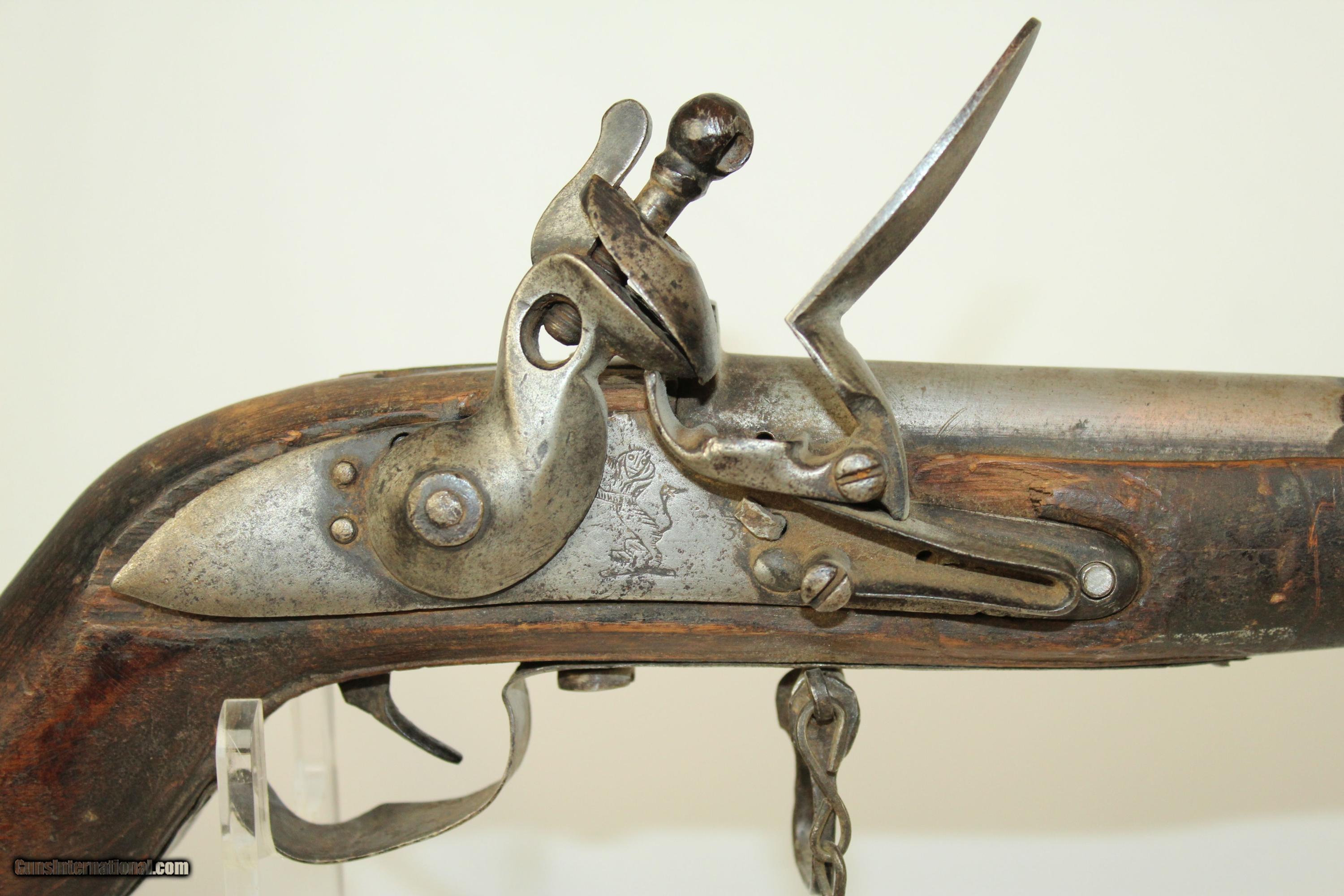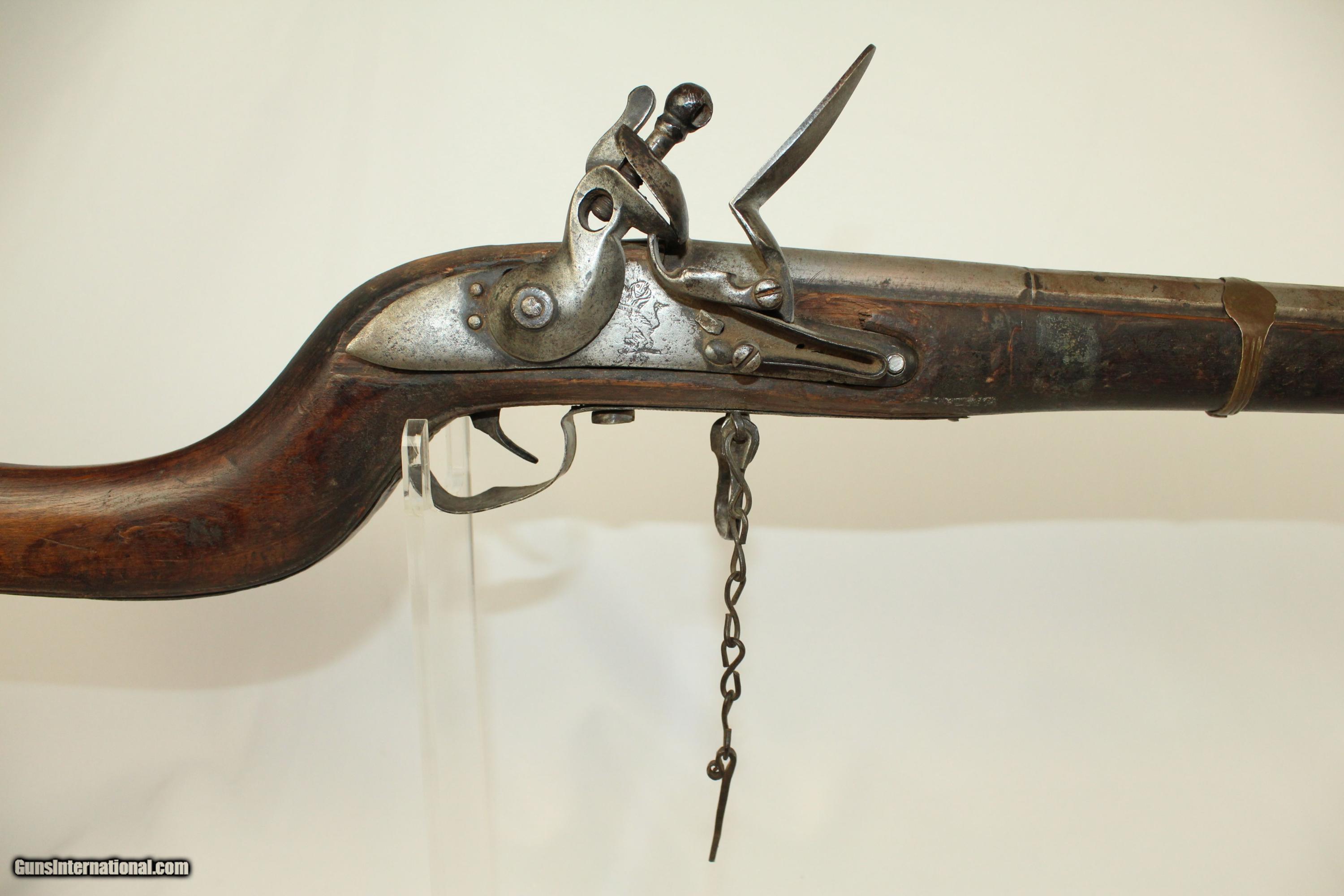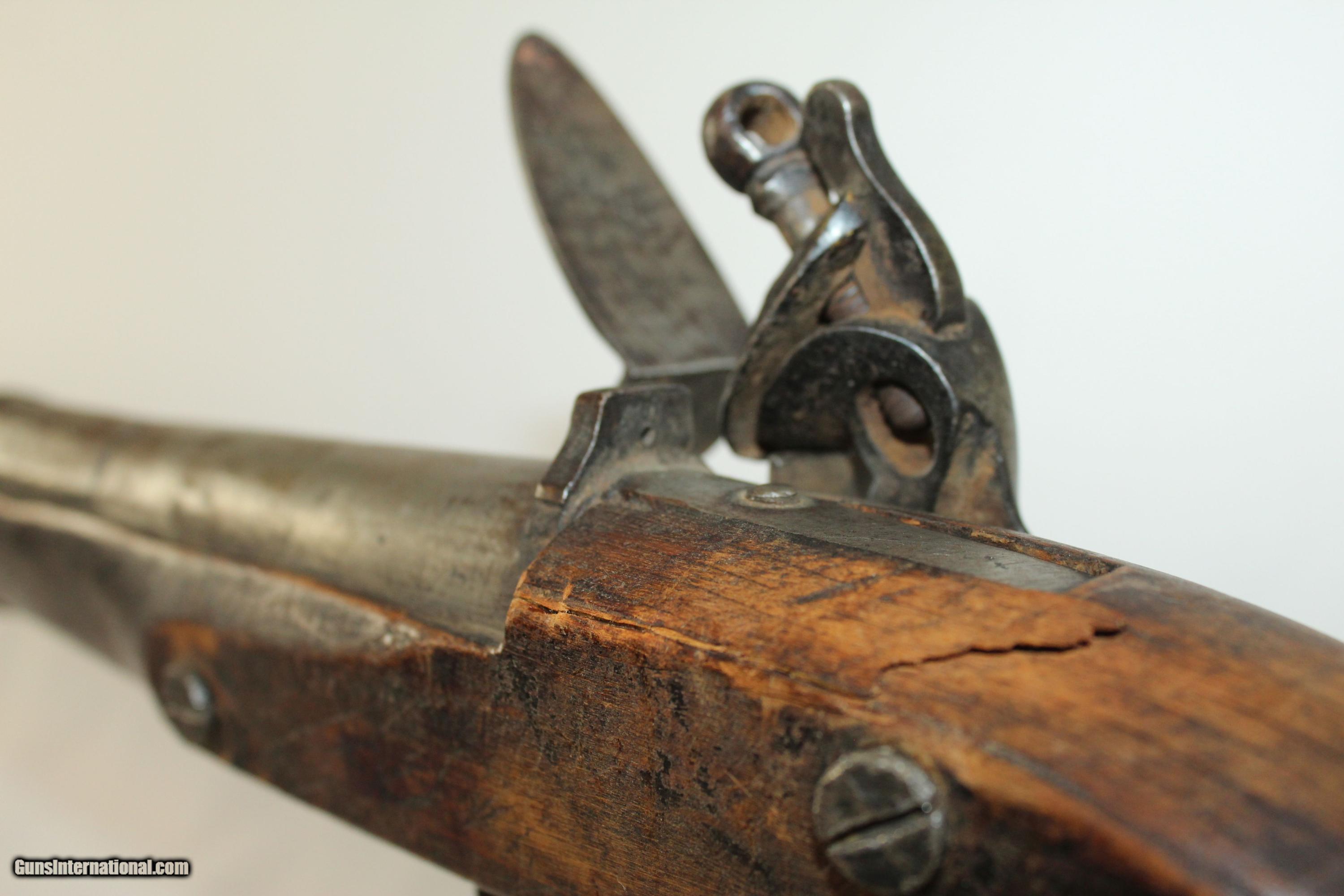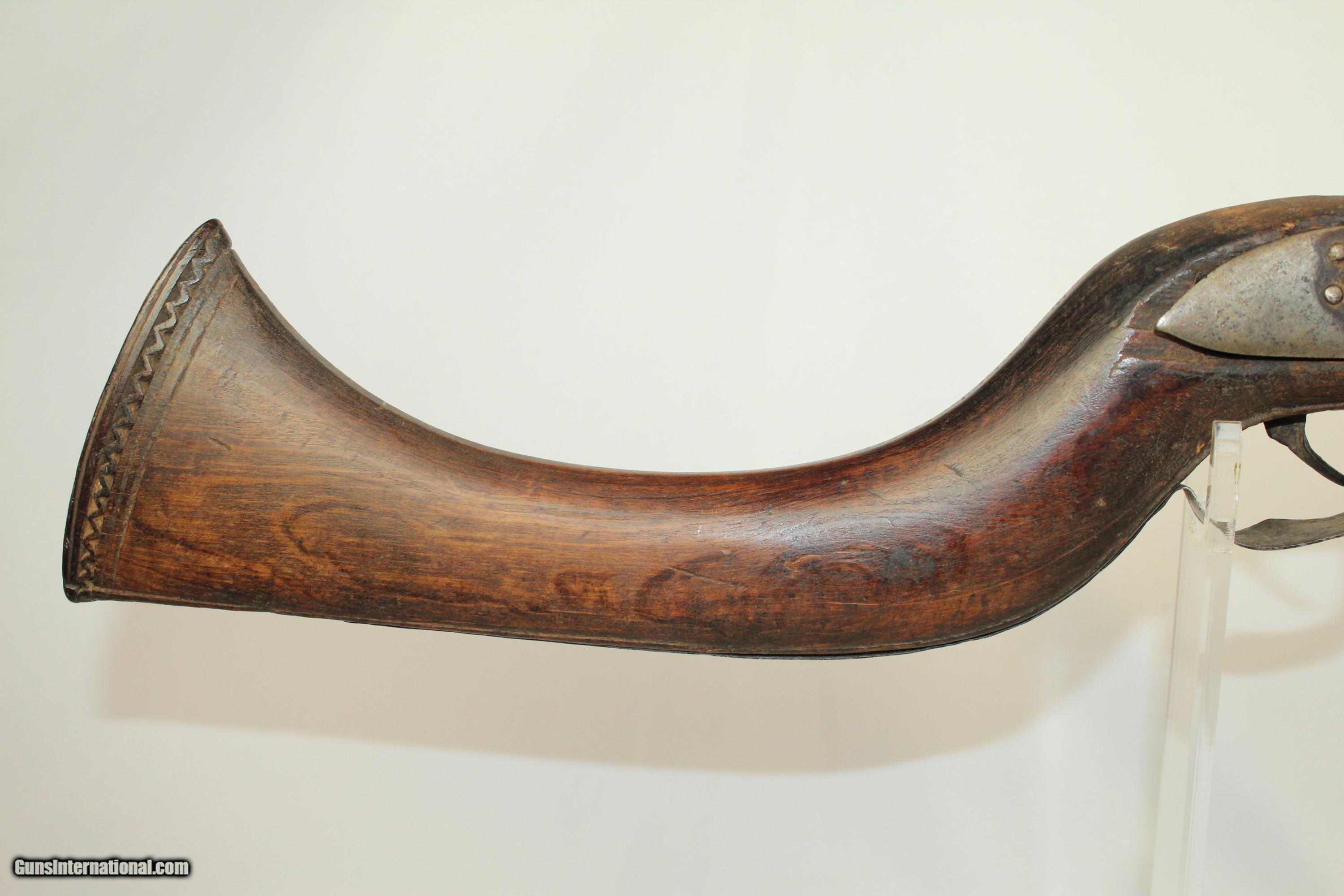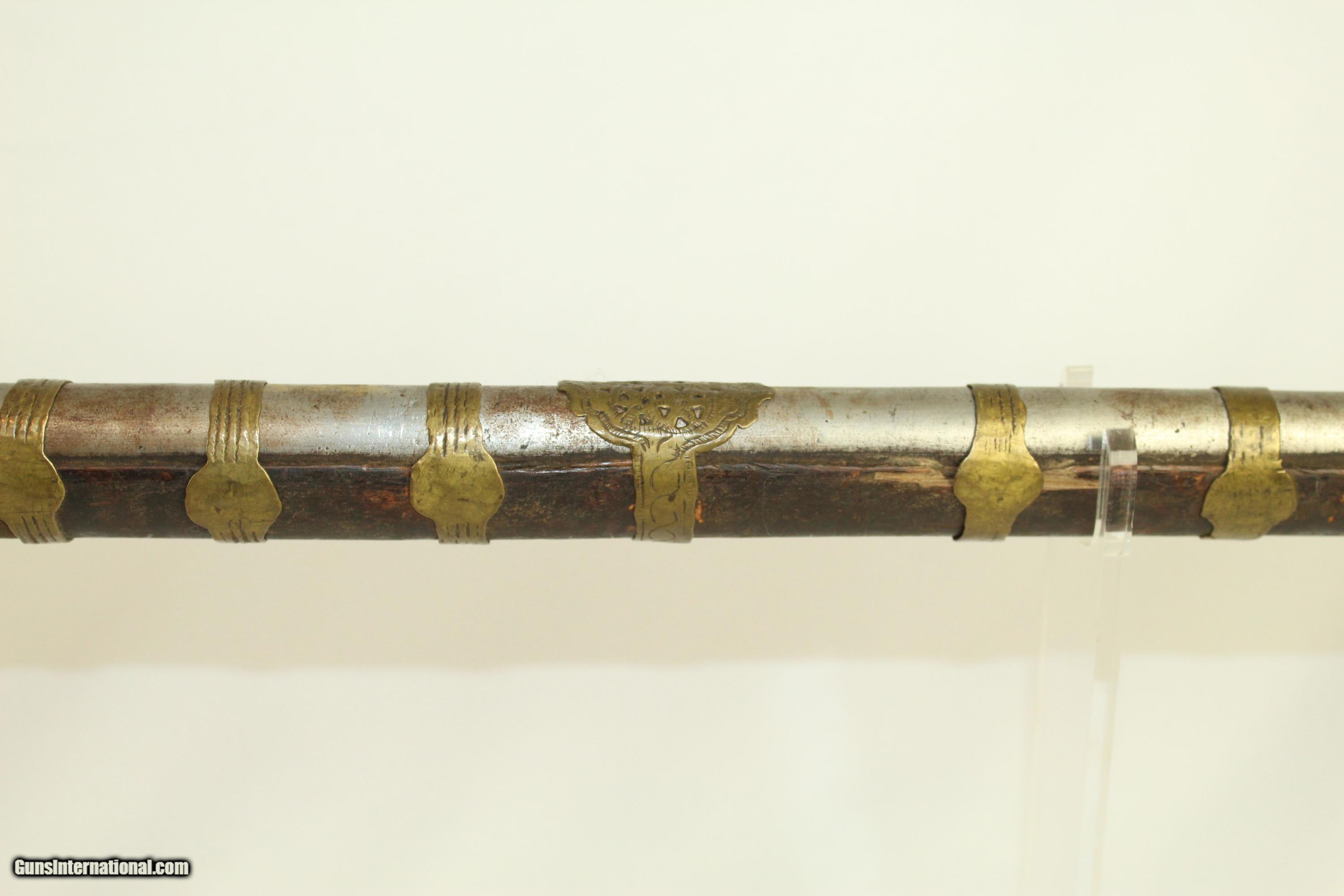 Description: Imperial British AFGHAN JEZAIL Flintlock Musket With Hand Engraved Brown Bess Lock & Long Barrel Here we present an antique Afghan Jezail Flintlock Musket with a British Brown Bess Lock, made circa 1800-1840s. Such weapons were used against the British in the Anglo-Afghan Wars by extremely capable Afghan warriors. As an officer described from the First Anglo-Afghan War: “Afghan snipers were expert marksmen and their juzzails fired roughened bullets, long iron nails or even pebbles over a range of some 250 metres. The Afghans could fling the large rifles across their shoulders as if they were feathers and spring nimbly from rock to rock.” The distinct shape of the stock and the length of the barrel is for convenience of shooting and loading from the back of an animal. One could lower the butt all the way to the ground and have easy access to the muzzle for loading. The 54-inch long barrel is fastened by 18 hammered barrel bands. The lock is hand engraved with a lion. The front sight is a small bead. The rear sight is a sturdy peep sight as is customary on the type. This example is in very good condition. The metal has a gray patina. The markings are clear. The stock shows quite a bit of wear, with a bit of slivering opposite the lock. The bore is smooth and untouched. The action is functional. Here is an extremely unique piece for your collection. Own the original! This is a legitimate antique and not a reproduction. Barrel is 54 inches in length. Caliber: .65 with a slight flare at the muzzle Overall condition as seen in photos. Very Fast. Very Safe. FREE SHIPPING WORLDWIDE. Delivered directly to your door by express mail! Guaranteed AUTHENTIC & Includes CERTIFICATE OF AUTHENTICITY. ancestryguns $1200 #10537 SOLD Antique: Yes |