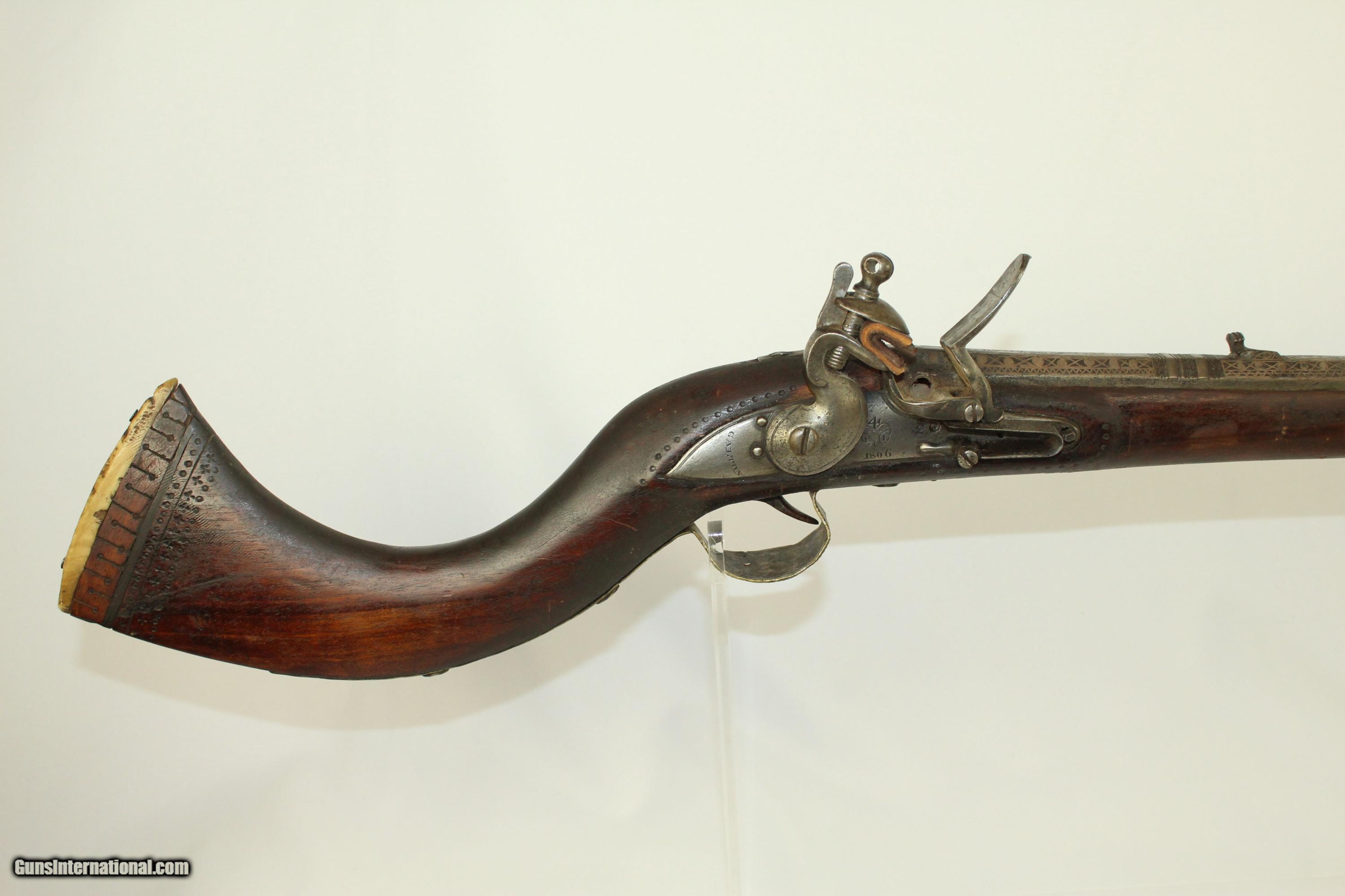 Description: Imperial British AFGHAN JEZAIL Flintlock Musket With East India Company Marked Brown Bess Lock Dated 1806 Here we present an antique Afghan Jezail Flintlock Musket with a British Brown Bess Lock, made circa 1806-1840s. Such weapons were used against the British in the Anglo-Afghan Wars by extremely capable Afghan warriors. As an officer described from the First Anglo-Afghan War: “Afghan snipers were expert marksmen and their juzzails fired roughened bullets, long iron nails or even pebbles over a range of some 250 metres. The Afghans could fling the large rifles across their shoulders as if they were feathers and spring nimbly from rock to rock.” The lock is marked “GALTON” as well as having the distinctive heart marking of the Honorable East India Company. It is dated 1806. Samuel Galton is a known maker of Brown Bess muskets, even of some that went to the colonies to fight the American Rebels. He was a member of a very interesting group known as the Lunar Society. The distinct shape of the stock and the length of the barrel is for convenience of shooting and loading from the back of an animal. One could lower the butt all the way to the ground and have easy access to the muzzle for loading. The barrel is significantly engraved and 49-1/2-inches long. The rear 1/3 and the front 1/5 of the barrel is engraved, as well as is the trigger guard. The butt is carved with an ivory segment on the very back. The front sight is a small blade. The rear sight is a stylish notch. This example is in very good condition. The metal has a gray patina. The markings and engraving are clear. The stock shows much use, and has a crack in front of the second barrel band. The bore is deeply rifled and untouched. The action is functional. Here is a beautiful and historical rifle, representing Britain’s influence in Afghanistan. Own the original! This is a legitimate antique and not a reproduction. Barrel is 49-1/2 inches in length. Caliber: .55 Overall condition as seen in photos. Very Fast. Very Safe. FREE SHIPPING WORLDWIDE. Delivered directly to your door by express mail! Guaranteed AUTHENTIC & Includes CERTIFICATE OF AUTHENTICITY. ancestryguns $1800 #10538 SOLD Antique: Yes |