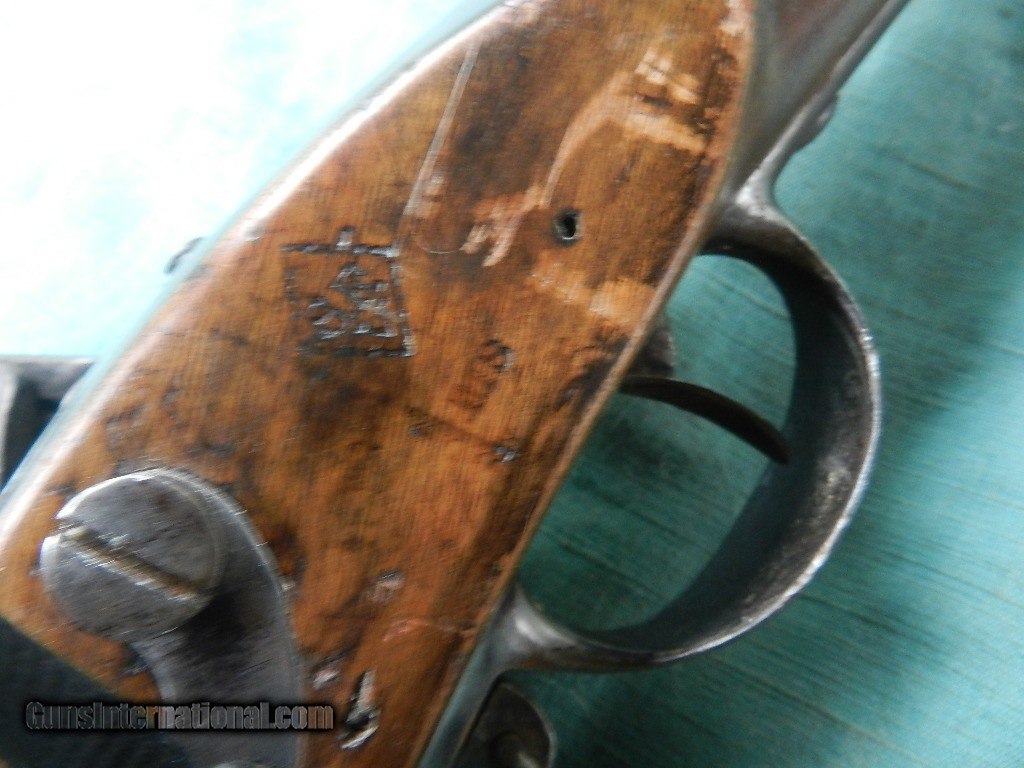 Description: SOLD Mass militia Marked contract musket with a 41/12" ong barrel of about .68 cal smooth bore with exterior metal as issued in the white with age staining but not rusted, looks like a Charlesville musket of the Rev.War with brass pan, and trumpet ram-rod. The action works well, and the front muzzle barrel band has a brass front blade sight, Overall it measures about almost 56:" long, and the stock is in very good condition and appears to be French Walnut? The flat on the side of the lock screws has a MS and a diamlond shaped proof of SF not anything I can identify. Often parts from differnt muskets left over from contracts were assembled by armories or gun makers and sold a militia muskets to the U.S. during and right after the Rev. War. The action works well, and there are no proofs on the barrel if a Eurpoean gun was exported out of Europe. Overal a clean unusual musket of early 1800's.When buying a gun always have it examined by a competent gunsmith before shooting. To buy a gun from me you must get a direct email for me, with details, and shipping cost. We don’t have a web site .I prefer money orders or a check. Item ships when funds come in. I try to keep guns affordable, which means I make less money than most dealers. You won’t get altitude sickness, or nose bleed, with my prices! I consistently have the best selection of older guns If you attempt to buy, you must still contact us for details . Best to email to buy. Sometimes a local person can stop buy and purchase before the gun is removed. Sometimes not home to get calls. Some guns are required shipment to a gun dealer near you for a transfer to you when it arrives. Otherwise many older or black powder guns ship to your door. With the widest selection of older guns at great prices, We don’t have a store, and sell on the internet only. I’m easy to get along with. Thank You SOLD Antique: Yes |