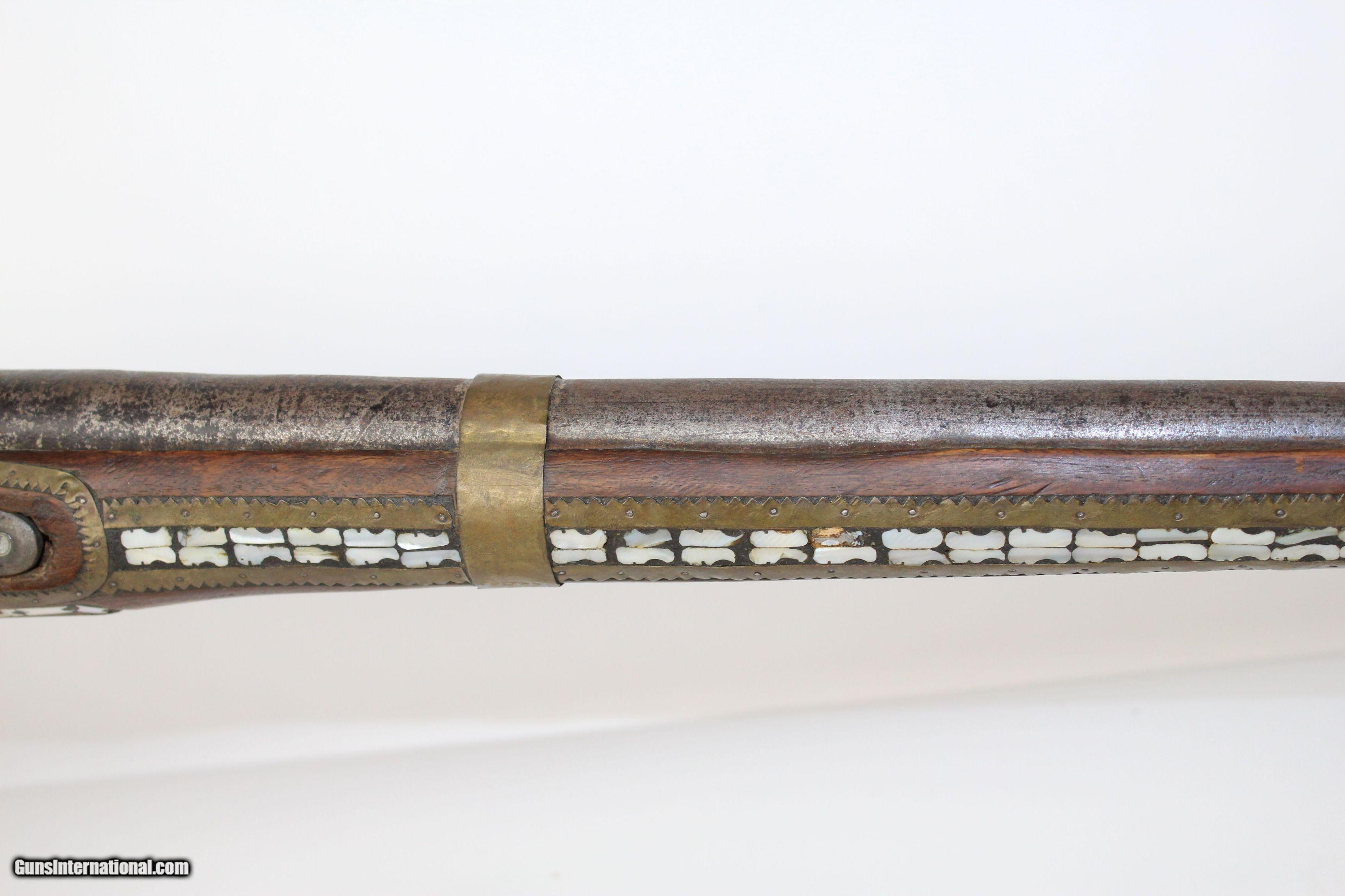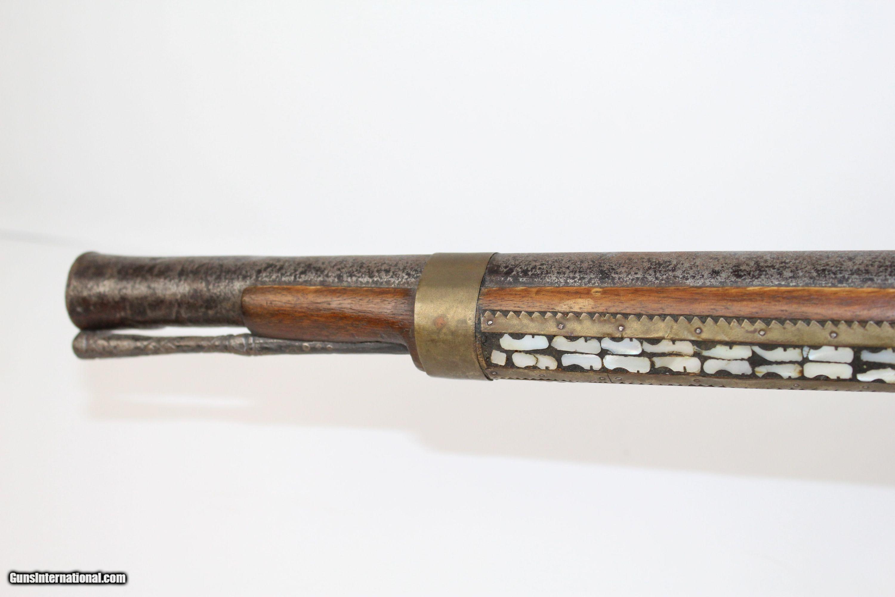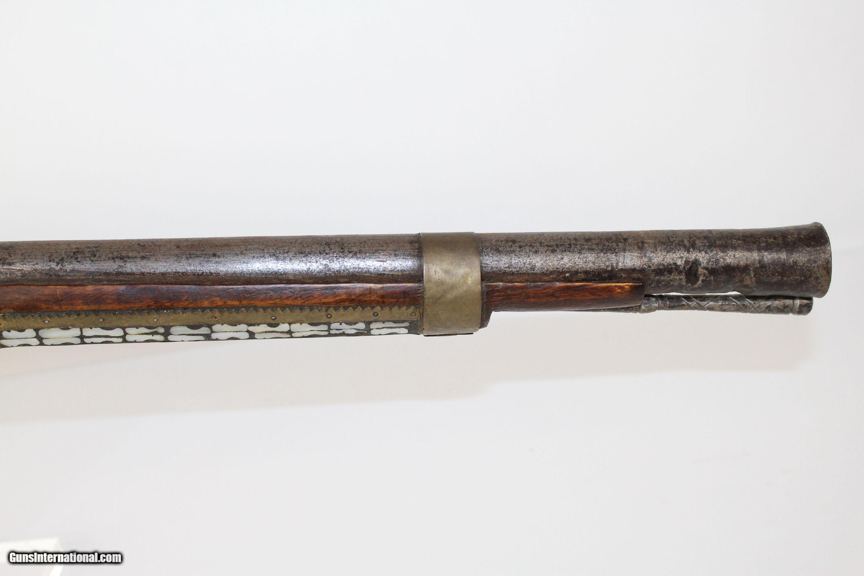 Description: ORNATE Antique AFGHAN JEZAIL Anglo-Afghan War Musket Inlaid with Mother of Pearl Here we present an antique Afghan Jezail Flintlock Musket, made circa the early 1800s. The jezail is a very uniquely stocked weapon. The curved club stock is speculated as being a way to carry and fire the weapon from the back of a moving horse or camel. Many of these were made by salvaging British muskets’ locks and barrels during the Anglo-Afghan War. The remnant of a British lion is visible on this lock. Some of these are quite beautifully adorned like this one with mother of pearl inlays. To quote the book Tools of war: History of Weapons in Early Modern Times: “Afghan snipers were expert marksmen and their juzzails fired roughened bullets, long iron nails or even pebbles over a range of some 250 metres. The Afghans could fling the large rifles across their shoulders as if they were feathers and spring nimbly from rock to rock. The loved to decorate their rifles”. The overall condition is fair. The metal surfaces have a dark patina. The mother of pearl inlay is about 95% intact. The bore is rough and dusty. The action is still functional. Though this piece is past its days of fighting Imperialists, it will still represent its country well two centuries later. Own the original! This is a legitimate antique and not a reproduction. Barrel is 34-1/4 inches. Caliber: .69 Overall condition as seen in photos. Very Fast. Very Safe. FREE SHIPPING WORLDWIDE. Delivered directly to your door by express mail! Guaranteed AUTHENTIC & Includes CERTIFICATE OF AUTHENTICITY. ancestryguns $1300 #5410 SOLD Antique: Yes |