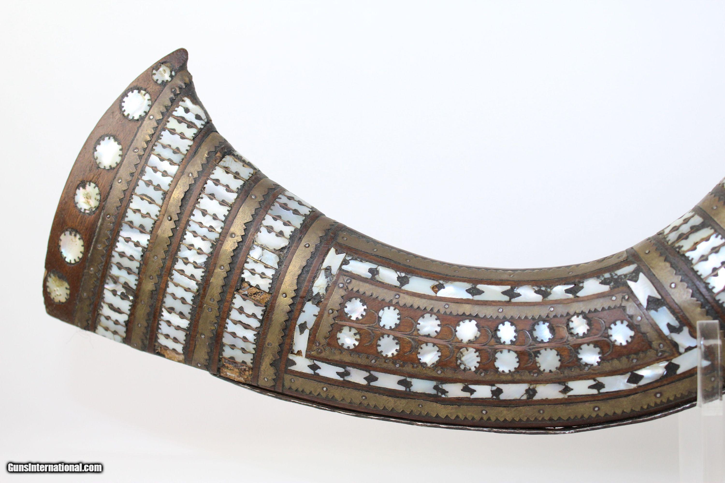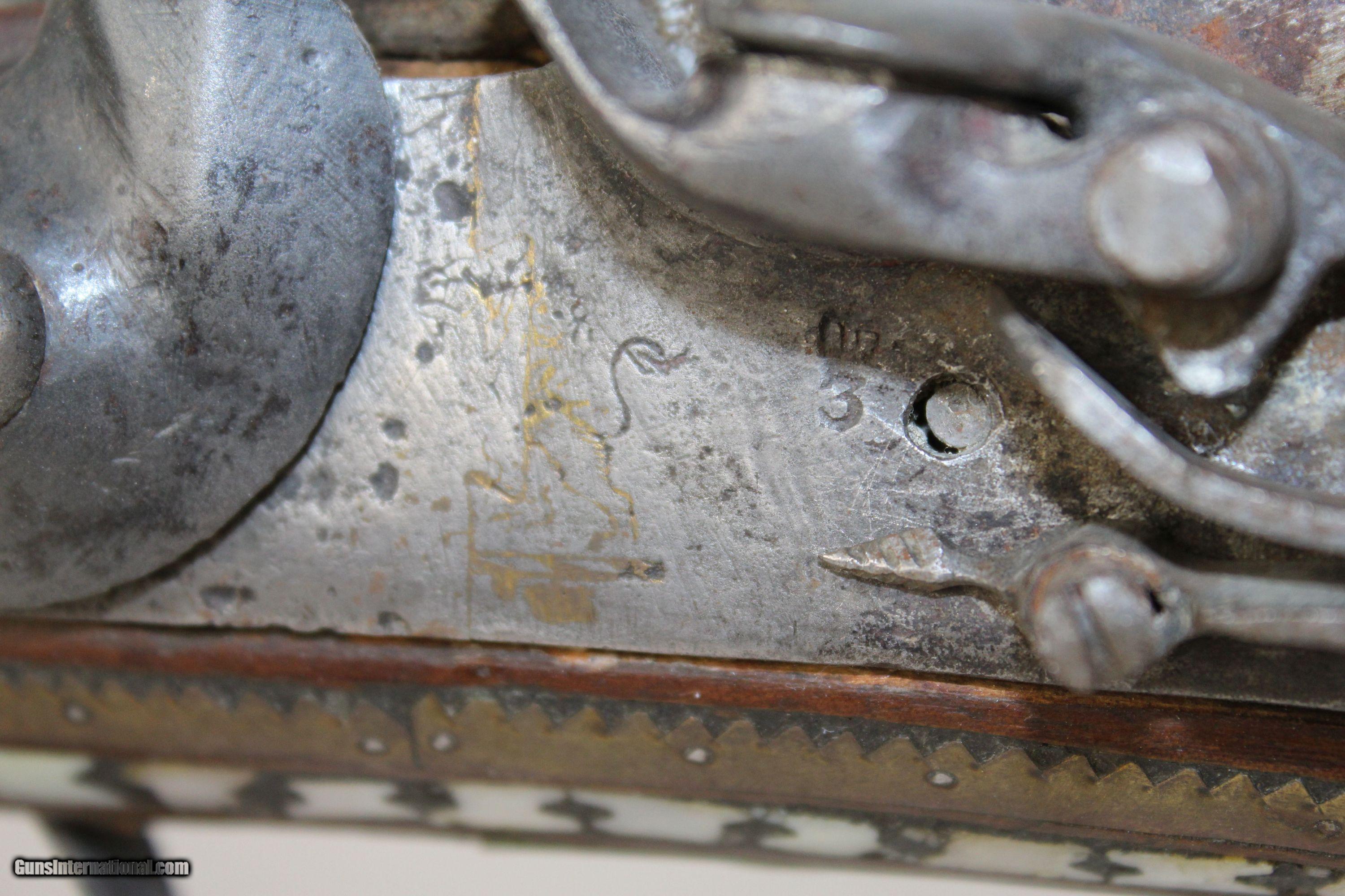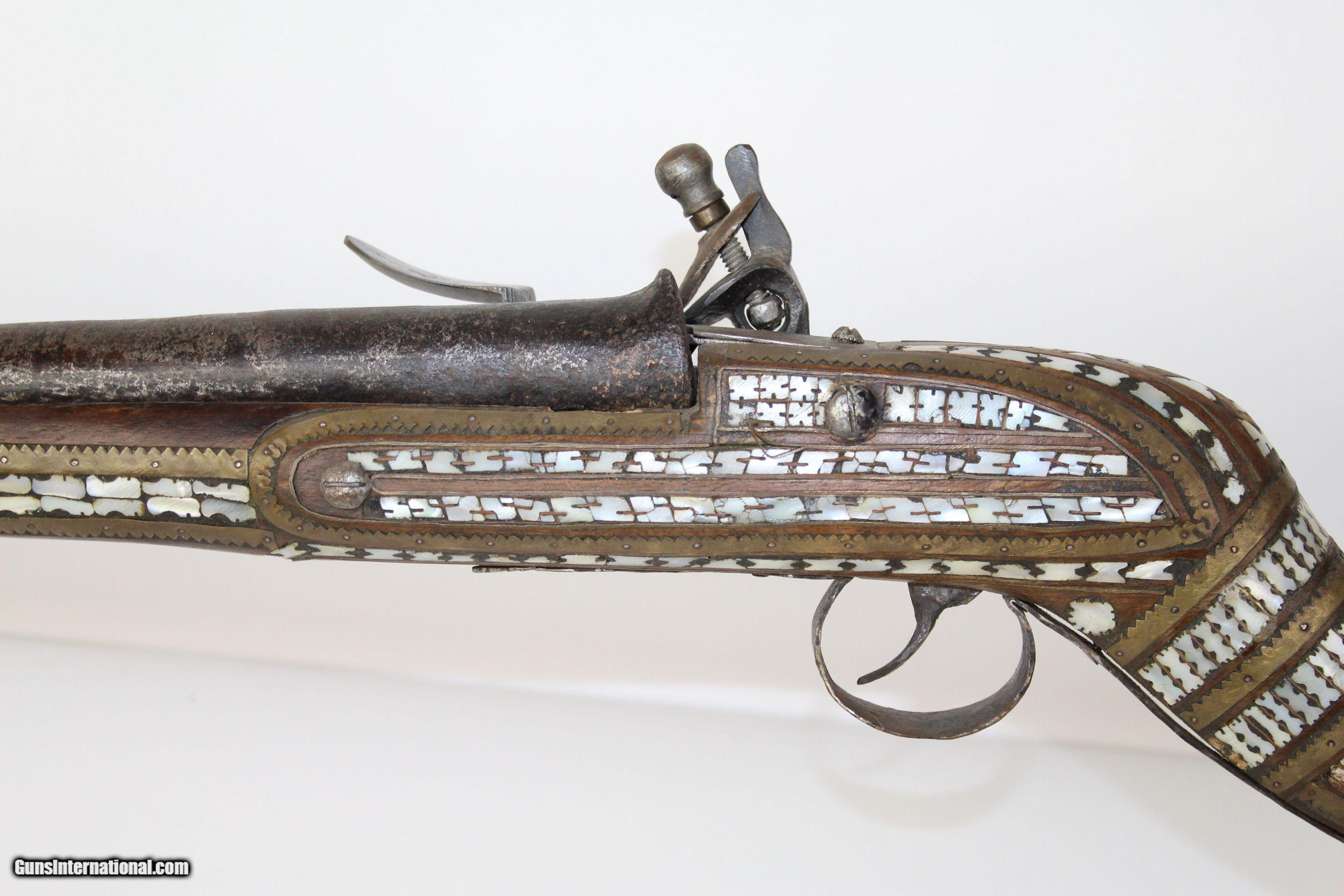 Description: ORNATE Antique AFGHAN JEZAIL Anglo-Afghan War Musket Inlaid with Mother of Pearl Here we present an antique Afghan Jezail Flintlock Musket, made circa the early 1800s. The jezail is a very uniquely stocked weapon. The curved club stock is speculated as being a way to carry and fire the weapon from the back of a moving horse or camel. Many of these were made by salvaging British muskets’ locks and barrels during the Anglo-Afghan War. The remnant of a British lion is visible on this lock. Some of these are quite beautifully adorned like this one with mother of pearl inlays. To quote the book Tools of war: History of Weapons in Early Modern Times: “Afghan snipers were expert marksmen and their juzzails fired roughened bullets, long iron nails or even pebbles over a range of some 250 metres. The Afghans could fling the large rifles across their shoulders as if they were feathers and spring nimbly from rock to rock. The loved to decorate their rifles”. The overall condition is fair. The metal surfaces have a dark patina. The mother of pearl inlay is about 95% intact. The bore is rough and dusty. The action is still functional. Though this piece is past its days of fighting Imperialists, it will still represent its country well two centuries later. Own the original! This is a legitimate antique and not a reproduction. Barrel is 34-1/4 inches. Caliber: .69 Overall condition as seen in photos. Very Fast. Very Safe. FREE SHIPPING WORLDWIDE. Delivered directly to your door by express mail! Guaranteed AUTHENTIC & Includes CERTIFICATE OF AUTHENTICITY. ancestryguns $1300 #5410 SOLD Antique: Yes |