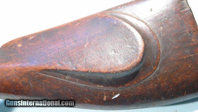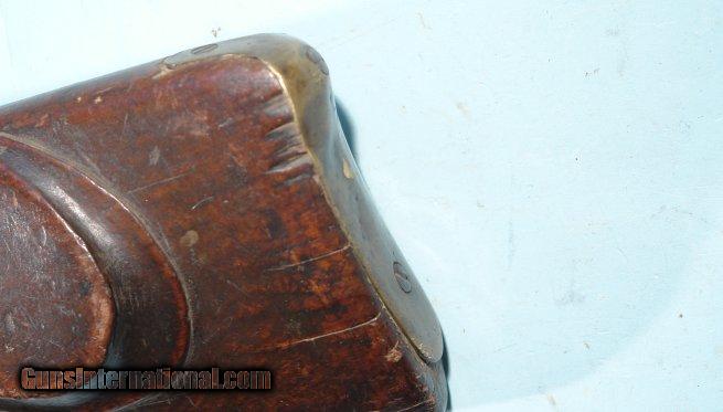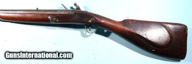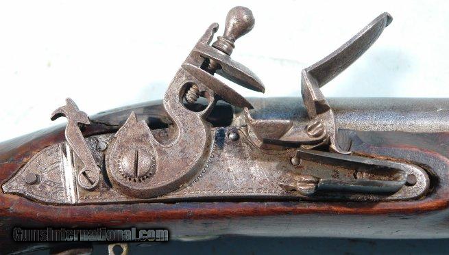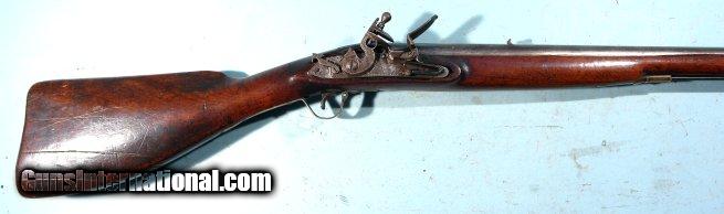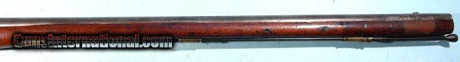 Description: RARE NEW ENGLAND 18TH CENTURY CLUB-BUTT DOGLOCK MUSKET. 57” o/a with 39” round smoothbore .75 caliber barrel having Birmingham proofs at the left breech. Front and rear barrel sights added in the American manner. Walnut full length stock with pronounced club-butt stock in the New England manner. Handmade brass trigger guard and mounts in the English style but of American manufacture. Under size butt plate from an early musket added during the period of use. Unmarked flint dog catch lock with light border decoration original to the period or possibly earlier but of Continental origin. This appears to have been recycled for use on this musket locks being a premium item in America in the 1700’s. Very good overall with lock in working order and stock with the original finish. SOLD Antique: Yes |